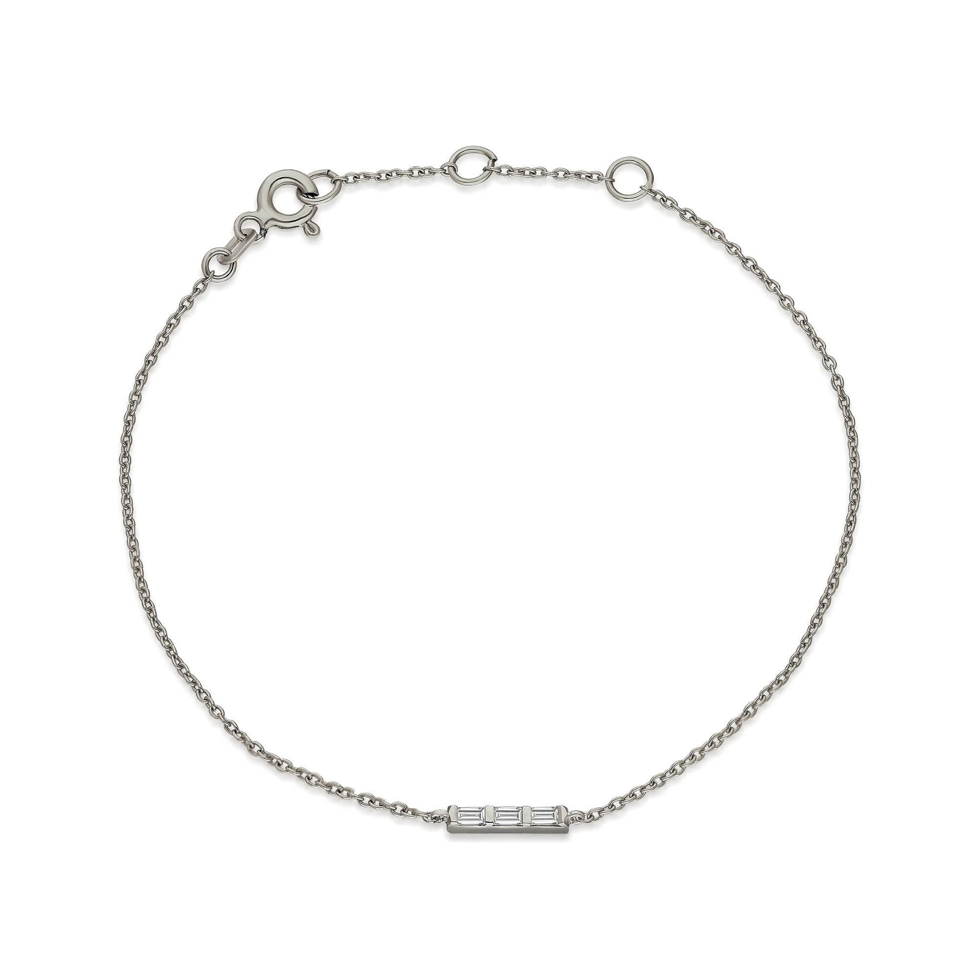 This 14k gold baguette diamond bar bracelet is perfect for layering or to gift someone special.