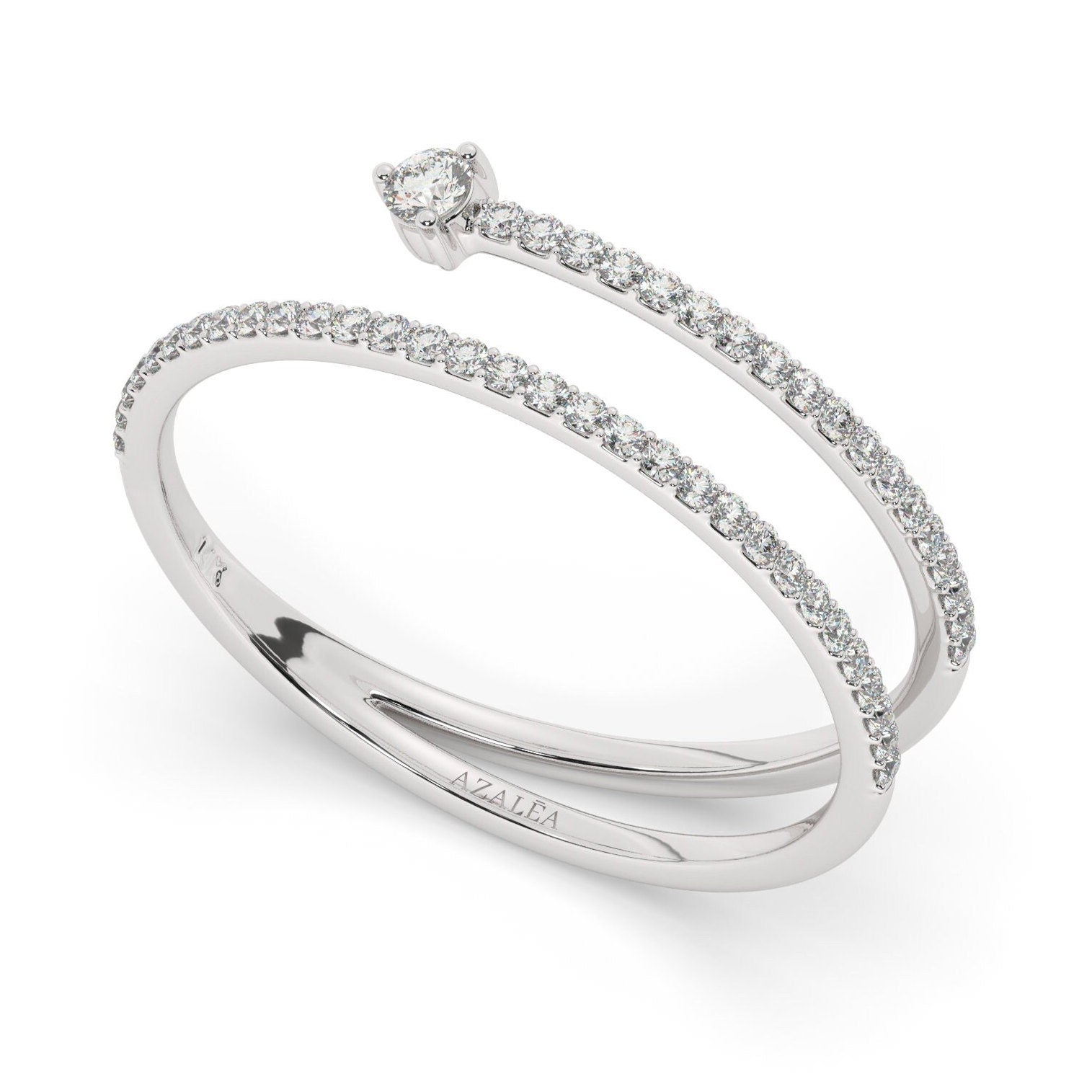 This 14k gold spiral diamond stacking ring has micro diamonds along a unique spiral design band. Use as a standalone piece or with stacking rings.