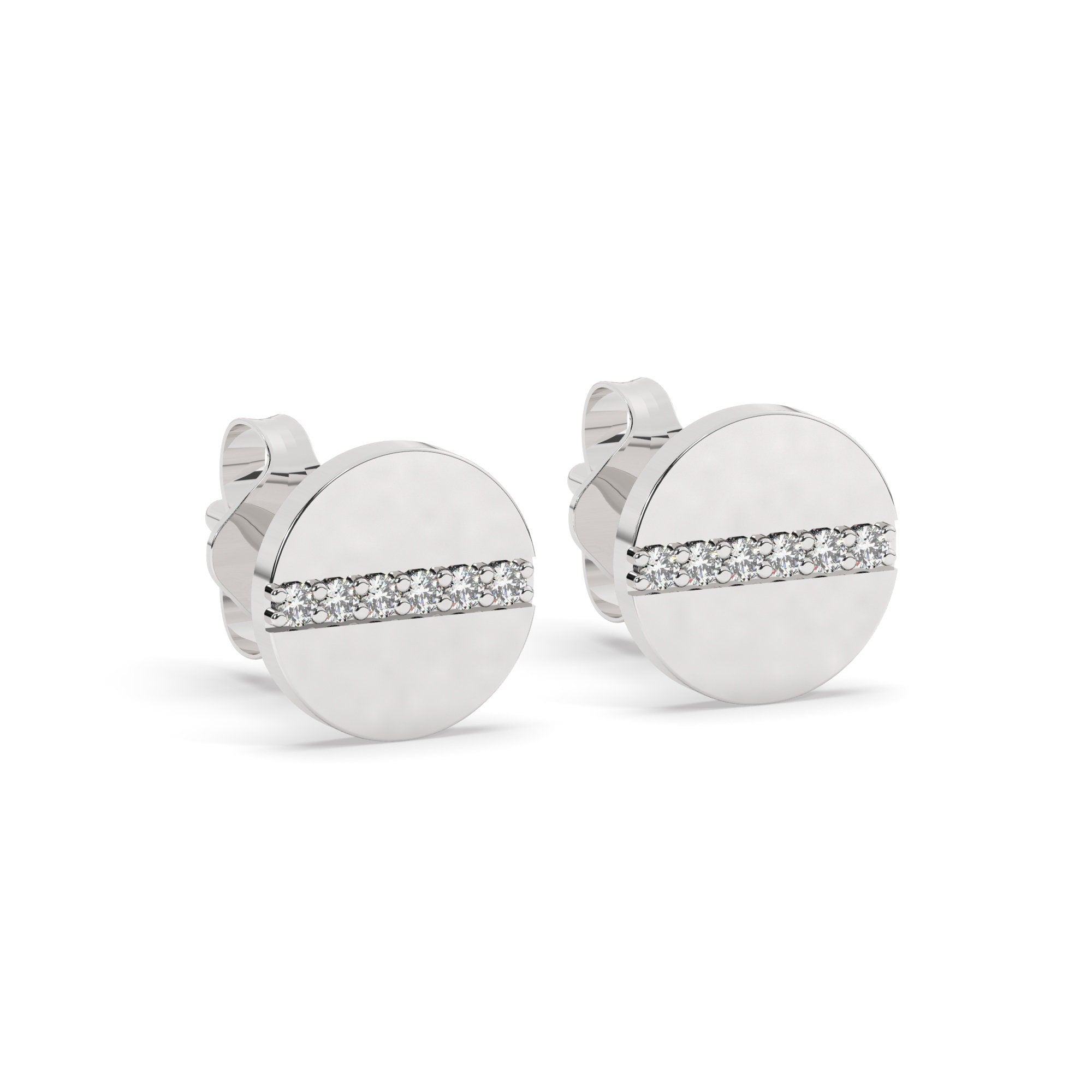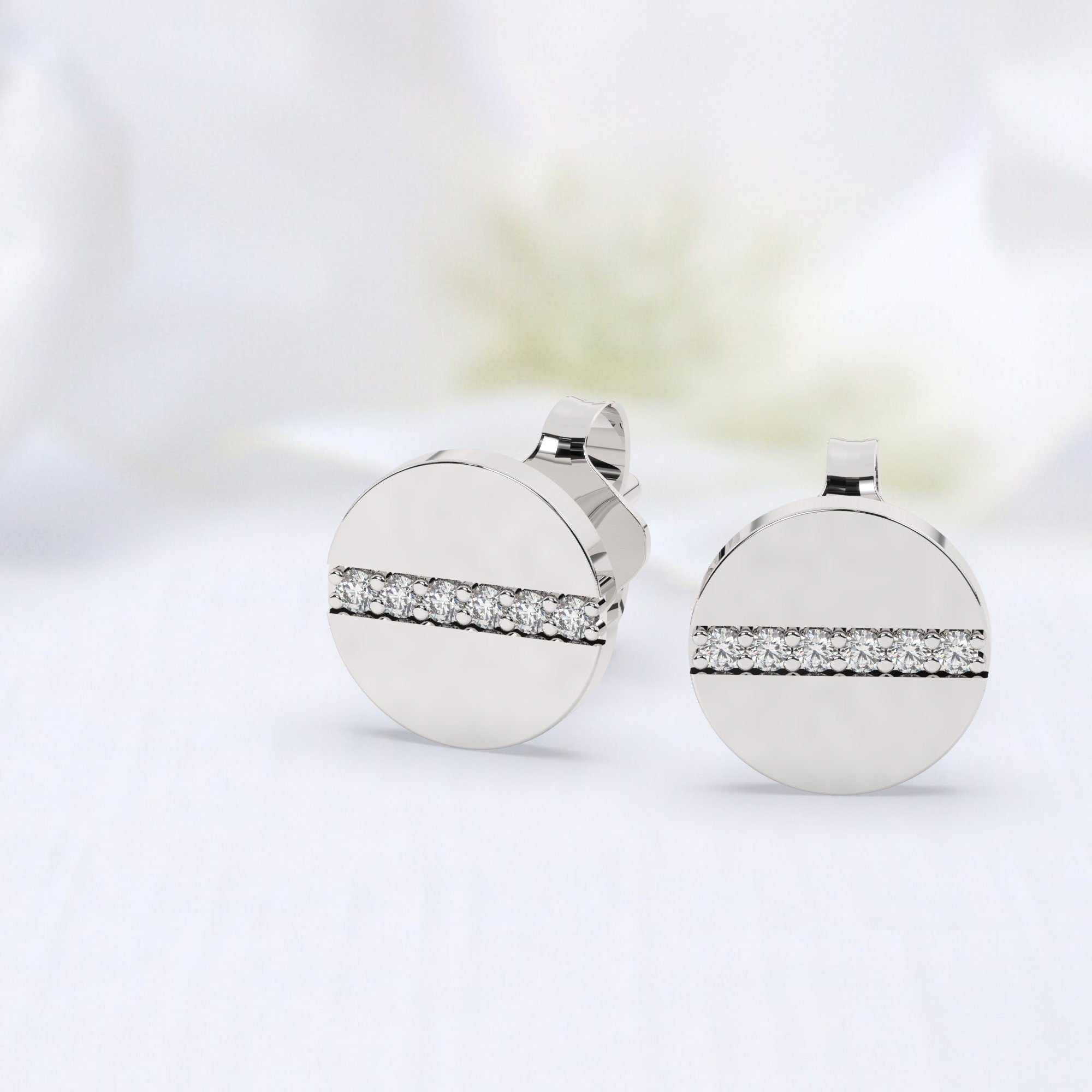 Diamond Bar Disc Stud Earrings feature a sleek, minimalist design with a small, polished disc set with six 1 mm diamonds, offering a touch of sparkle. The diamonds are carefully arranged to enhance the elegant bar shape, making these earrings a perfect balance of modern sophistication and subtle luxury. Ideal for daily wear or adding a refined accent to any outfit