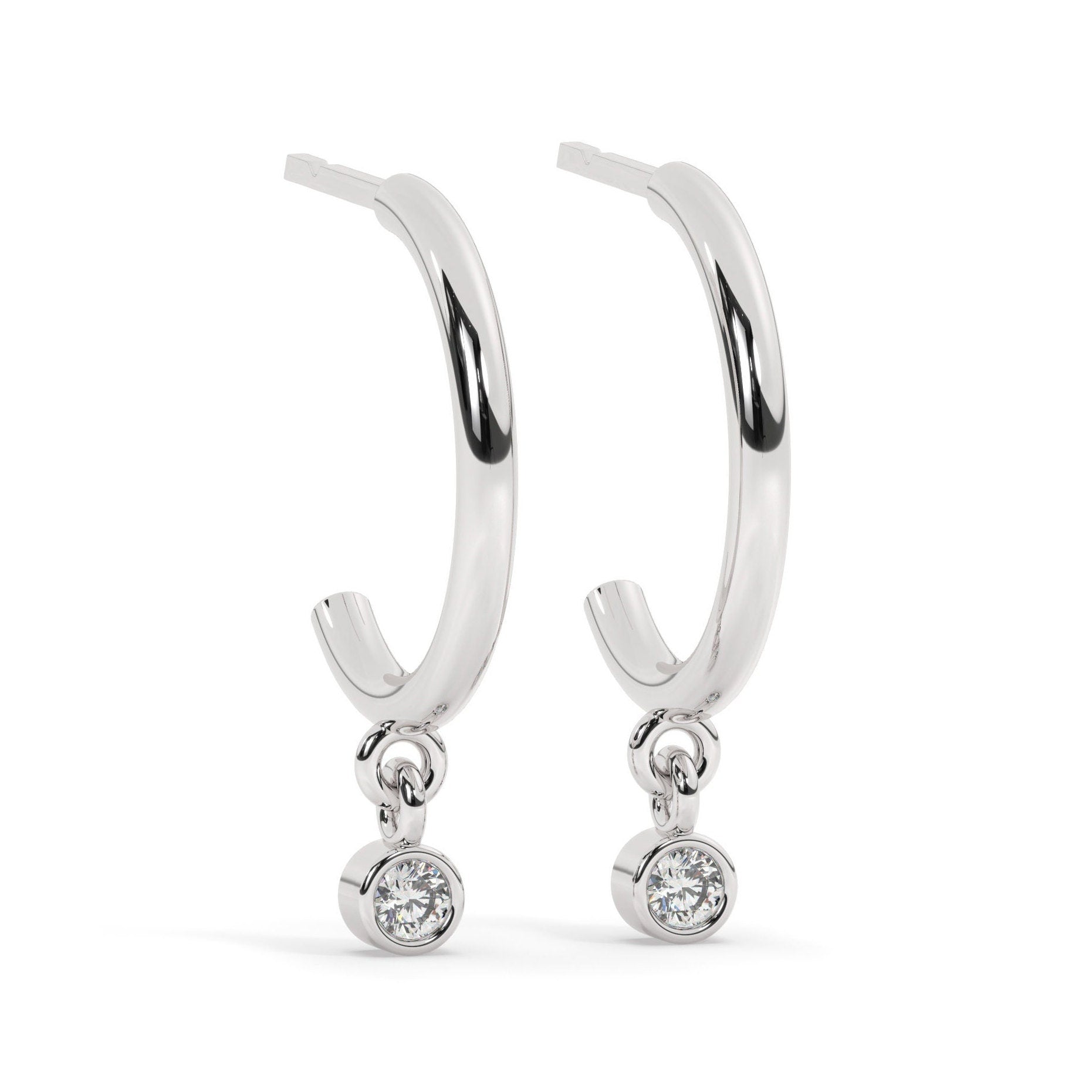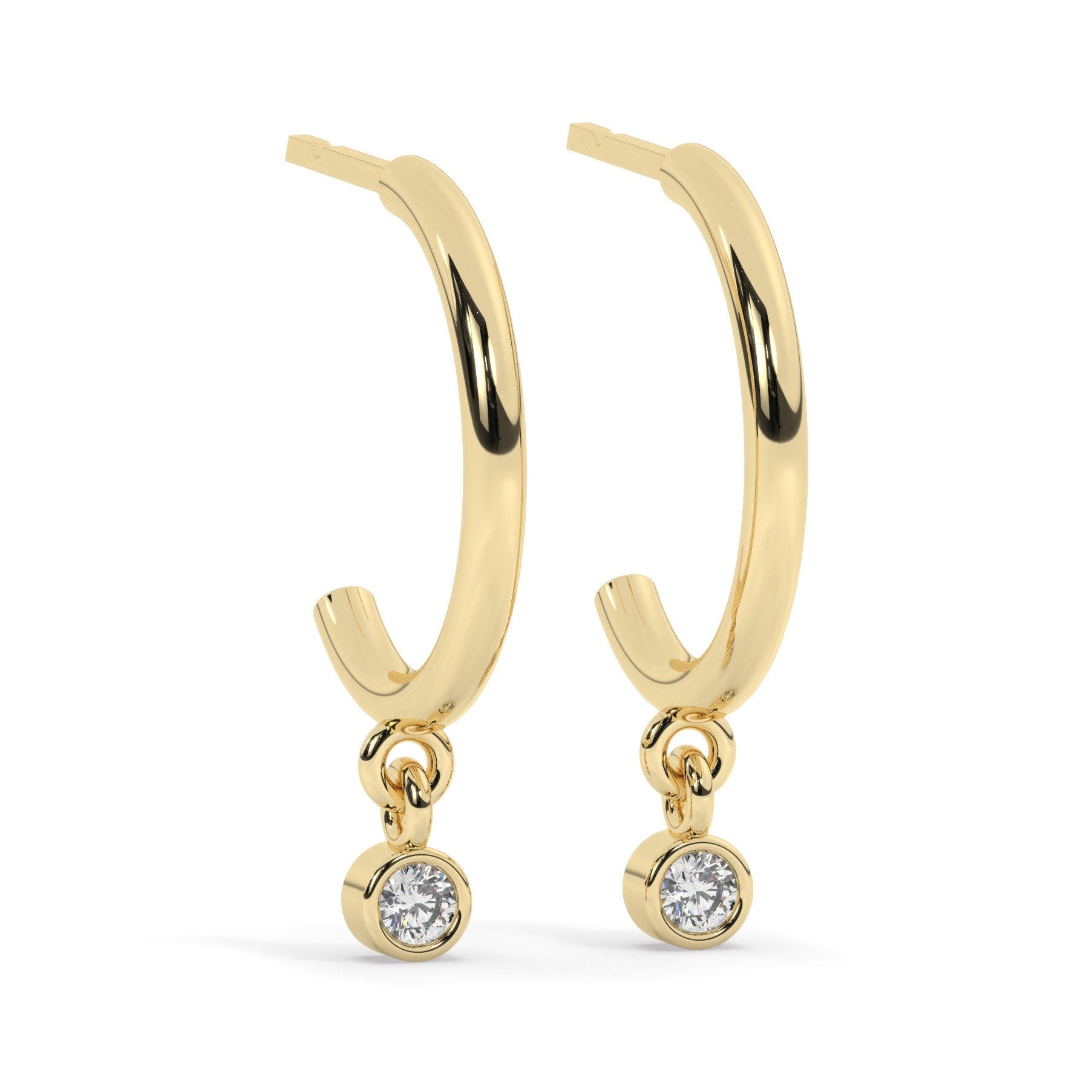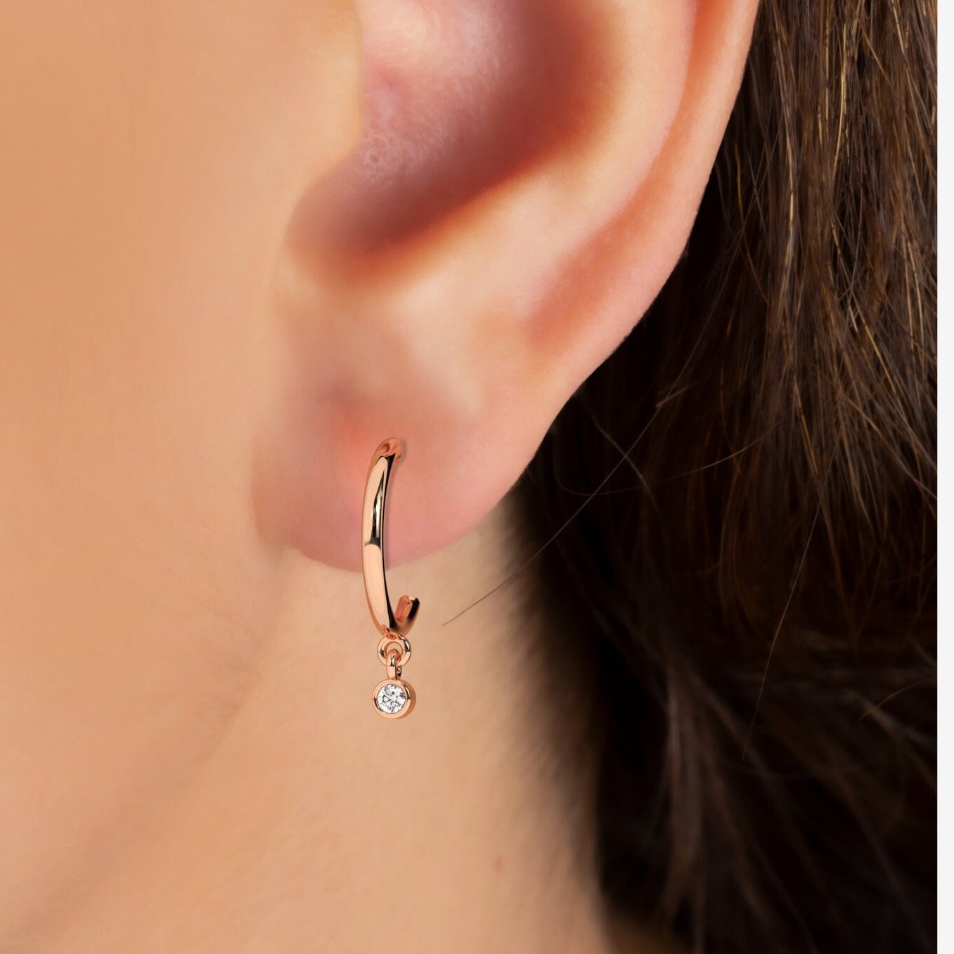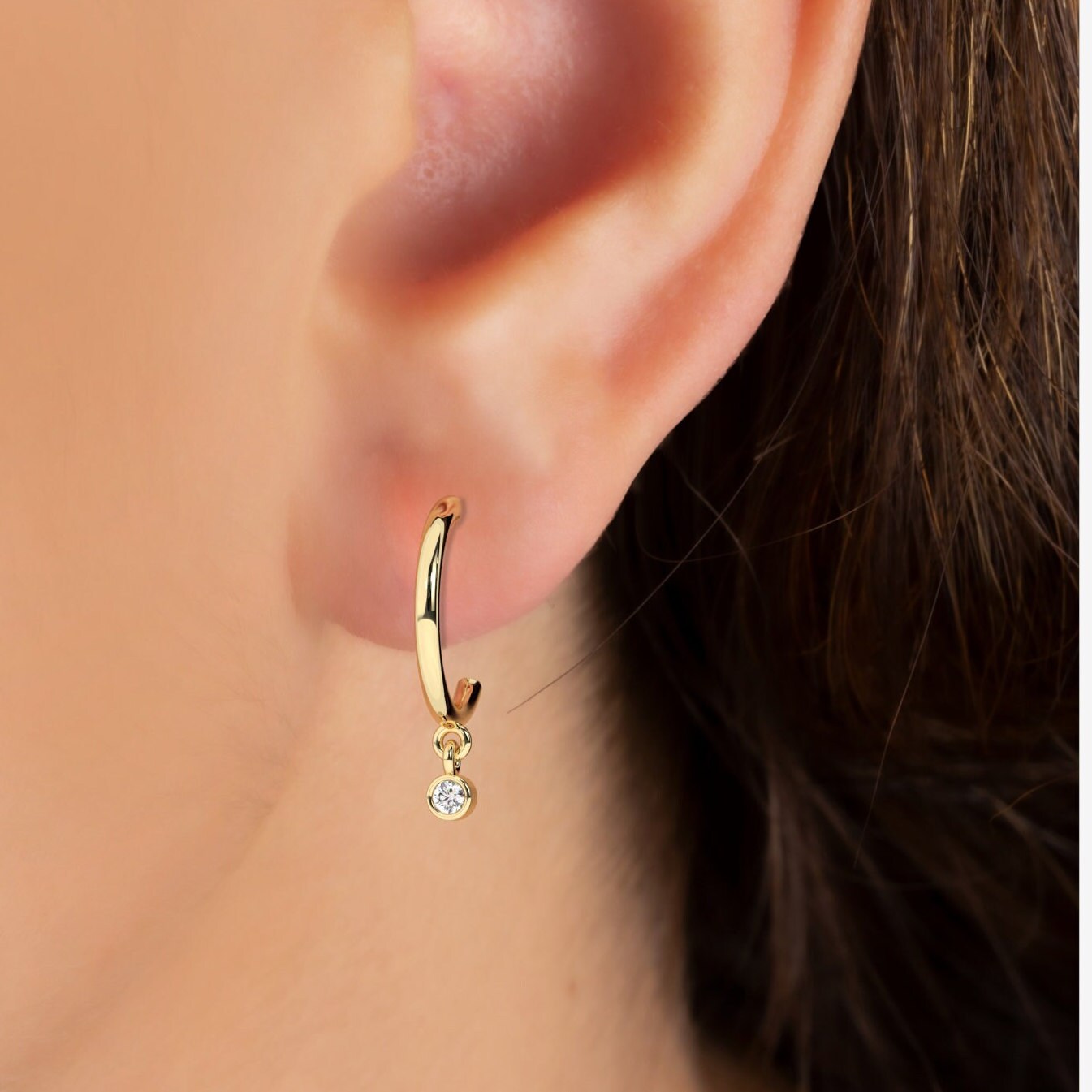 These gorgeous 14k gold hoops have a bezel-set dangling diamond. Great for every day wear or out on the town. A great gift for yourself or a loved one.