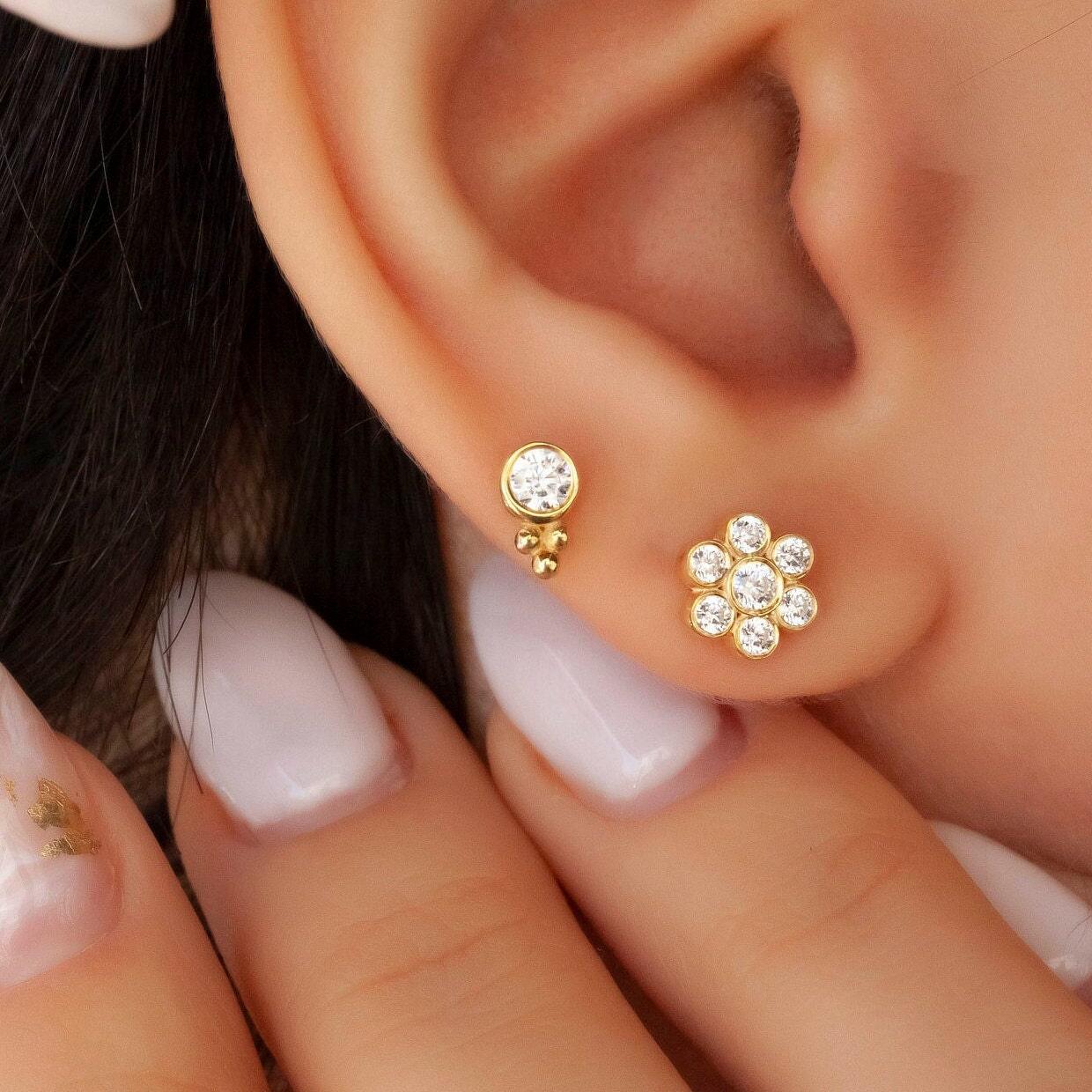 Diamond Studs / 14k Gold Diamond Trio Stud Earrings / Anniversary Gift / Birthday Gift / Graduation Gift / Bridal Gift / Diamond Gift Ideas