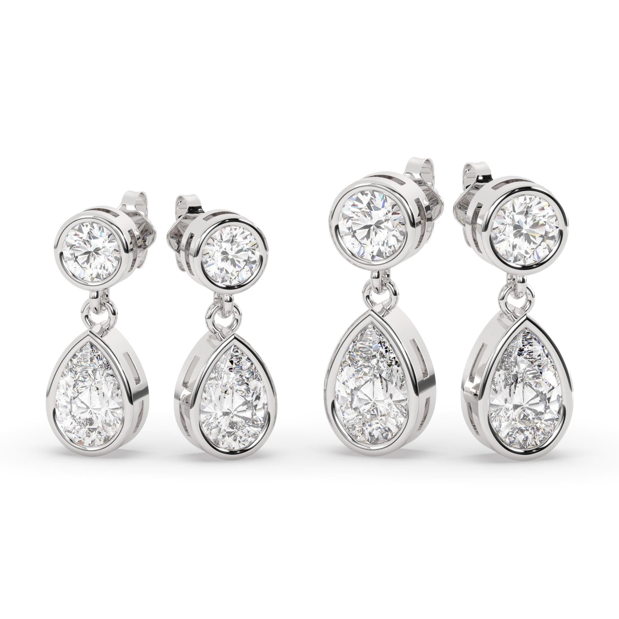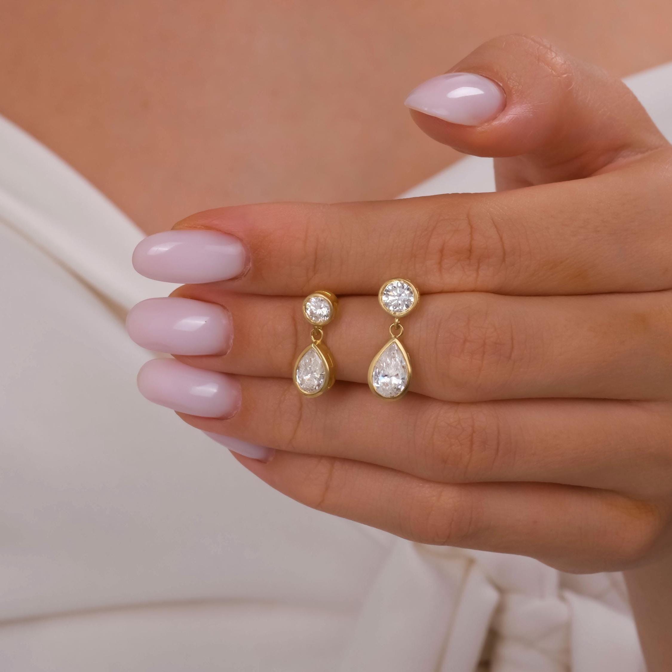 Round and Pear Shape Bezel Set Diamond Dangling Earrings / 14k Gold Diamond Earrings / IGI Certified Lab Diamond Earrings