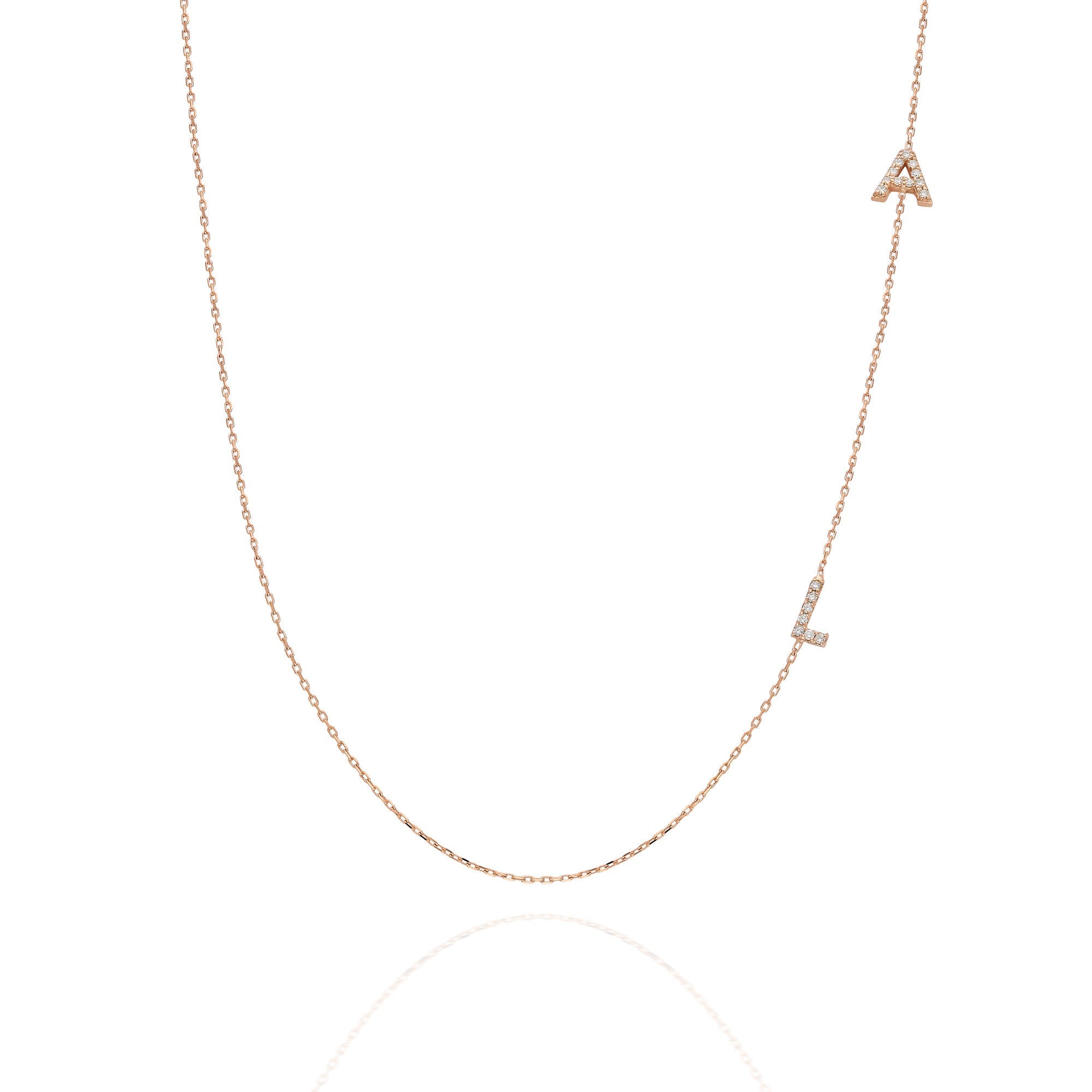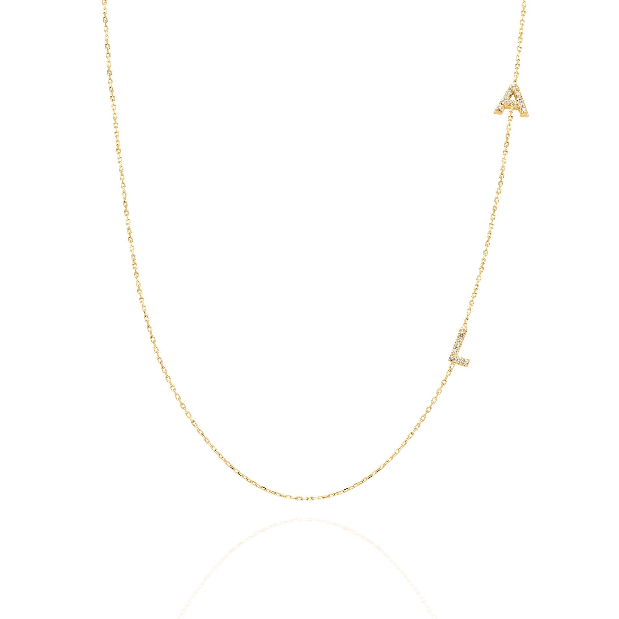 This diamond initial necklace comes with 2 to 7 spaced pave diamond initials. You can order it in 14k solid gold or in sterling silver with diamonds. Perfect for layering or to gift someone special.