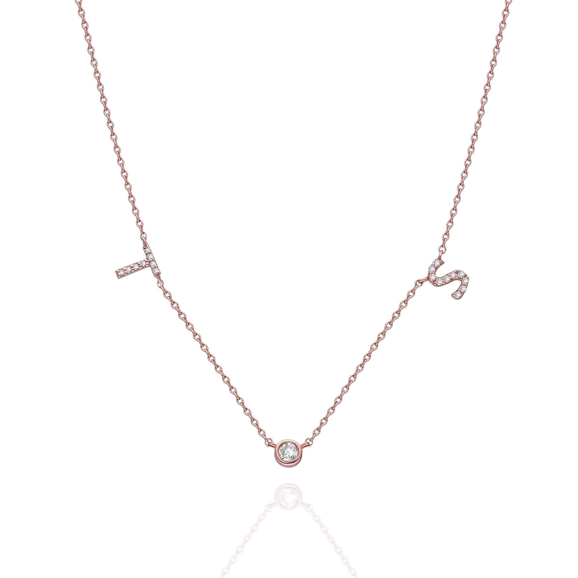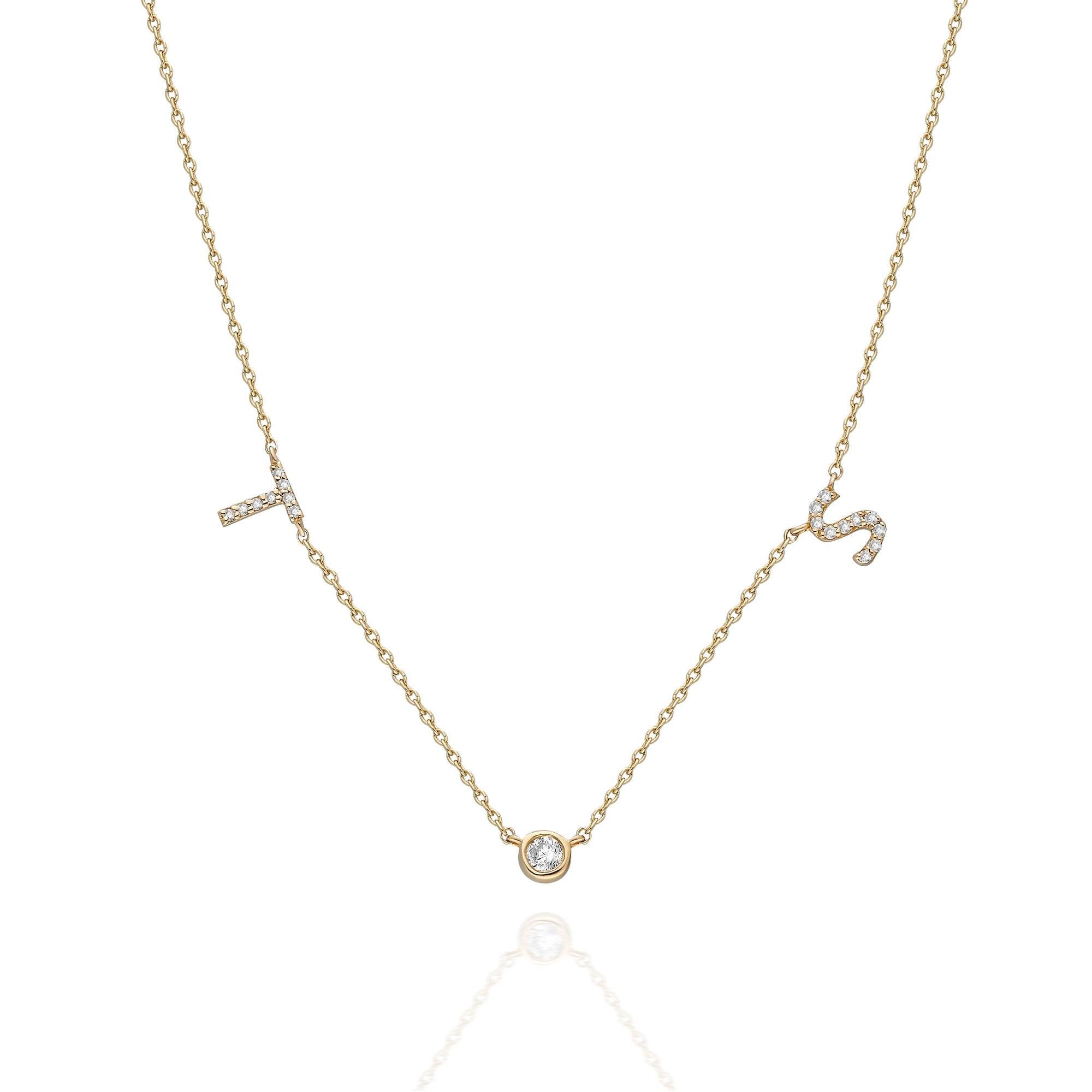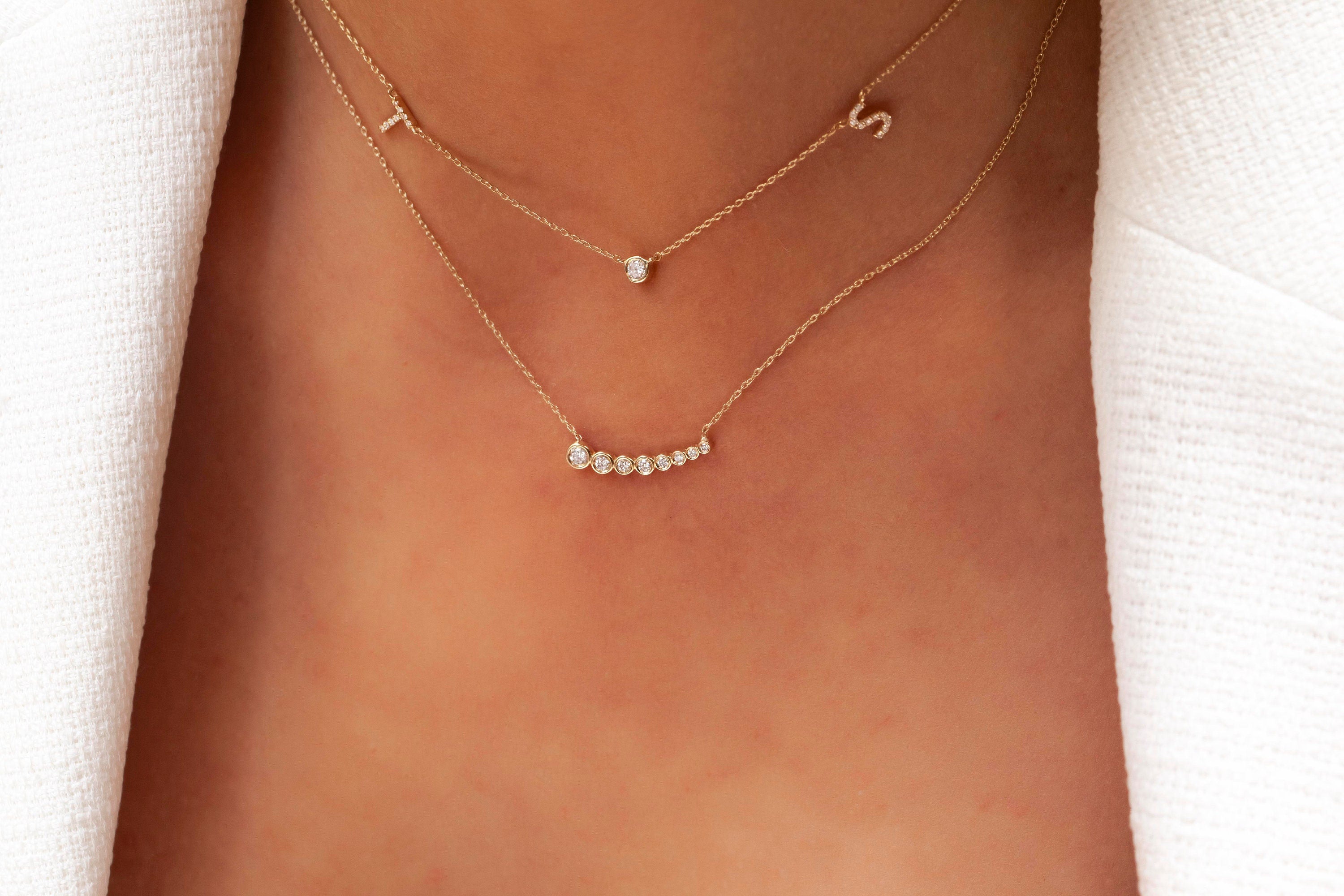This 14k gold diamond initial diamond necklace comes with a single bezel diamond and 2 diamond initial. Perfect for layering or to gift someone special.