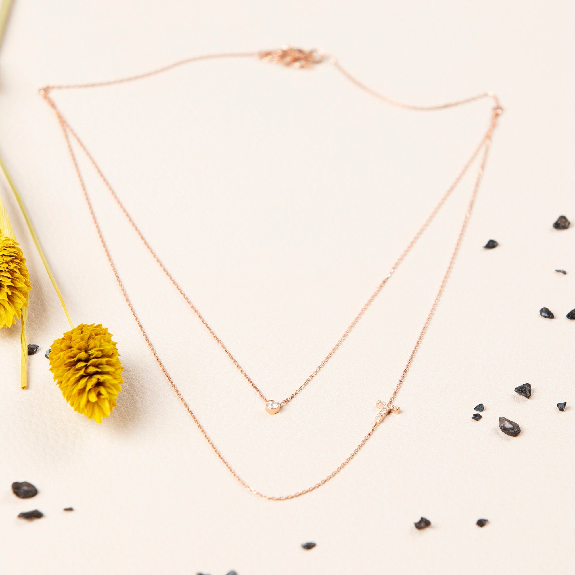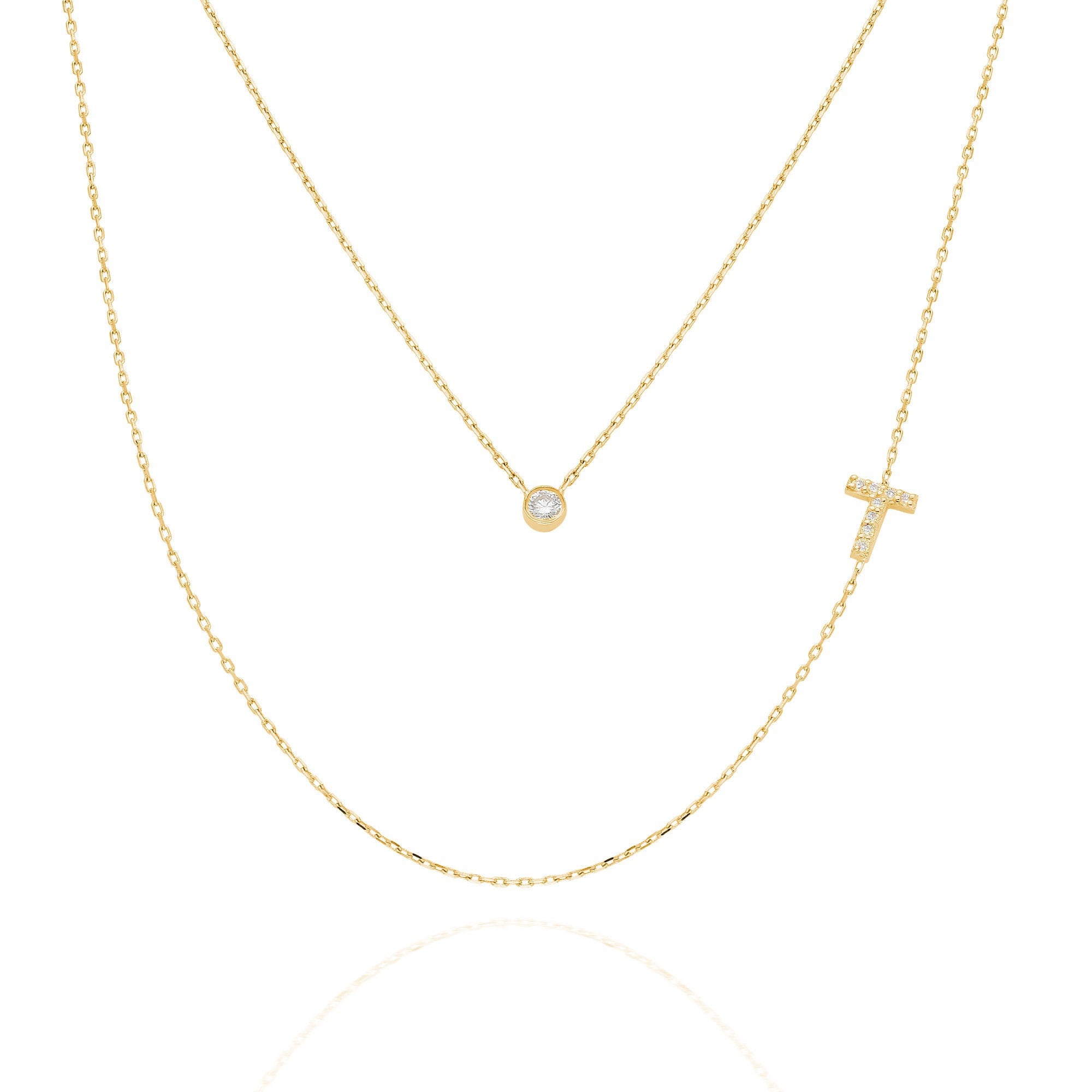 This 14k gold 2 strand layered initial necklace comes with a solid gold bezel diamond initial charm that hangs below 1 initial. Perfect for layering or to gift someone special.