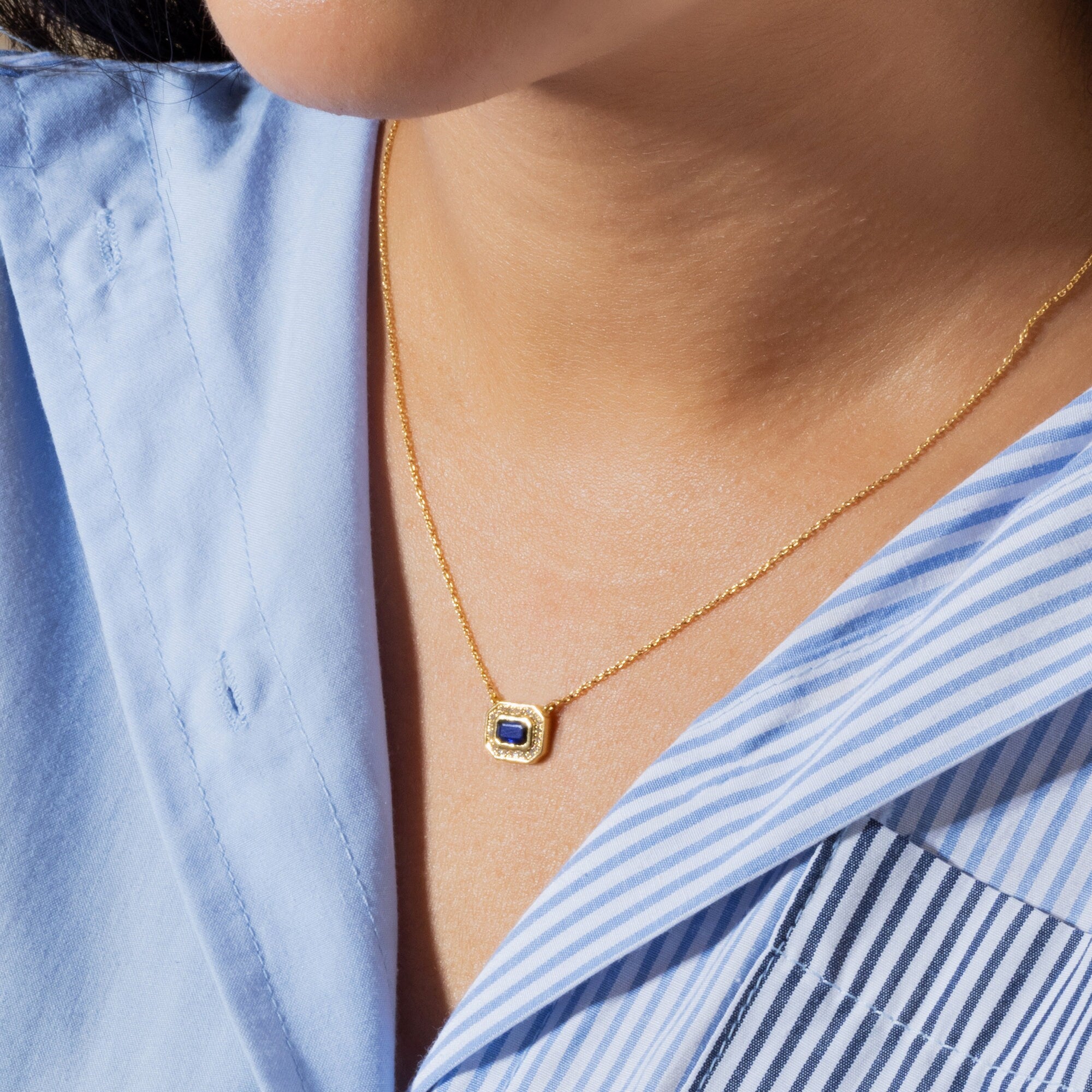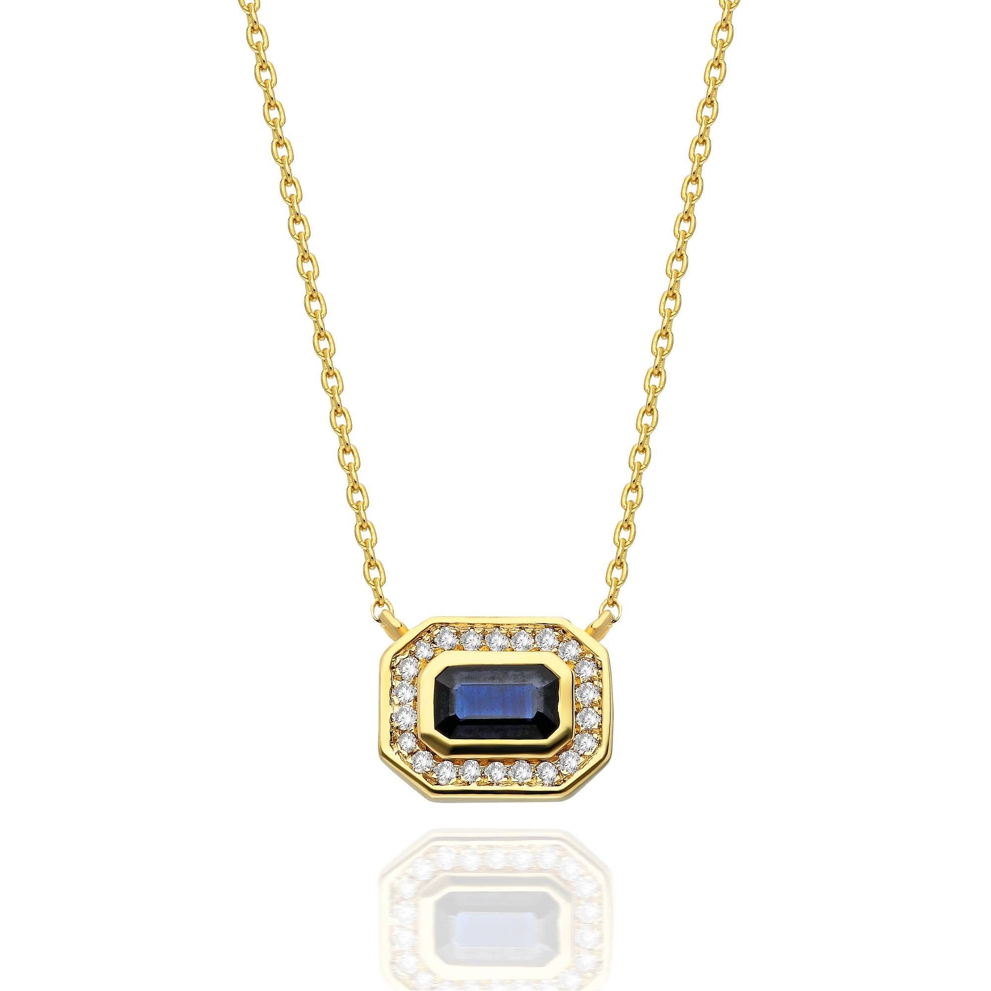 This 14K gold art deco style sapphire and diamond necklace is perfect for both everyday wearing and special occasions.