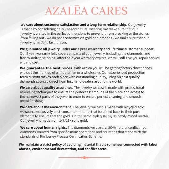 Azalea Fine Jewelry are a team of customer-focused individuals dedicated to handcrafting every order with excitement and love! We know this isn’t about us, but all about you. Thank you so much for allowing us to be a part of your special moment!