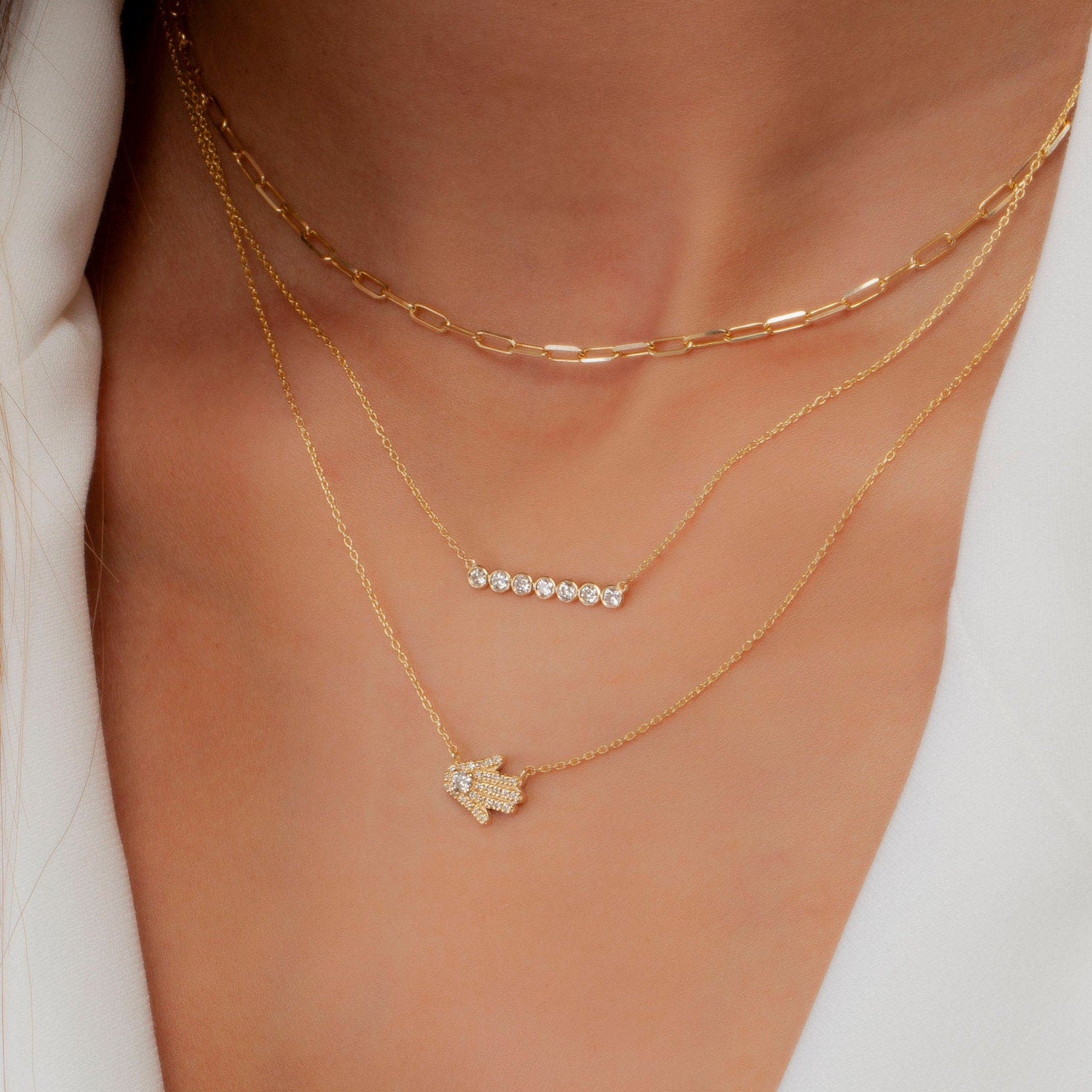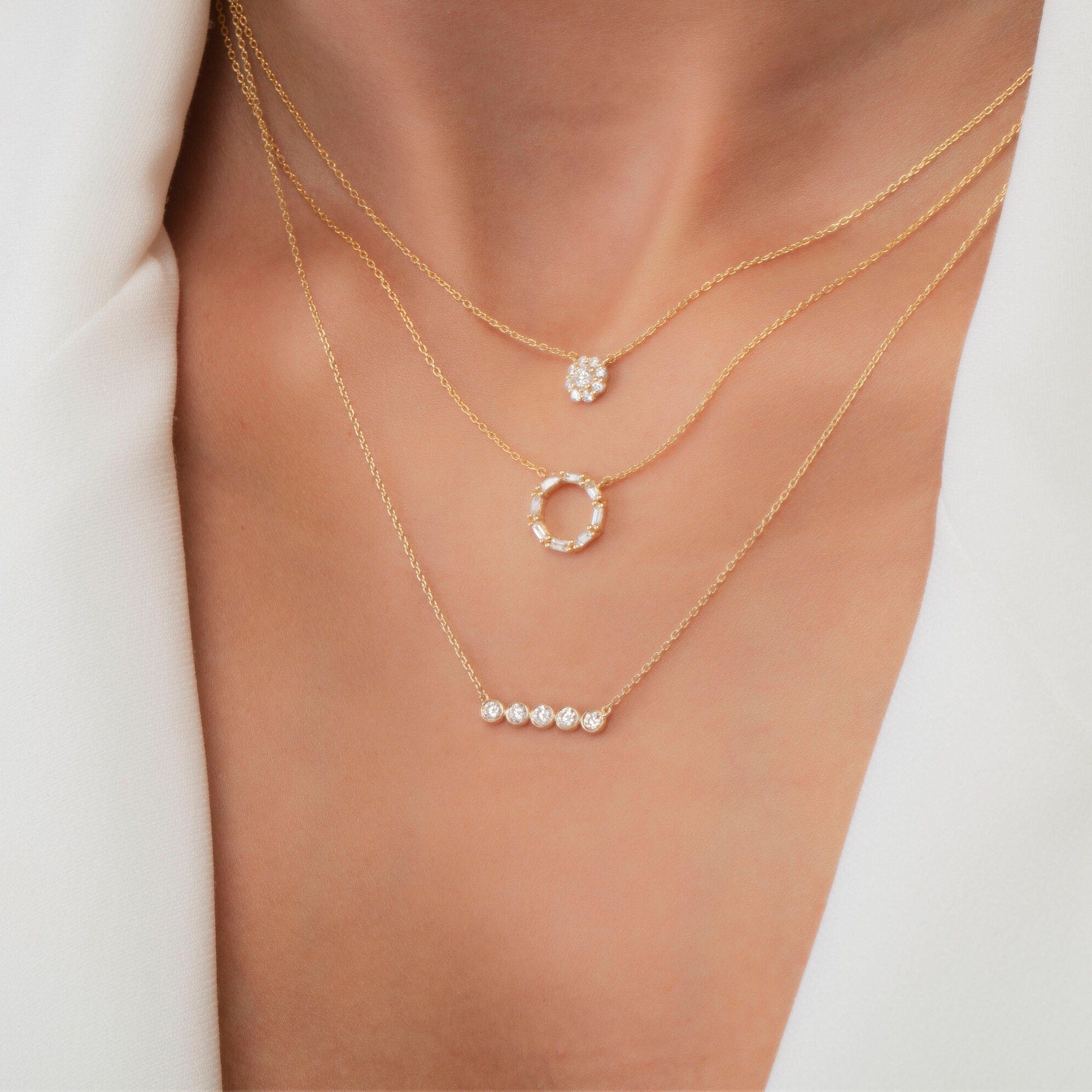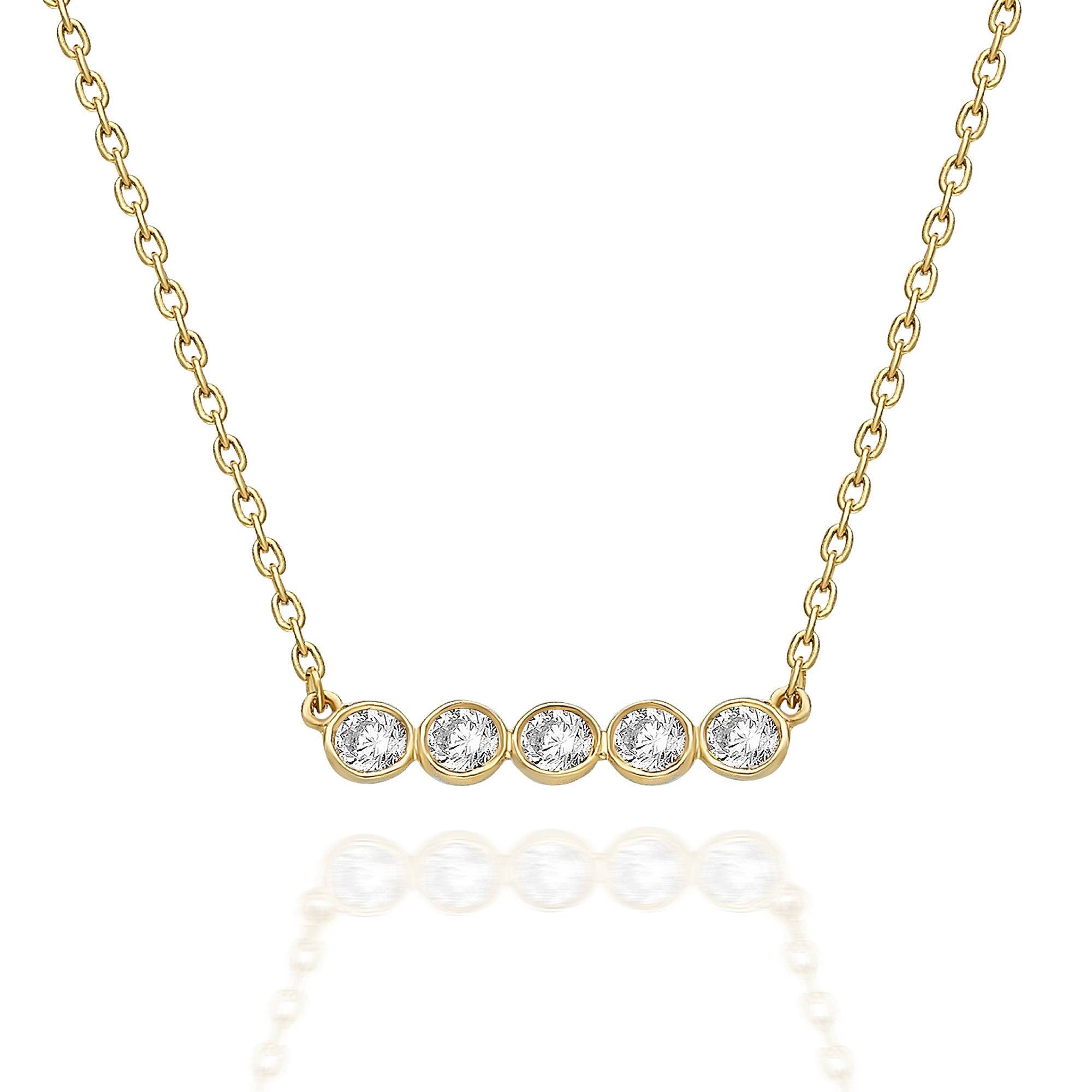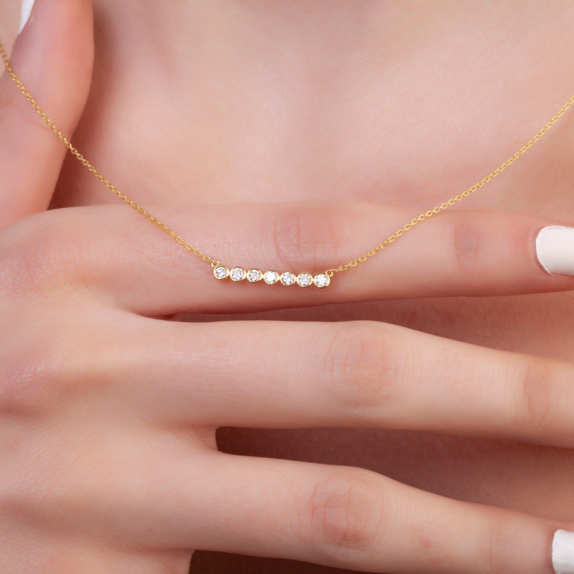 This 14k horizontal bezel set diamond bar necklace is the perfect gift for the bridal party, someone special, or yourself.