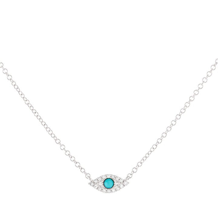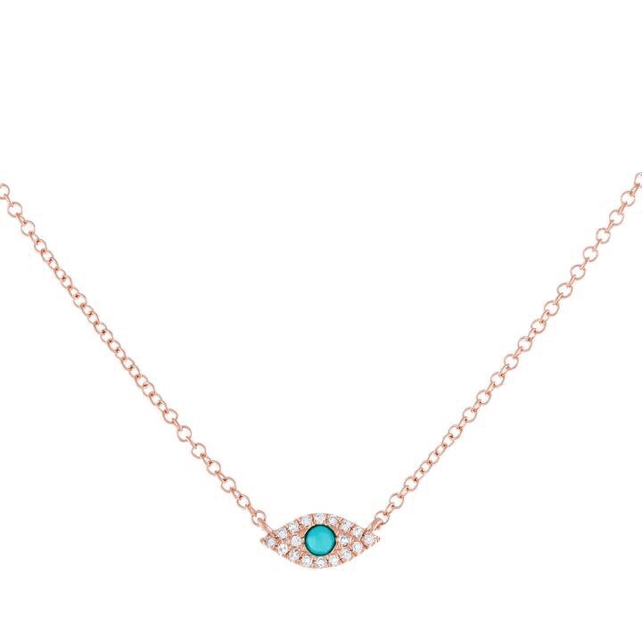 This 14K gold symbol of protection has a turquoise center surrounded by 18 diamonds. Perfect for layering or to gift someone special.