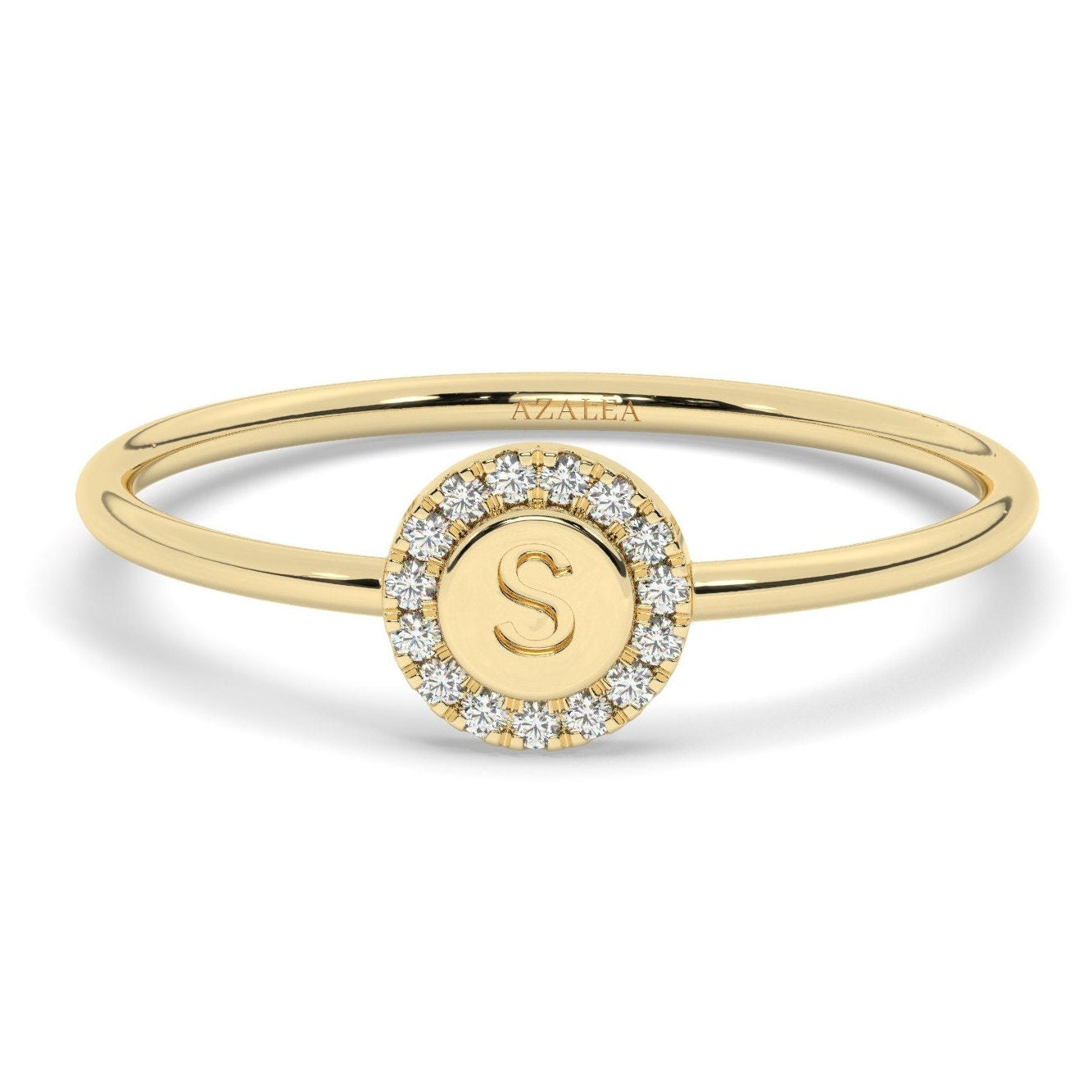 Personalize your style with our exquisite Diamond Initial Ring. Crafted in 14k gold, this pave diamond disc initial ring adds a touch of sparkle and elegance. Perfect as a stacking ring or worn alone, it makes a thoughtful graduation or birthday gift. Order now and make a statement with this timeless and personalized diamond initial ring.
