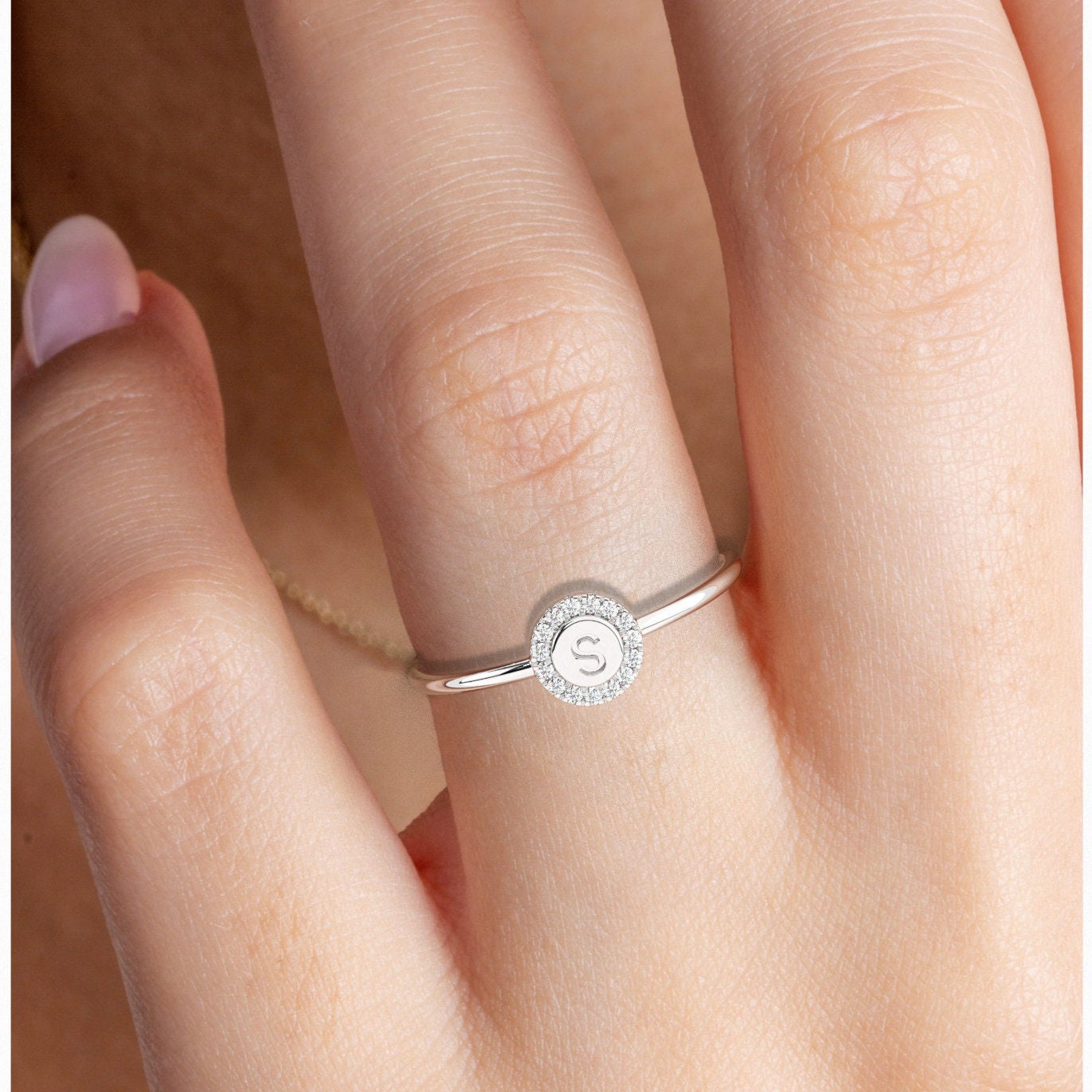 Diamond Initial Ring / 14k Gold Pave Diamond Disc Initial Ring / Diamond Stacking Ring / Initial Ring / Graduation Gift / Birthday Gift