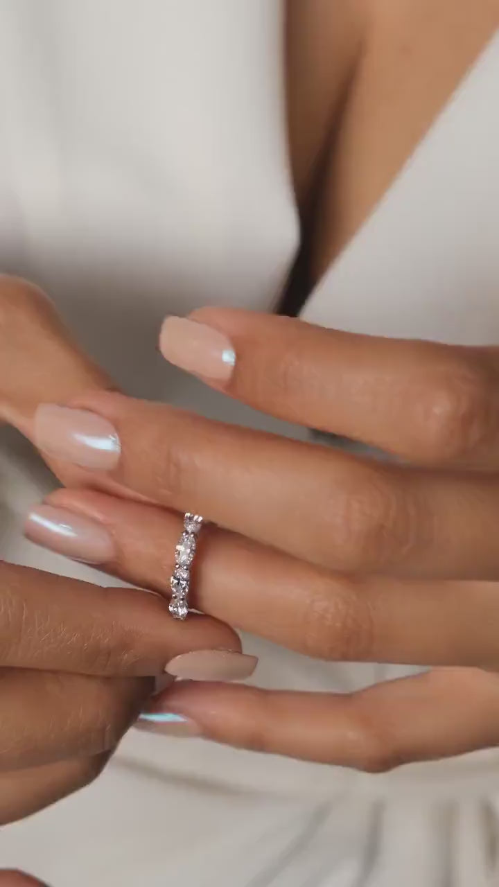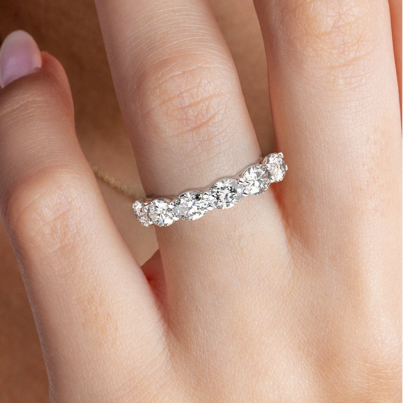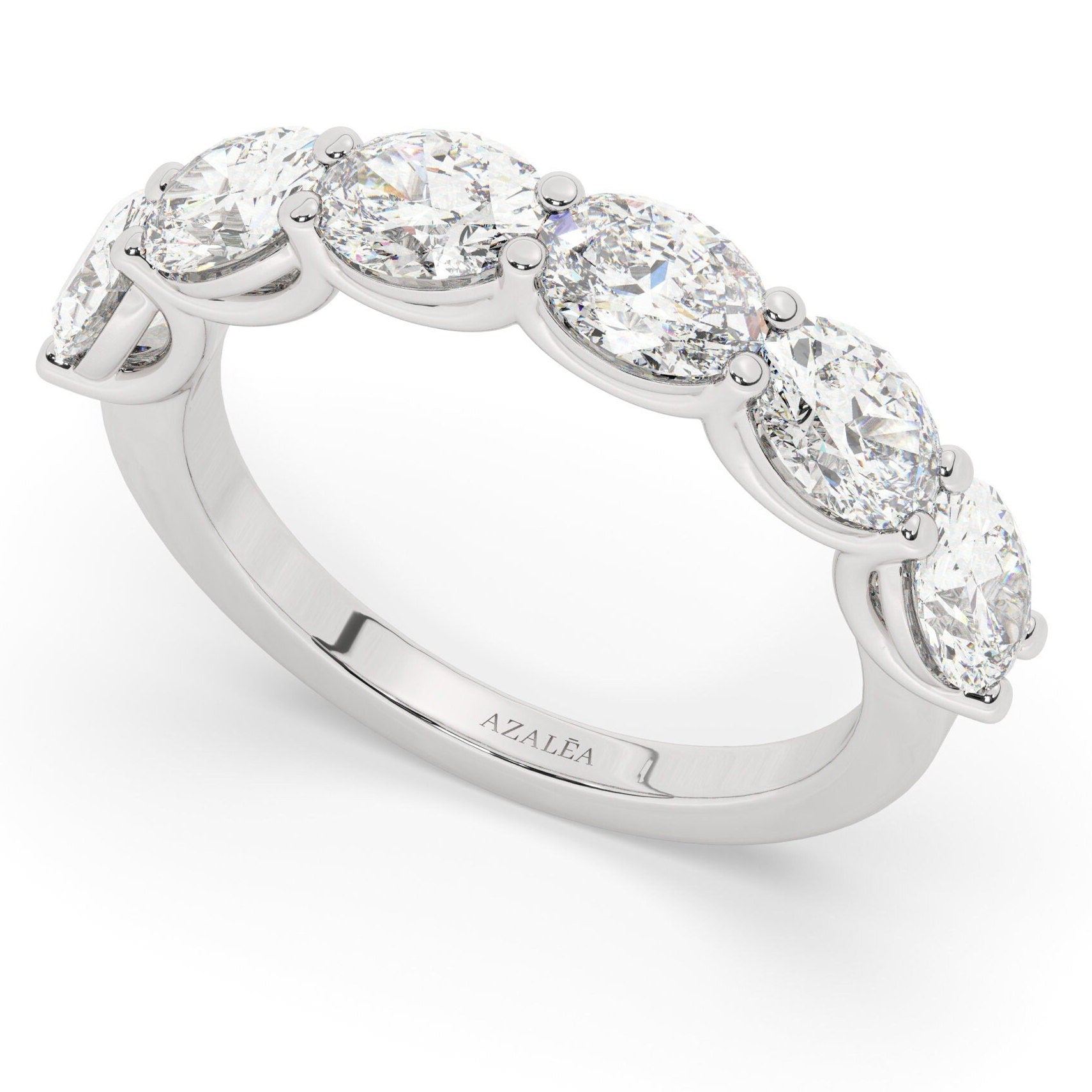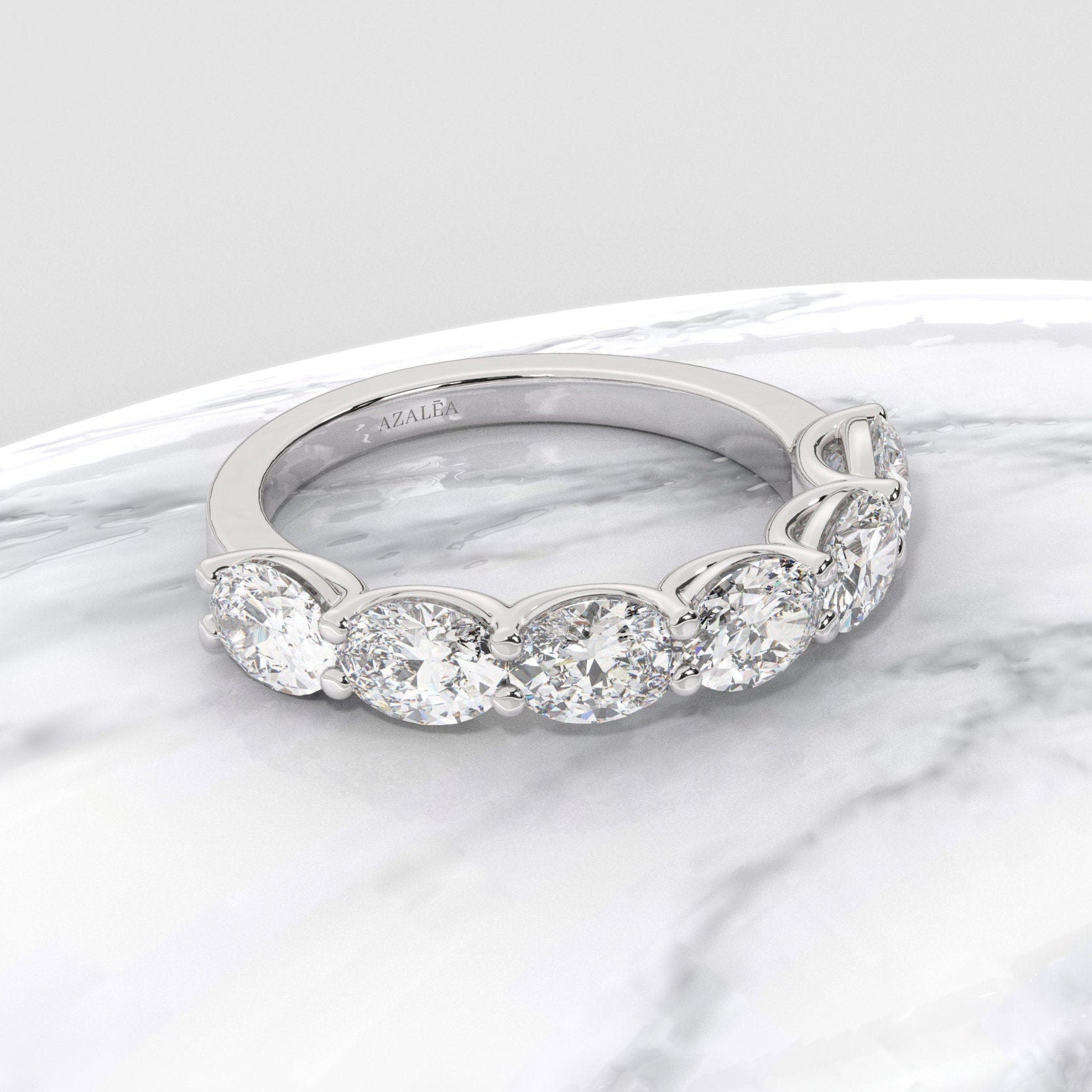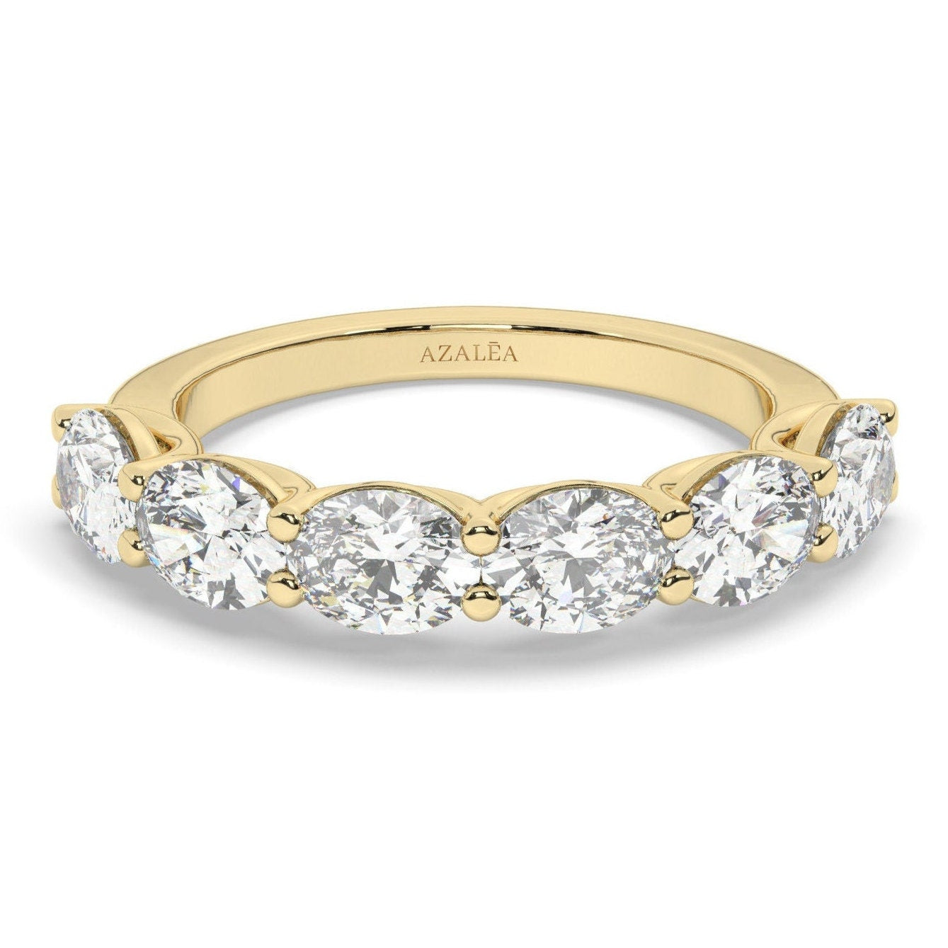 Add a touch of sophistication and elegance to your special day with this stunning 14k gold East West Oval wedding band. Featuring six dazzling oval cut diamonds along the front half of the band, this ring is sure to capture attention and create a lasting impression. Wear it alone for a classic, minimalist look or stack it with other rings for a bold statement.