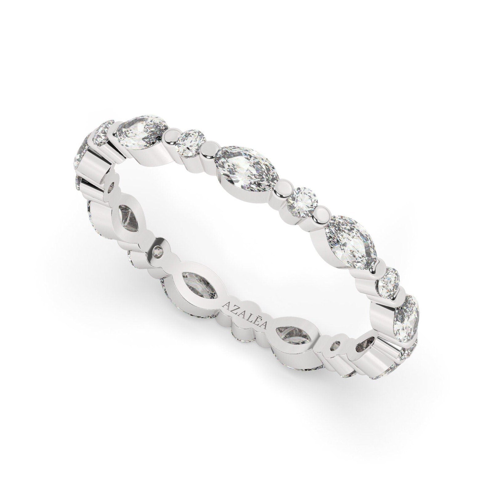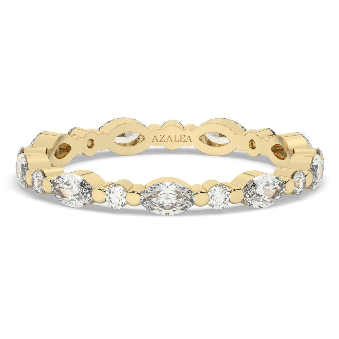This 14k gold alternating diamond eternity wedding band has 9 marquise diamonds and 9 round diamonds alternating throughout the band. Perfect as a stacking ring or a wedding band.
