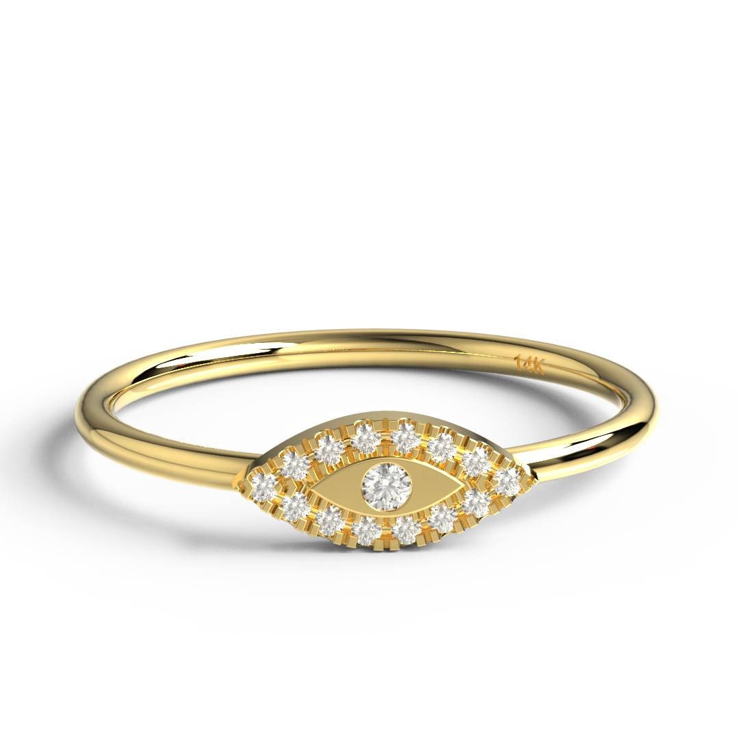 This 14k gold diamond ring has an evil eye design, and pairs well with any stacking band.