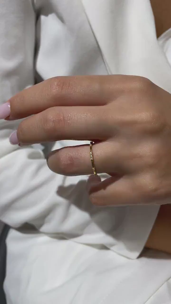 This 14k gold diamond stacking ring comes with 16 round diamonds throughout the band. Great as a solo piece and with stacking rings.