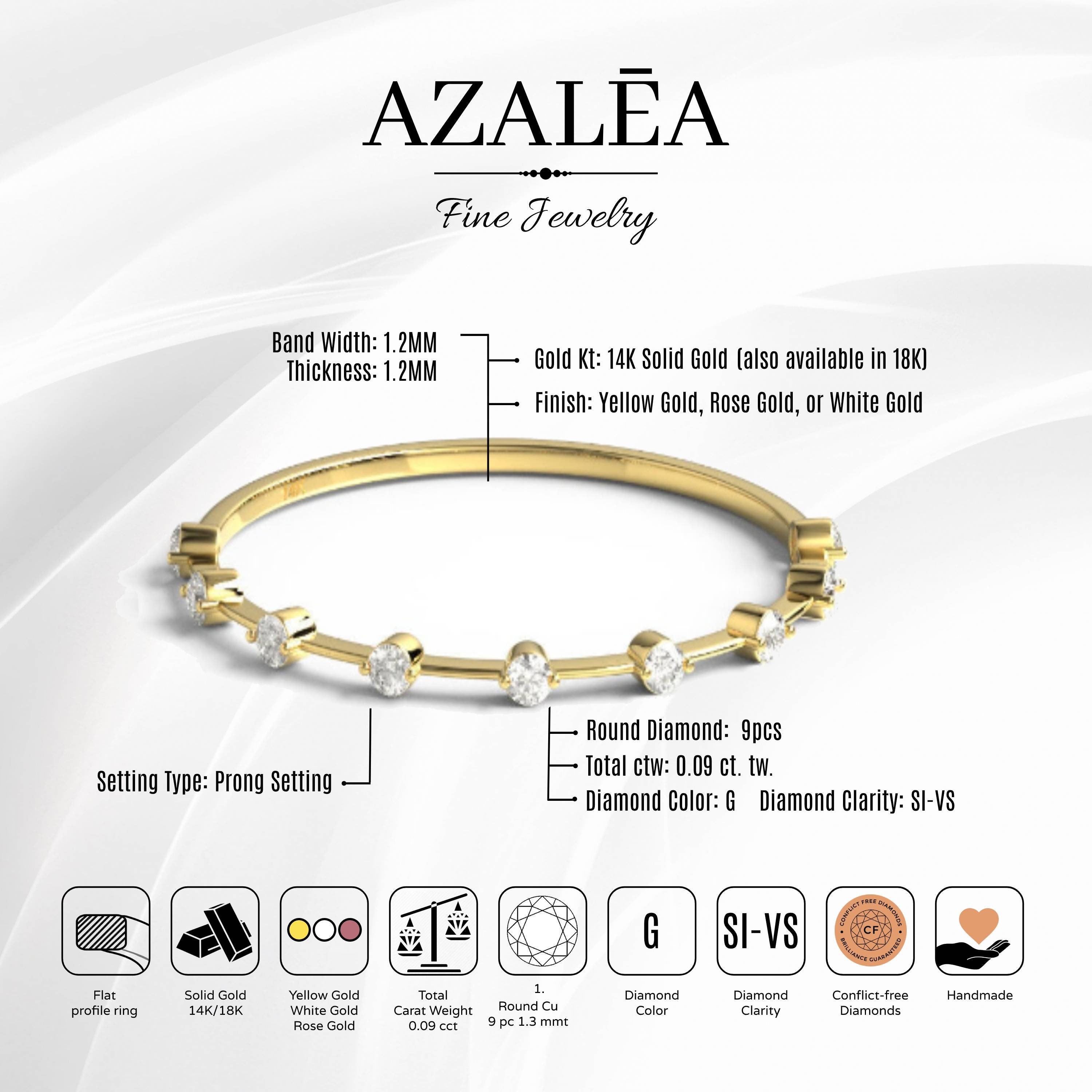 Elevate your style with our dazzling 14k Gold Ring featuring 9 round diamonds. Versatile and stunning, this ring can be worn solo for an elegant look or stacked with other favorites. Crafted with precision and timeless beauty, it's a perfect addition to your jewelry collection. Order now and embrace the radiance of this diamond-studded piece.