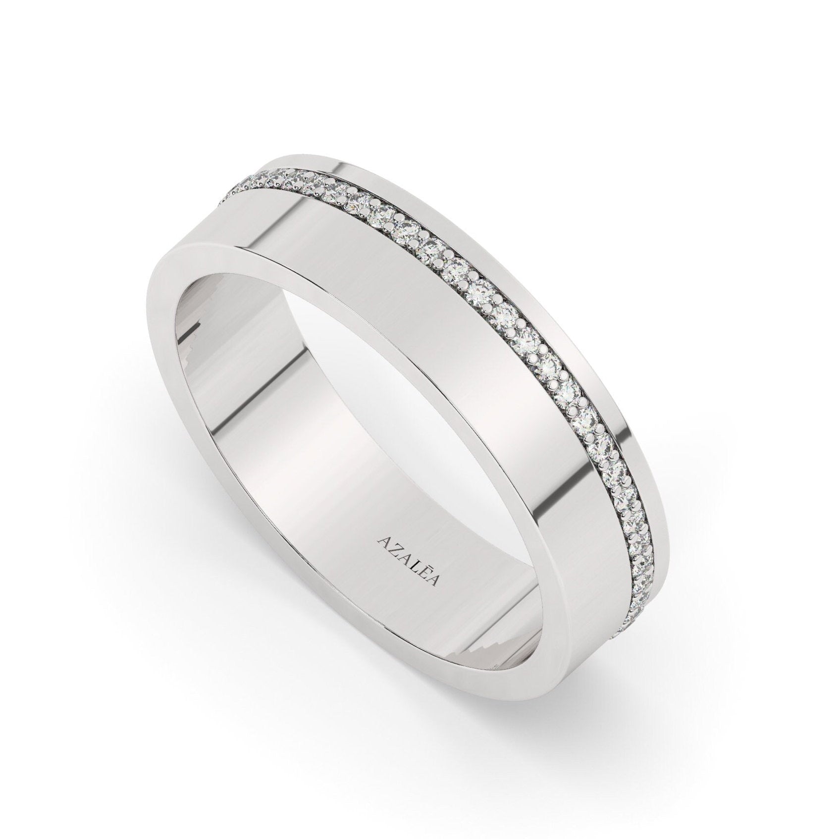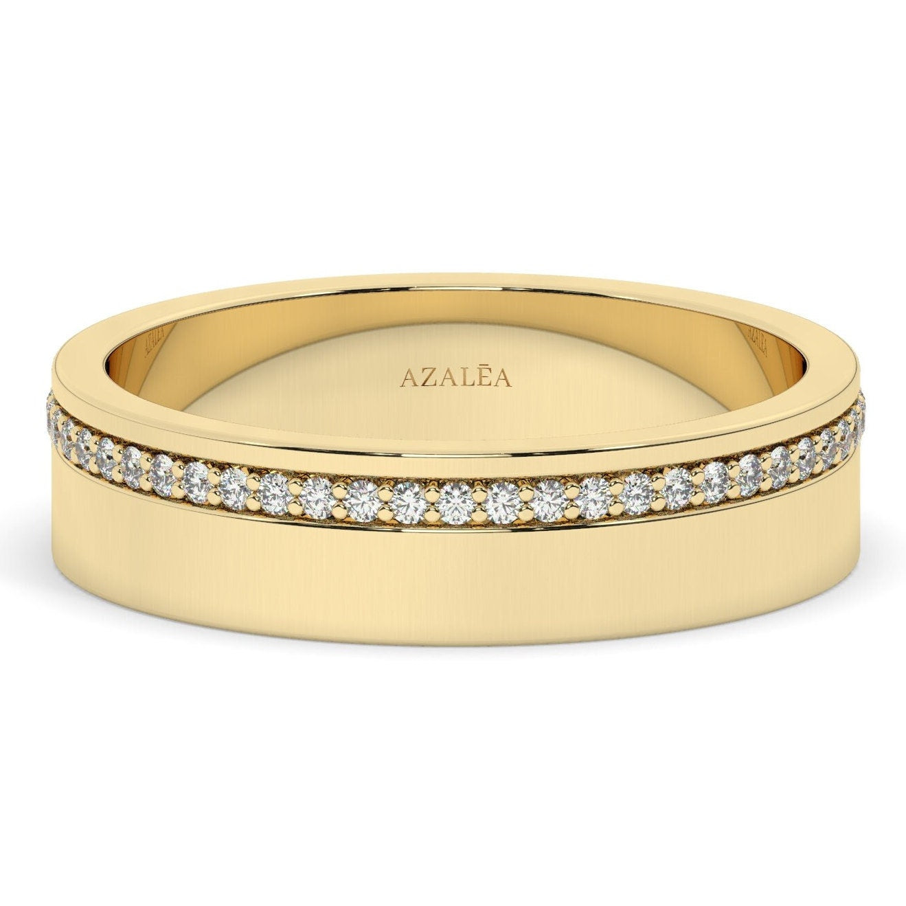 This 14k gold round diamond channel set wedding band has round diamonds situated along the band. This is a beautiful ring to wear alone or with stacking rings.