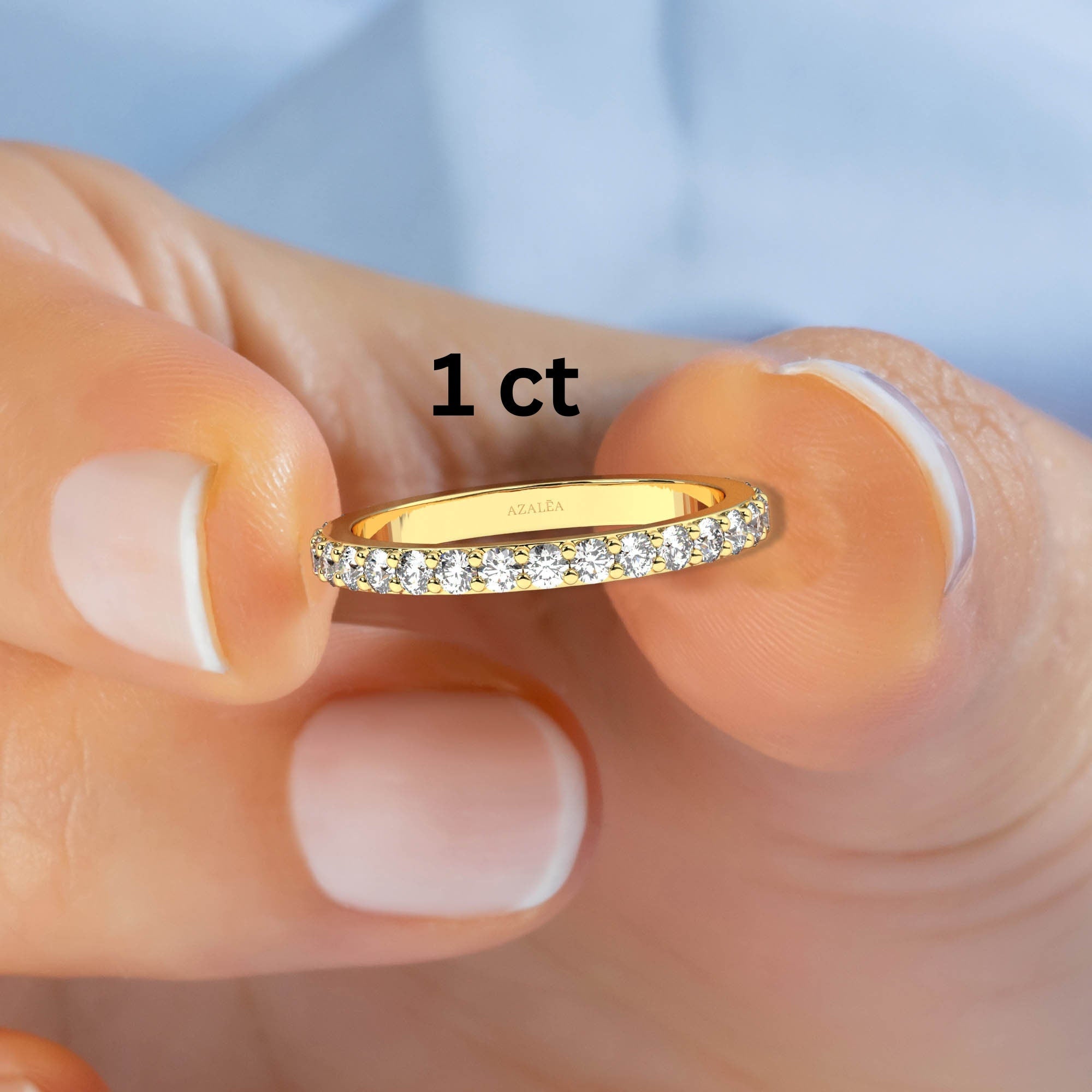 This simple prong set eternity band balances classic elegance with a contemporary twist, making it appealing to those seeking a blend of tradition and modernity in their jewelry.