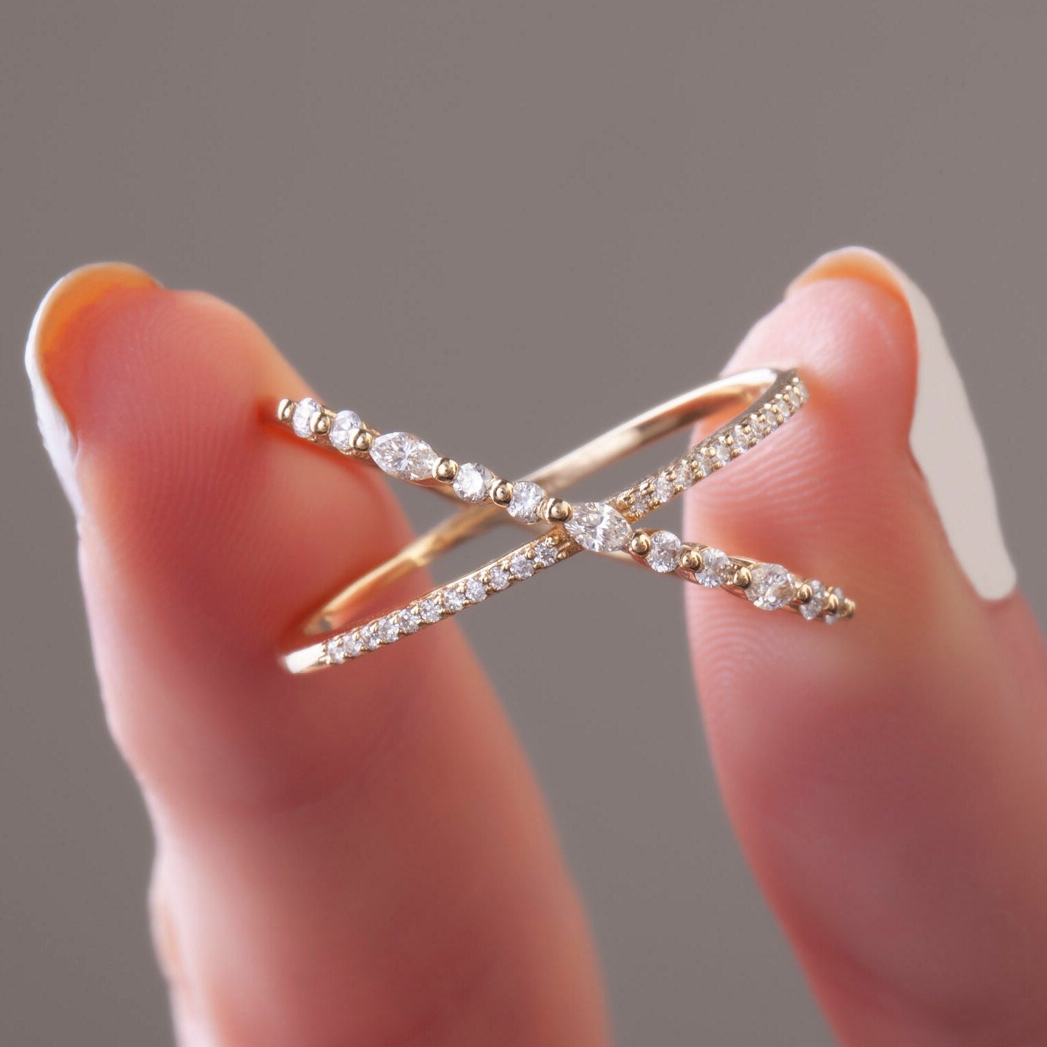 Diamond X Stacking Ring / 14k Gold Marquise and Round Diamond Crisscross Stacking Ring / Wedding Band / Stacking Ring/ Anniversary Gift