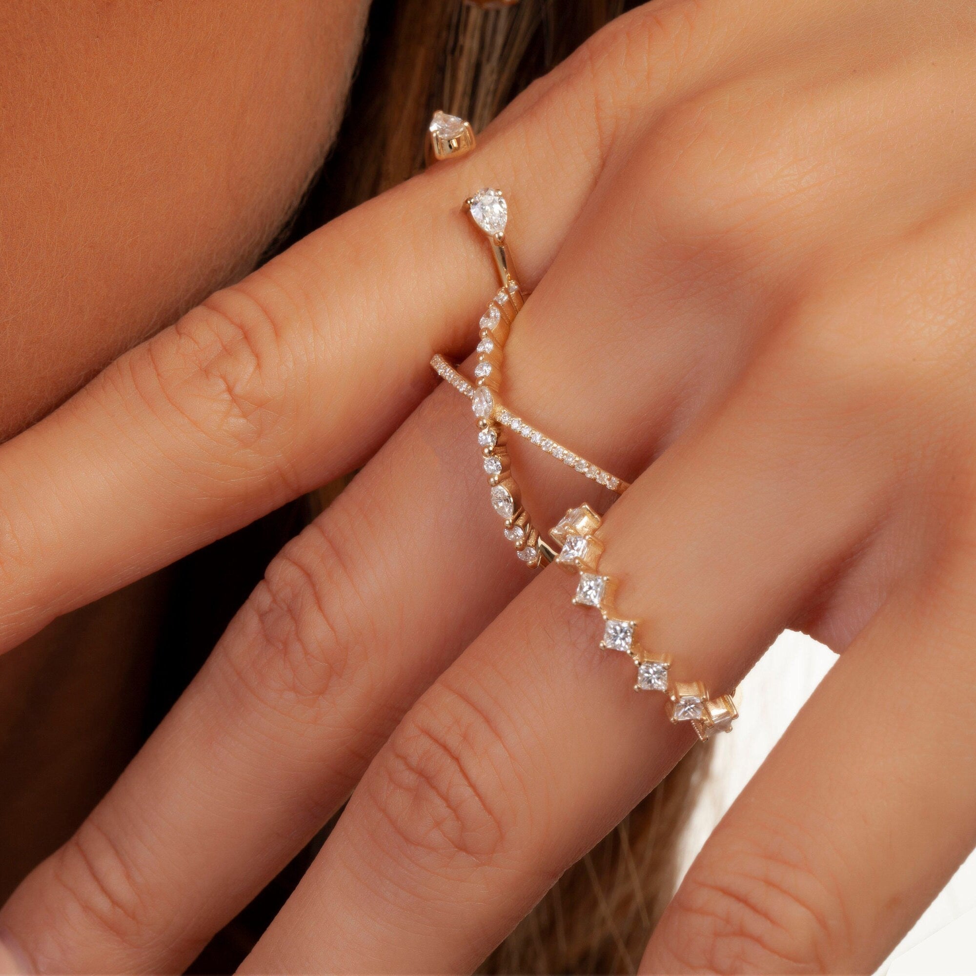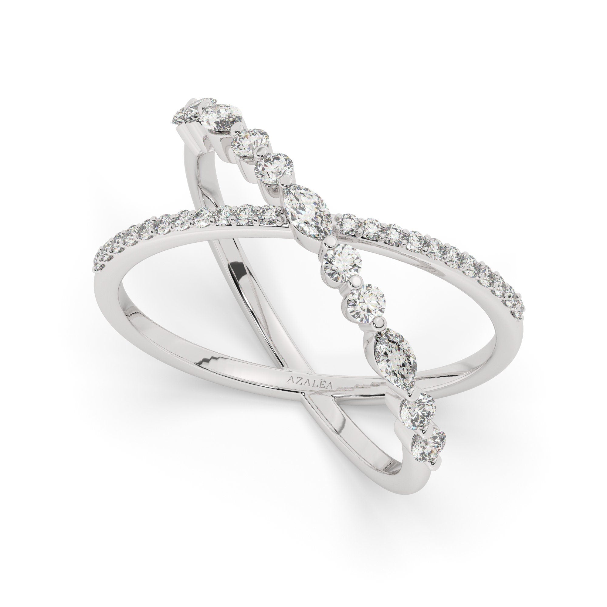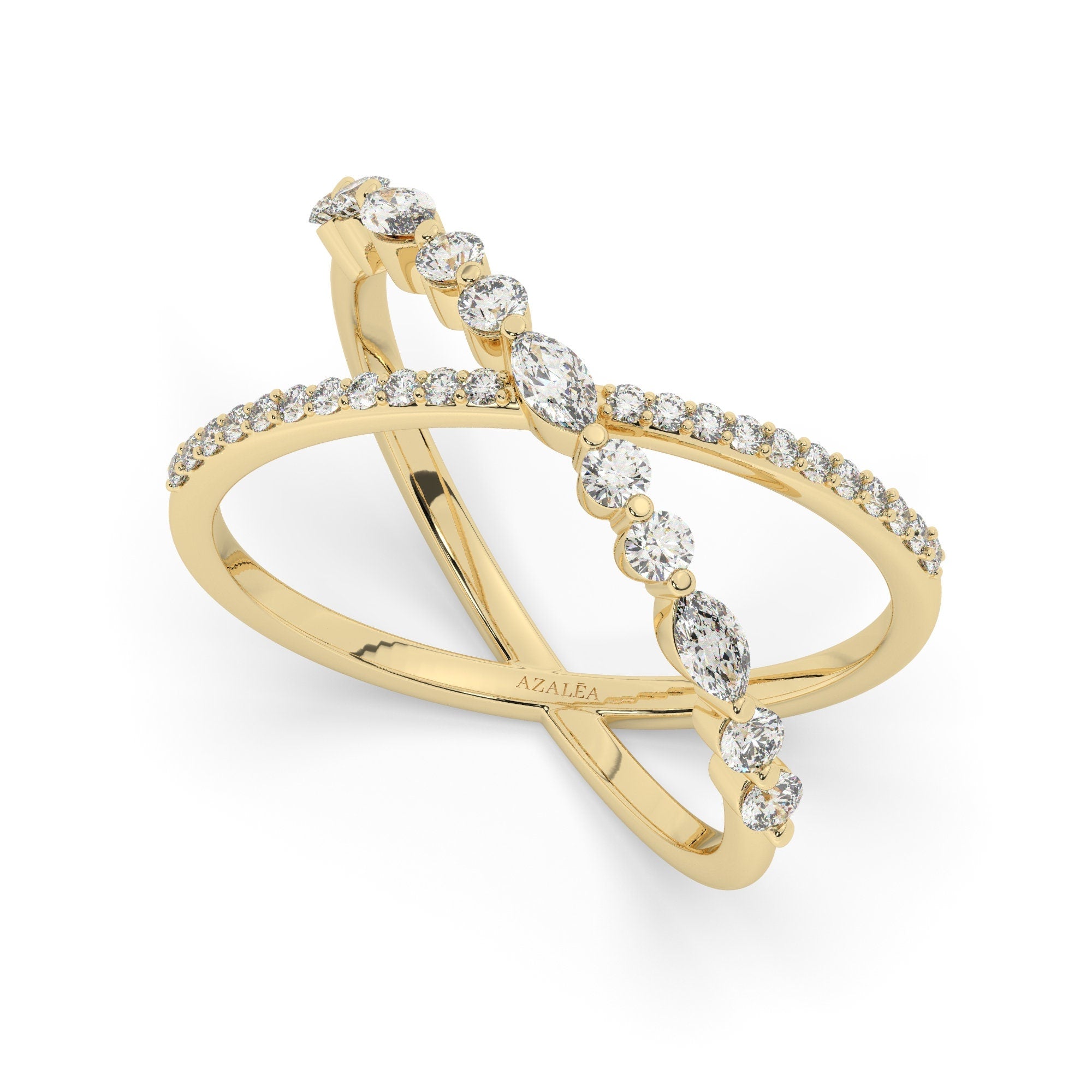 This elegant 14k gold crisscross diamond ring has 3 marquise diamonds and 8 round diamonds along one band, and 22 round micro diamonds along a 2nd band. It can be used as a classic wedding band or stacking ring.