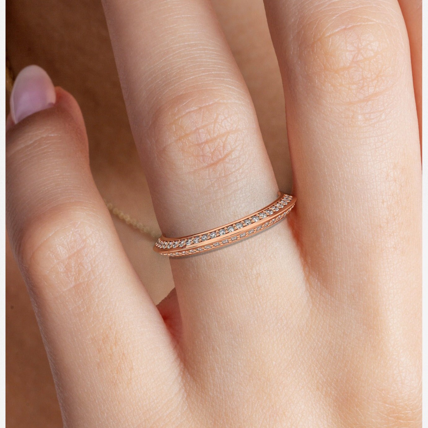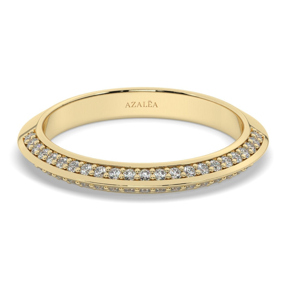 This 14k gold diamond wedding band has round diamonds situated on the top and bottom of the front of the band. This is a beautiful ring to wear alone or with stacking rings.