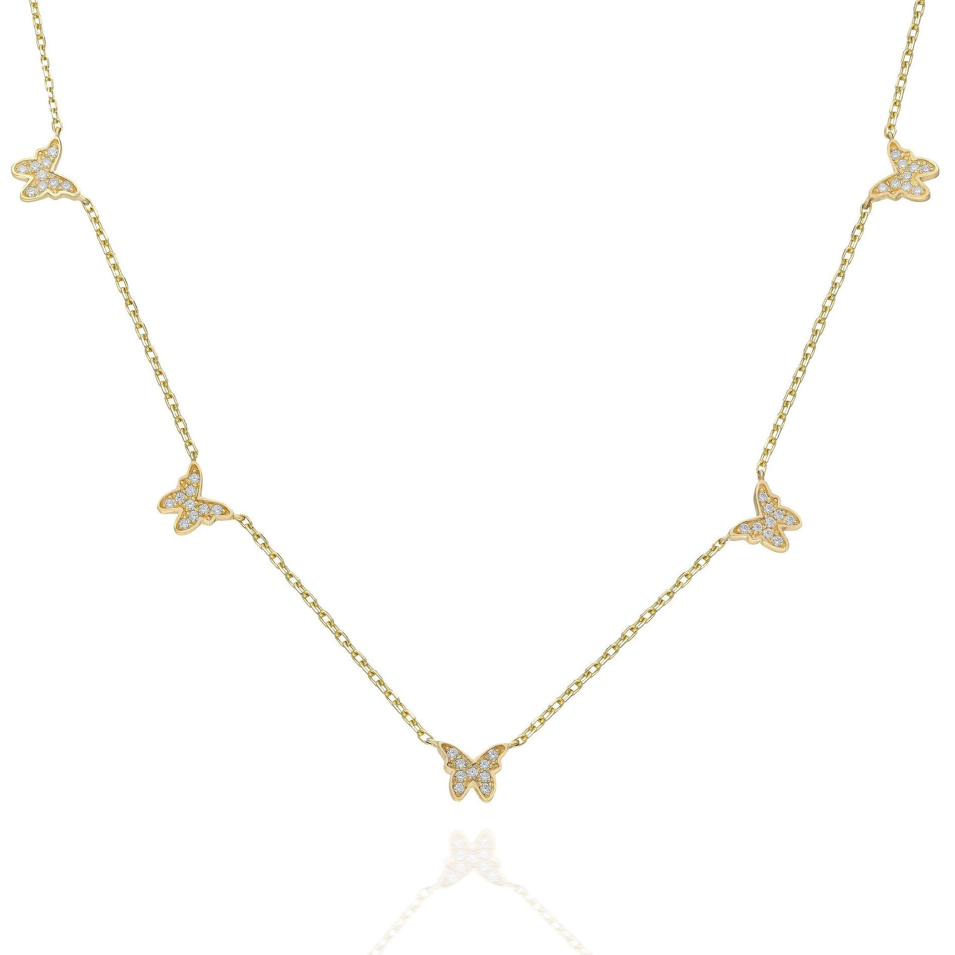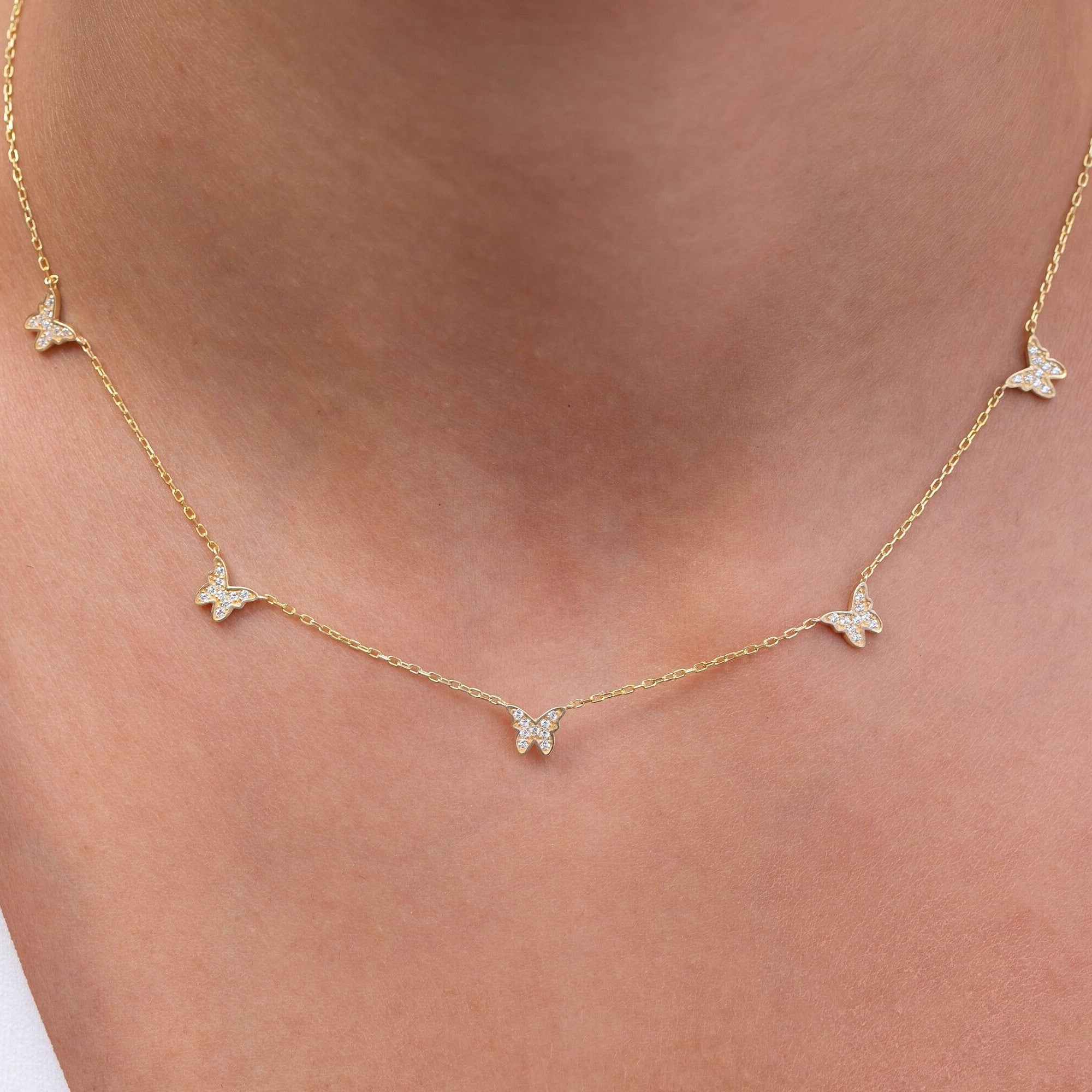 14k Gold Diamond Butterfly Station Necklace, Dainty Charm Necklace