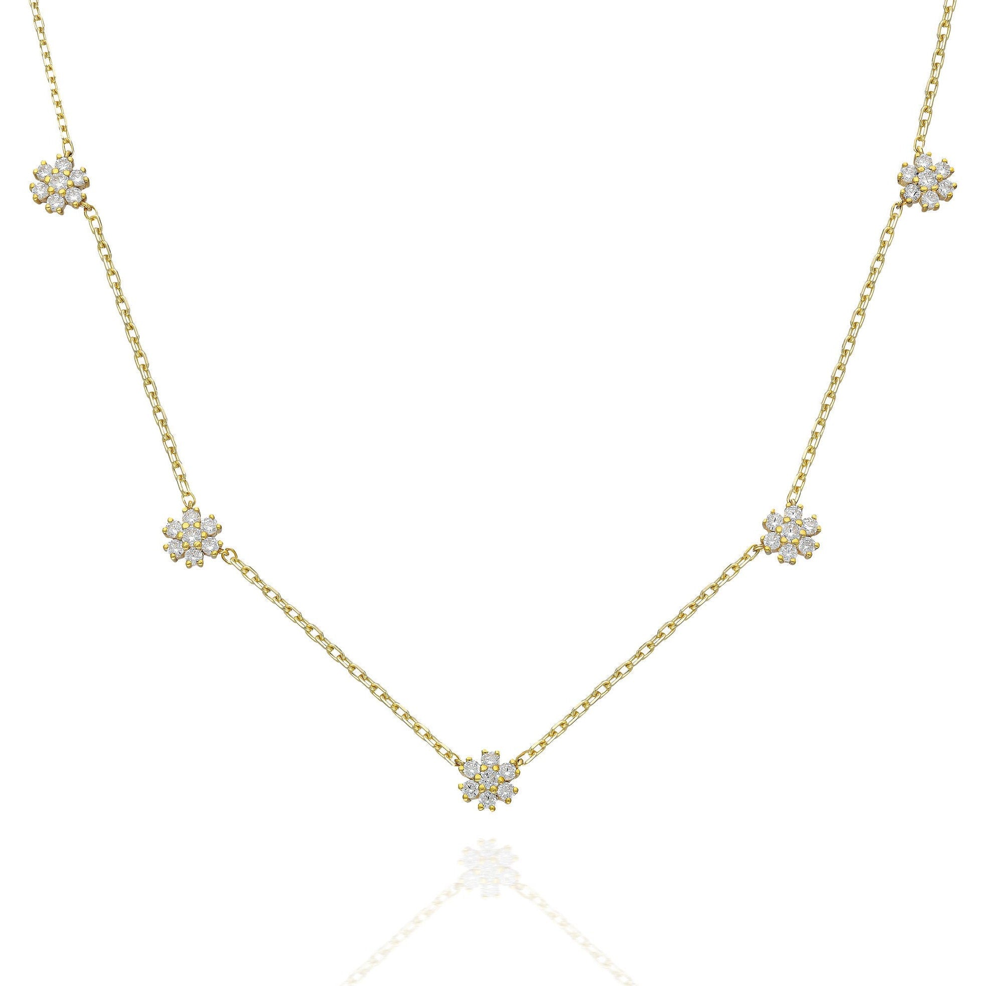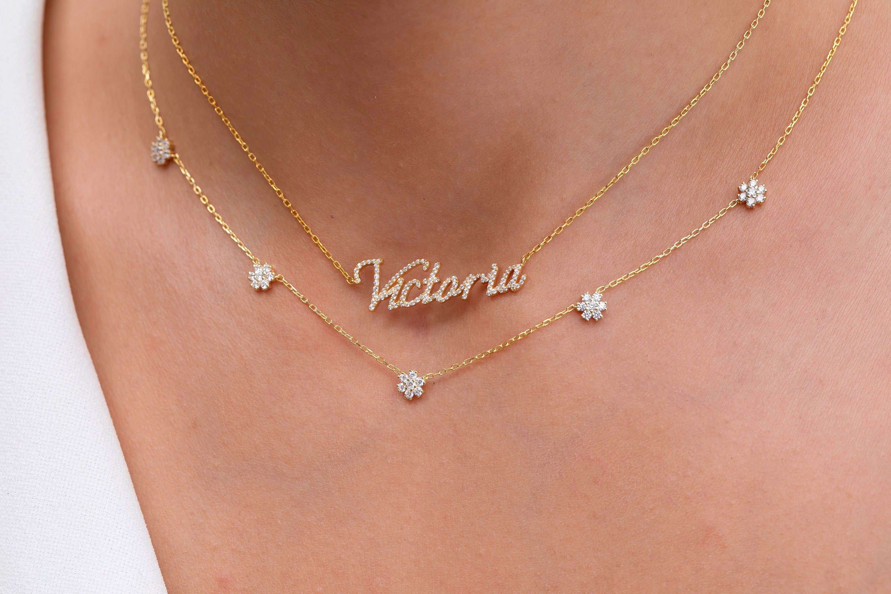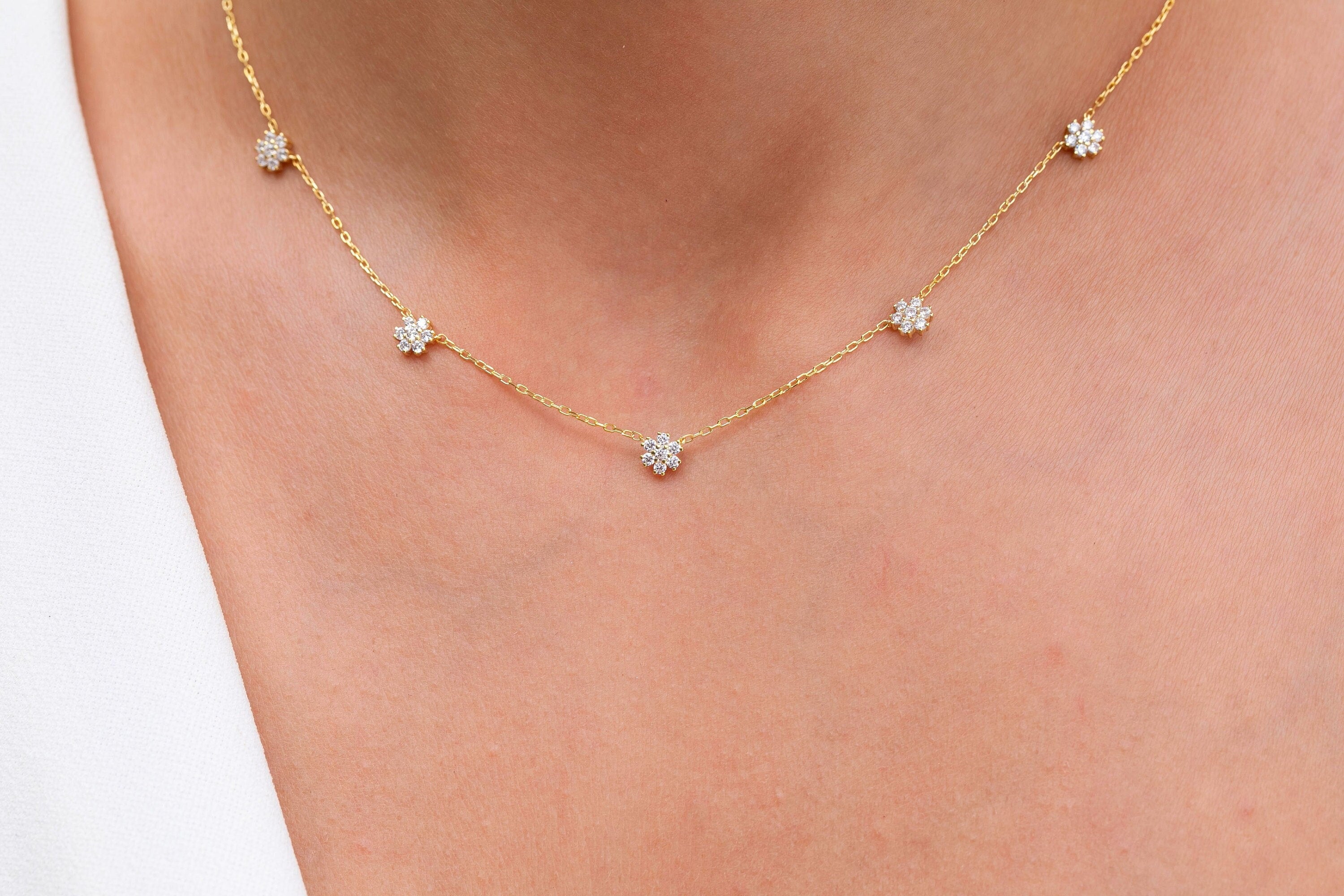 14k Gold Diamond Flower Station Necklace: Dainty Charm, Minimalist Style