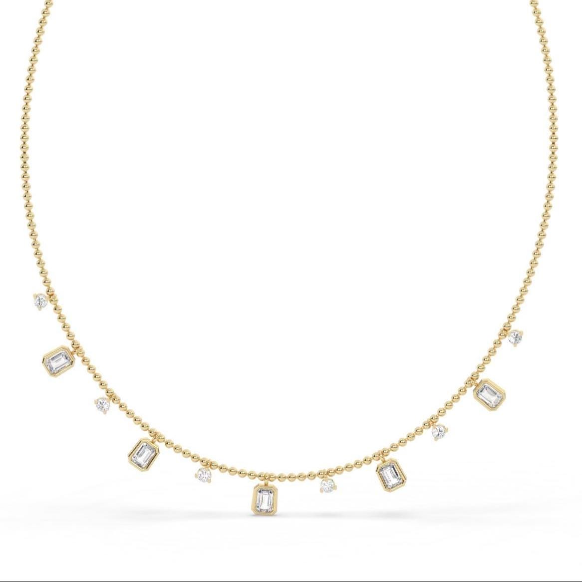 This beautiful, dainty bezel set emerald cut diamond station necklace is perfect just by itself or layering.