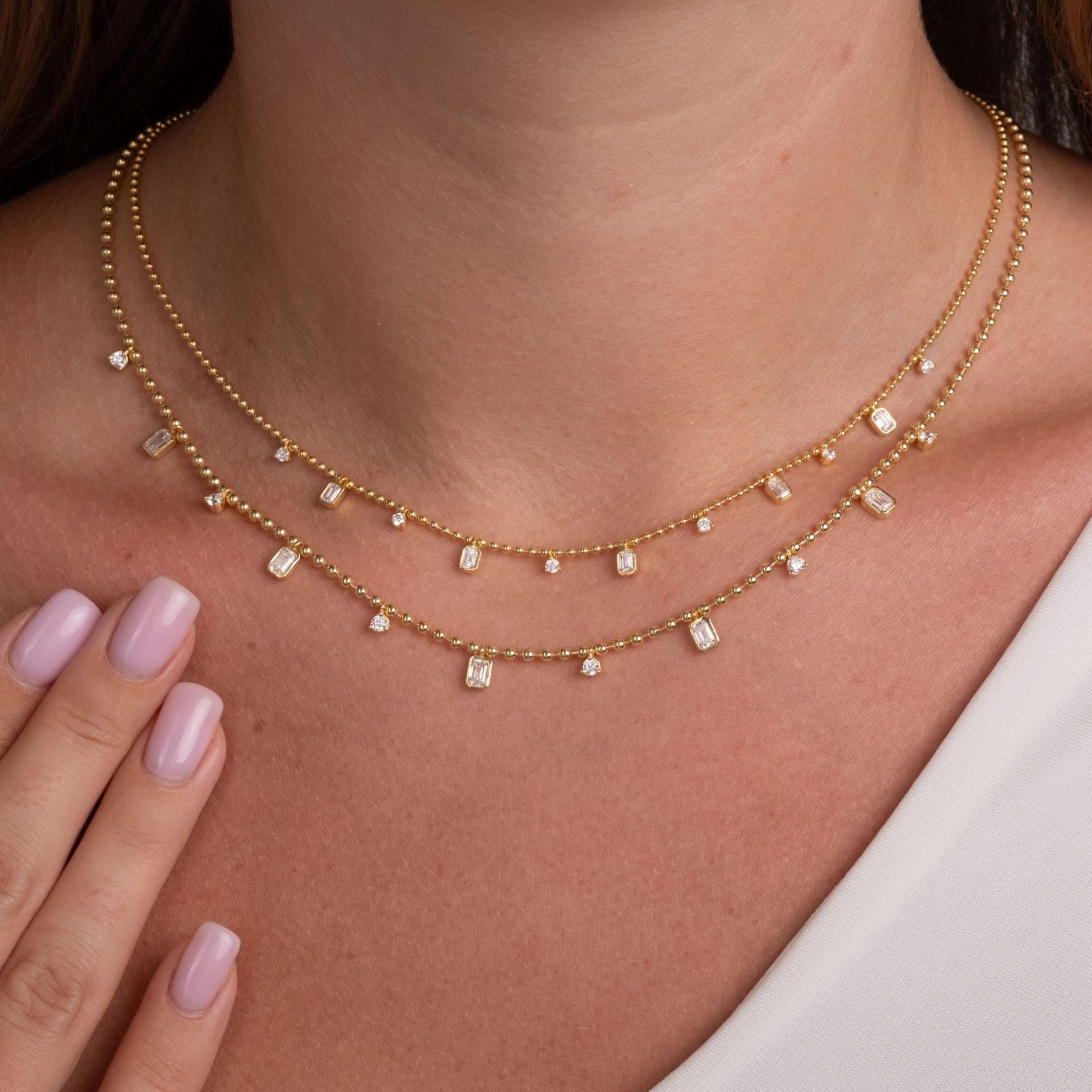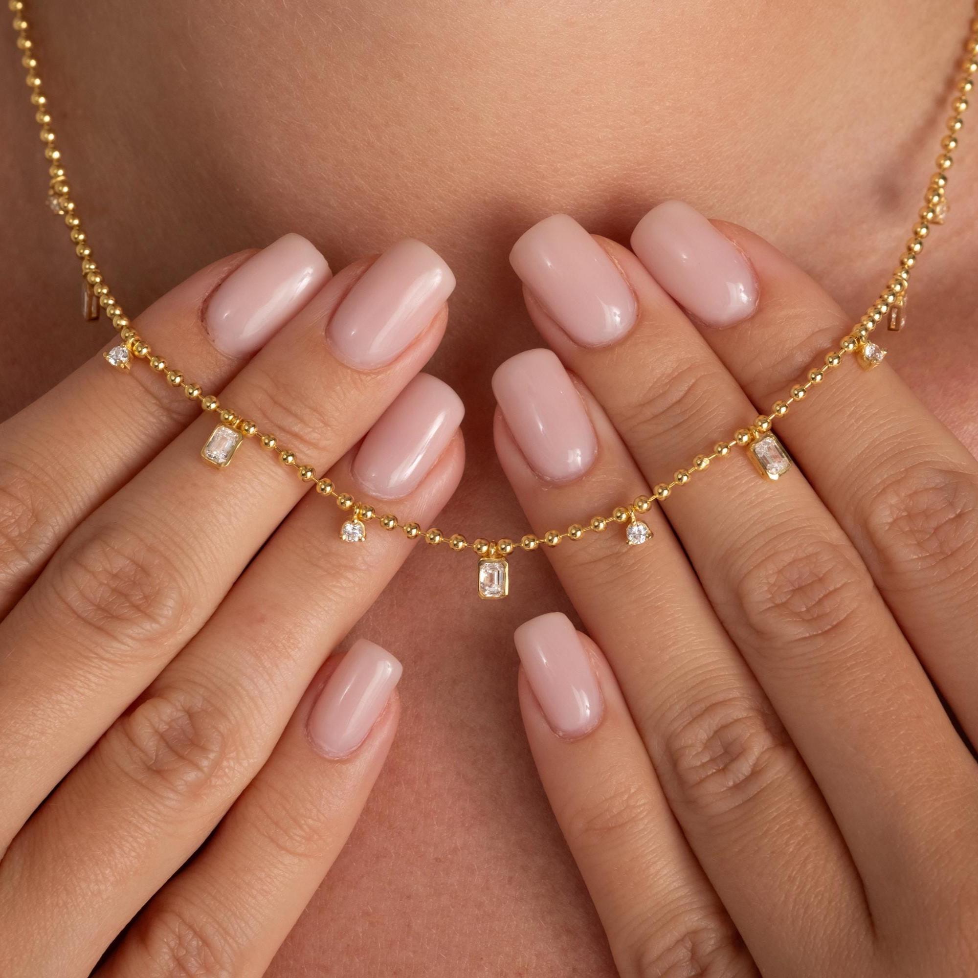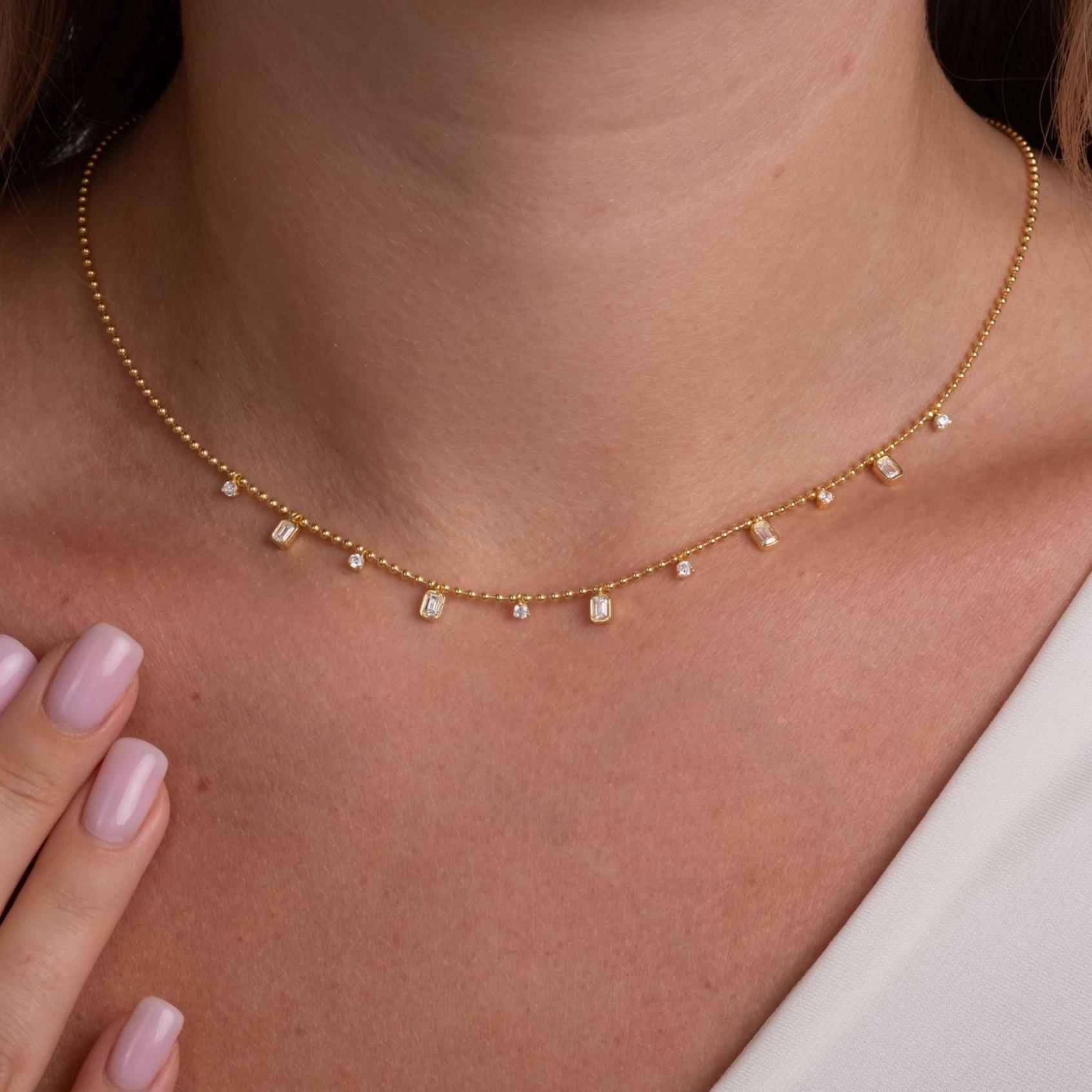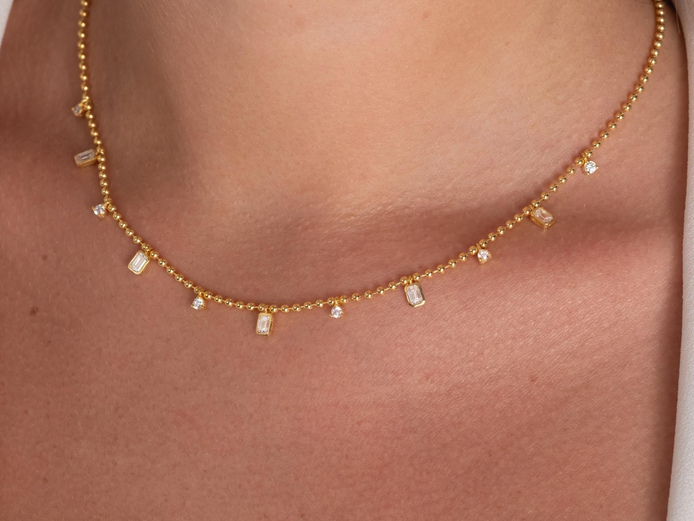 Dainty 14k Gold Emerald Cut Diamond Station Dangle Necklace - Ball Chain