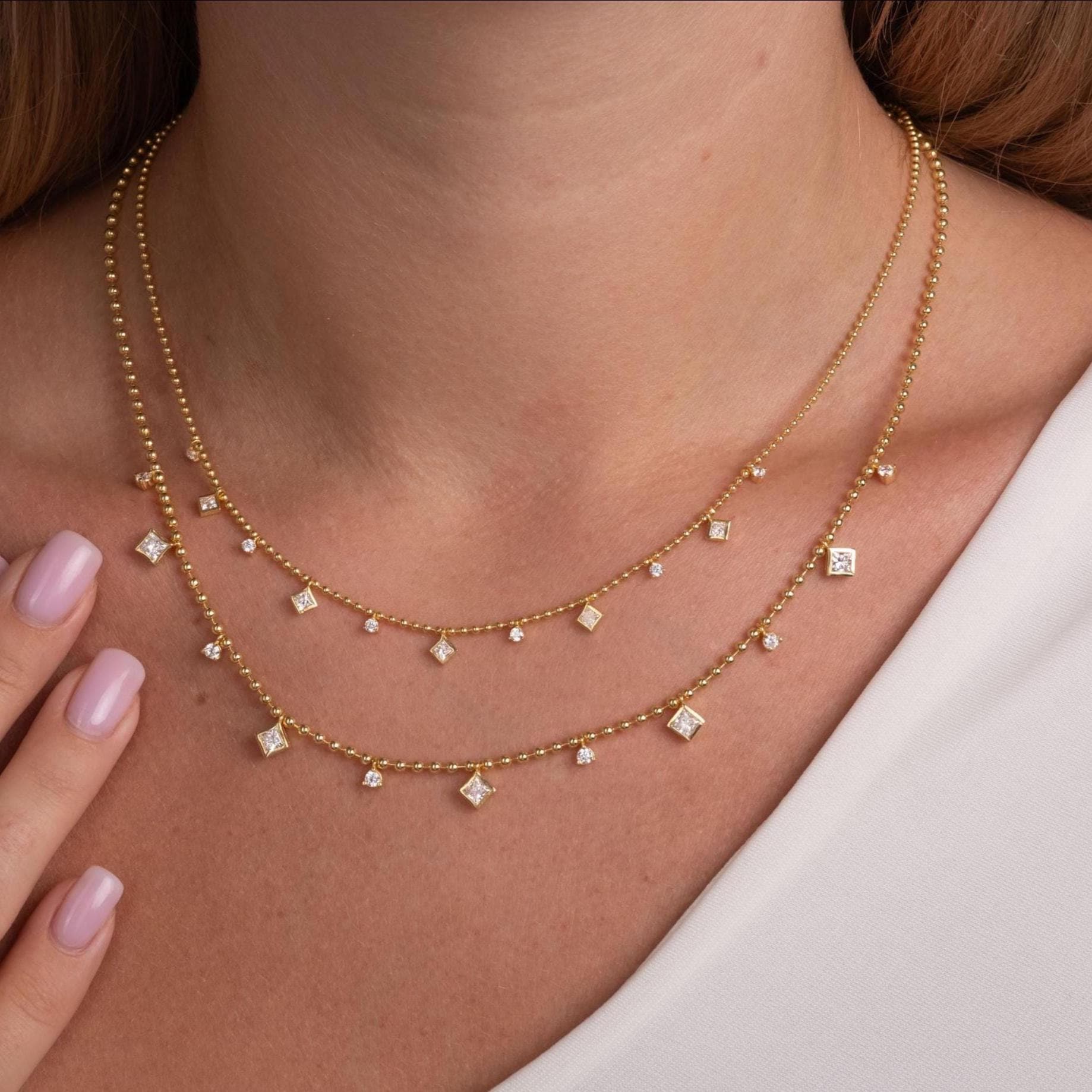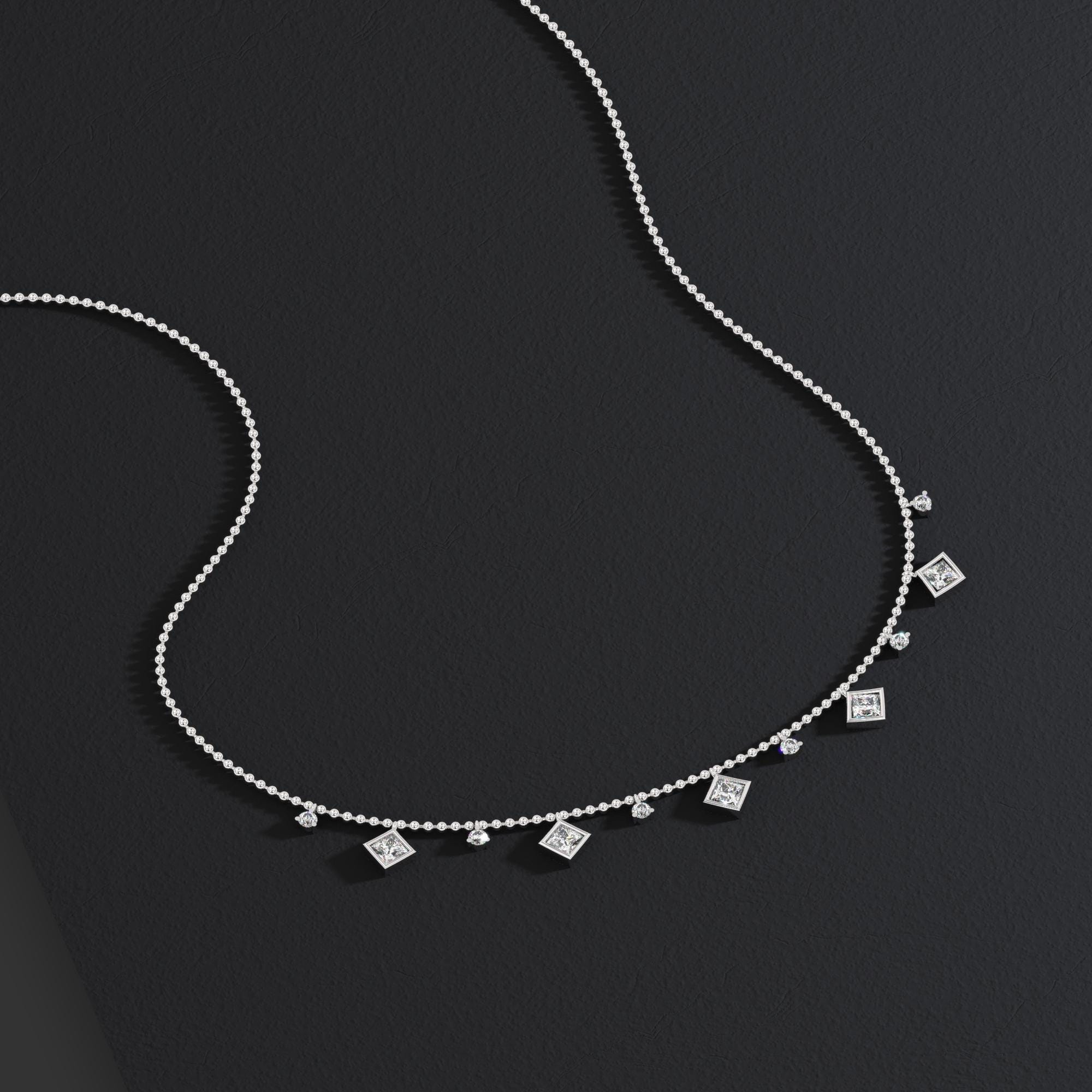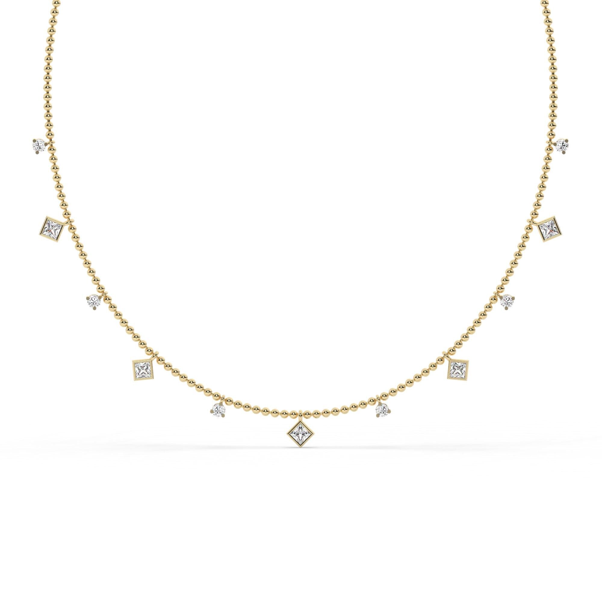 Princess Cut Diamond Station Necklace / 14k Gold Diamond Necklace / Dainty Bead Chain Diamond Necklace / Ball Chain Layering Necklace