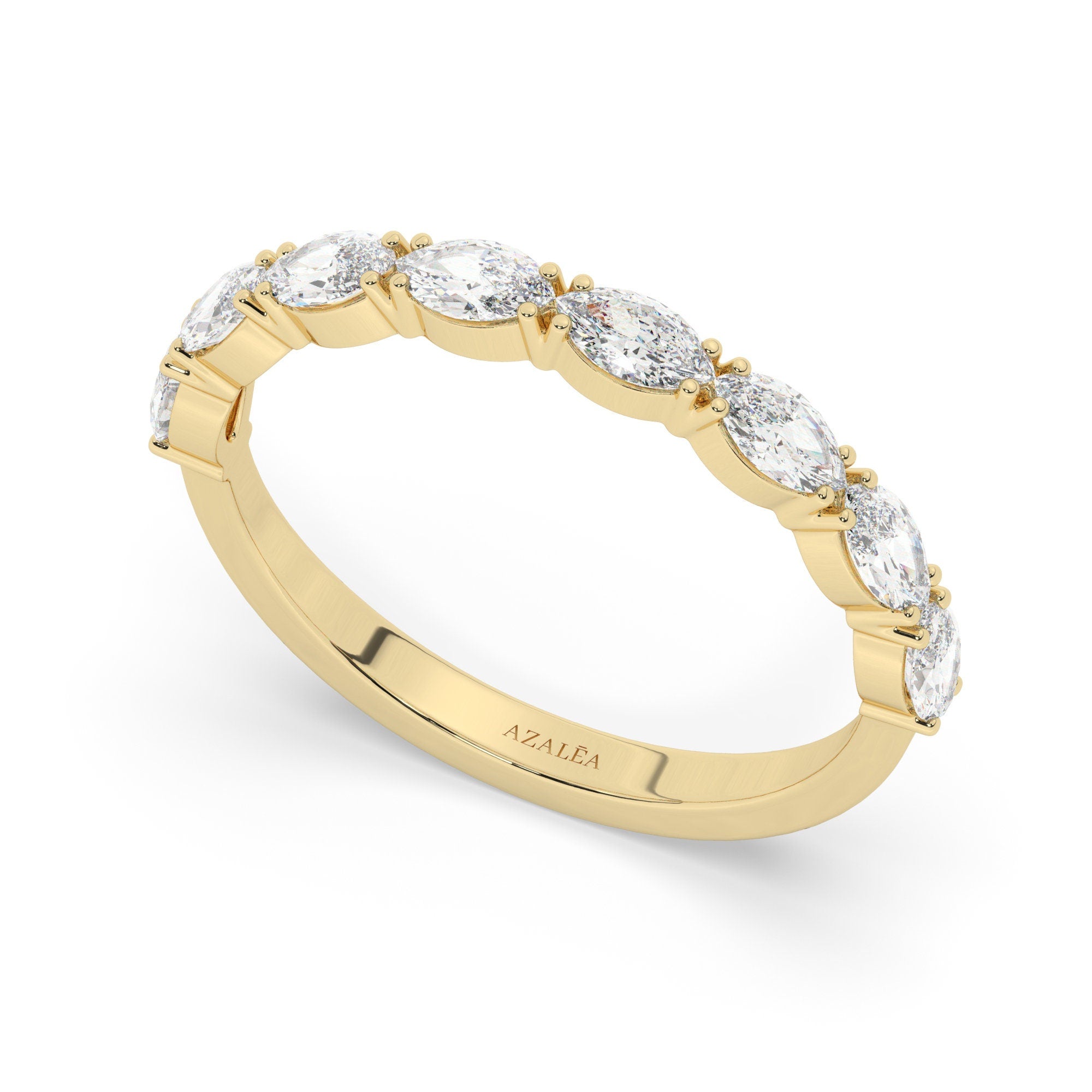 Enhance your wedding day bliss with our stunning 14k gold marquise diamond wedding band. Featuring 8 mesmerizing marquise cut diamonds elegantly placed along the front half of the band, this ring exudes timeless beauty. Whether worn alone for a classic look or stacked with other rings for a personalized style, it adds a touch of sophistication and sparkle.