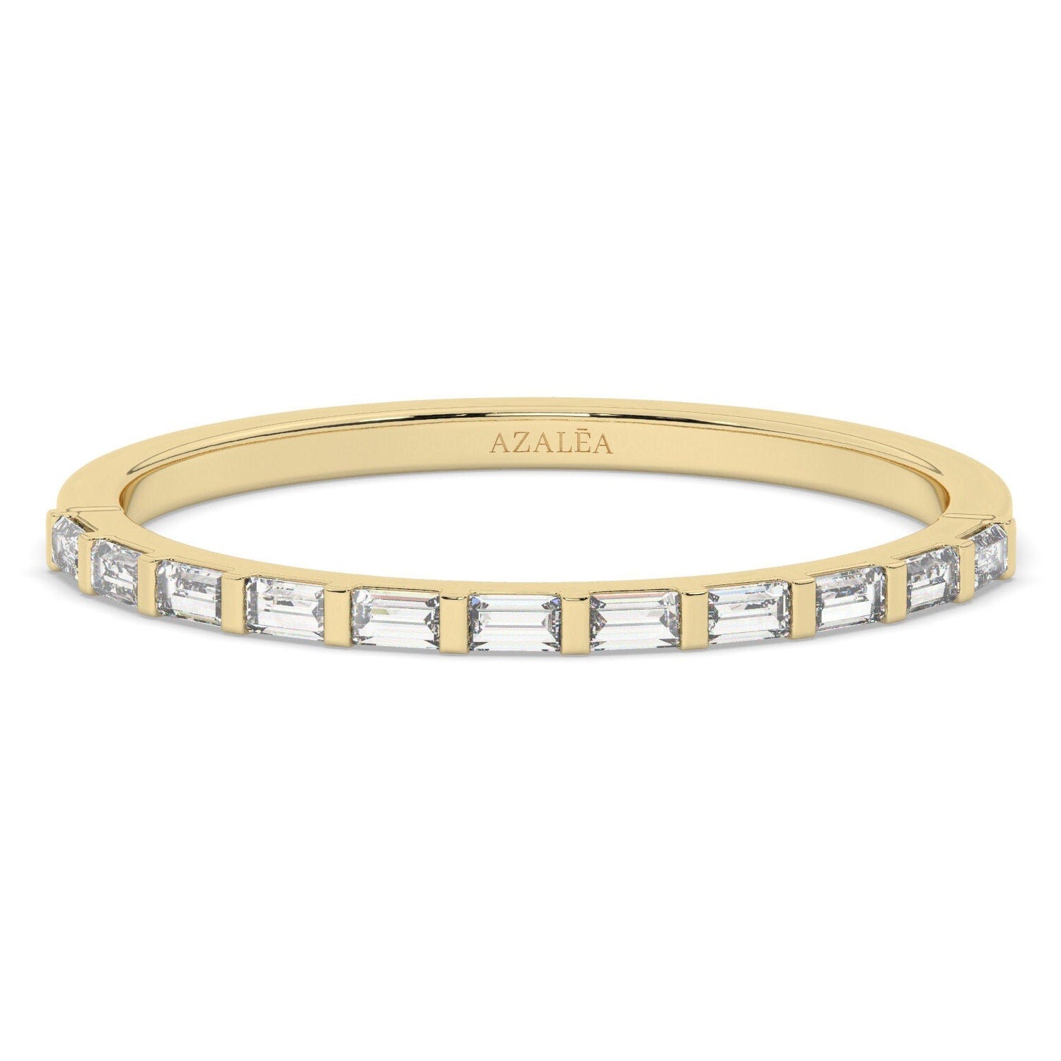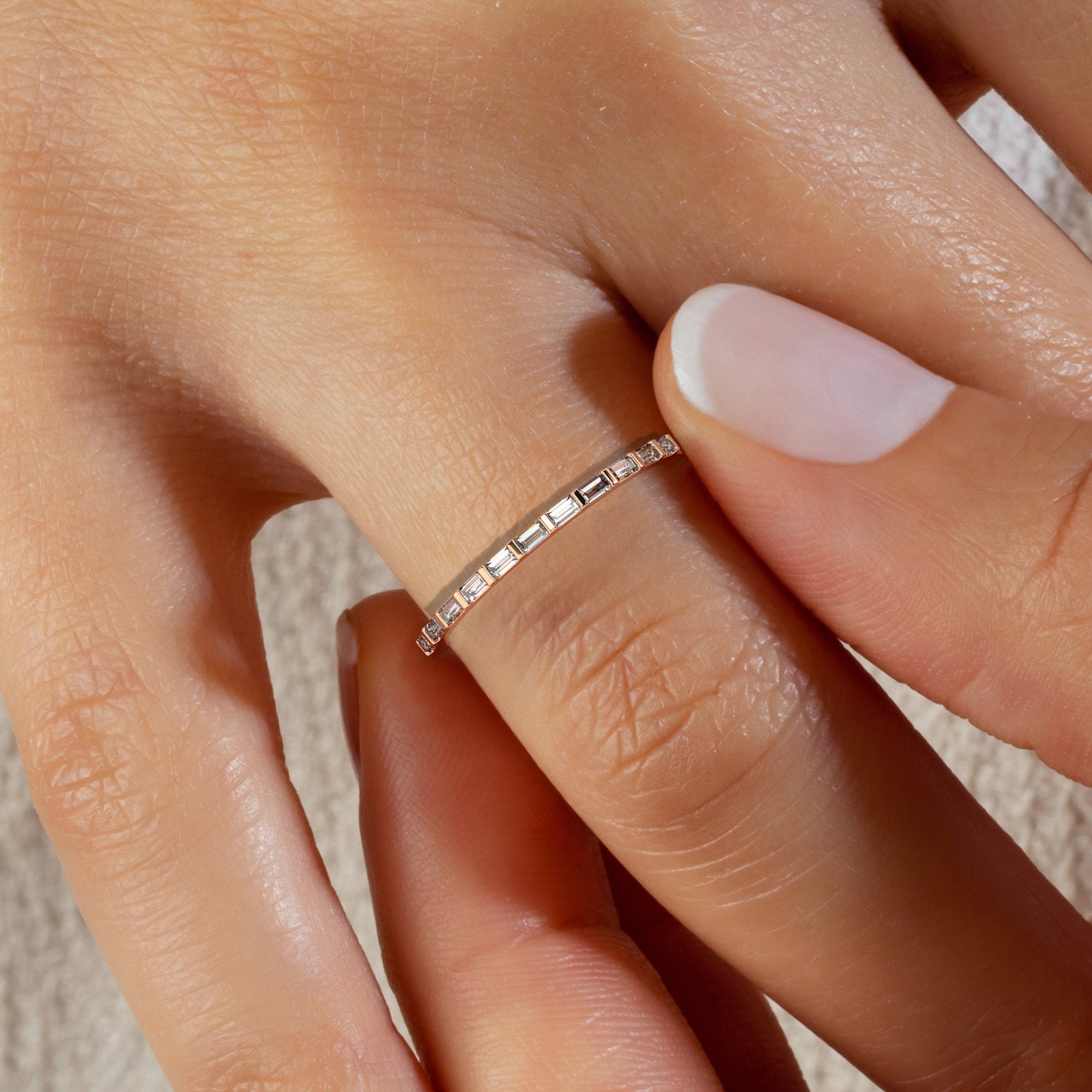 This ring has baguette diamonds covering the front half of the band. You can wear it alone or as a stacking ring.