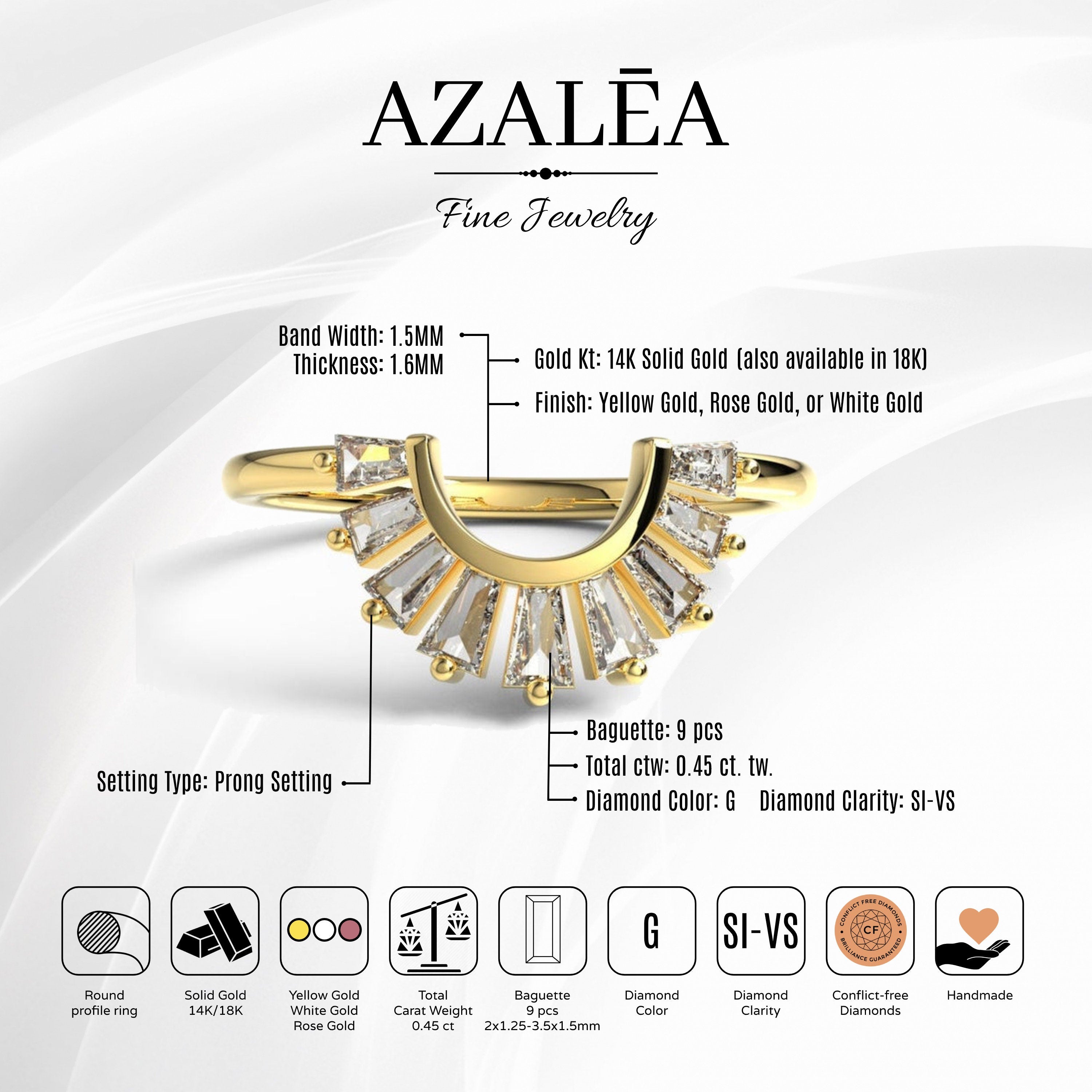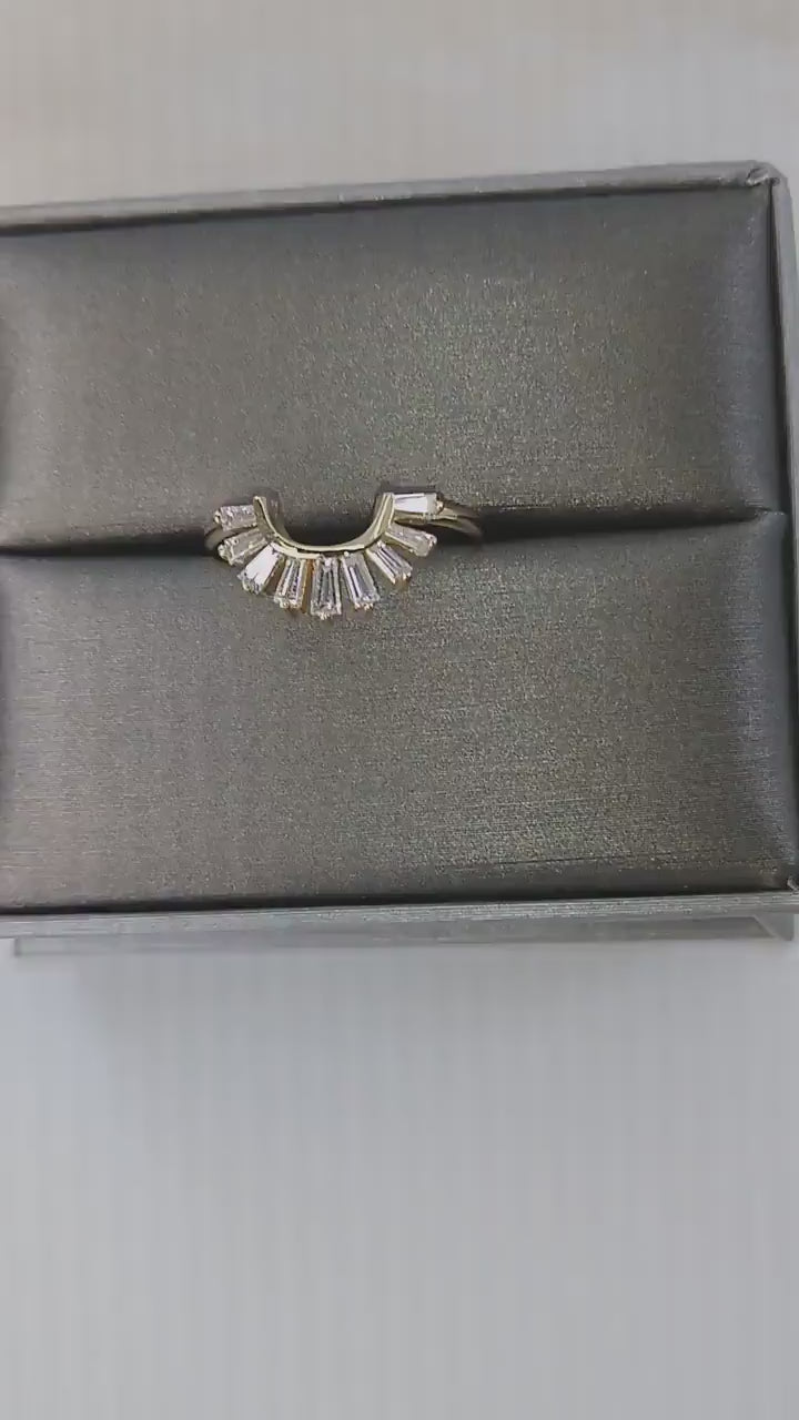 This 14k gold curved baguette diamond ring has 9 baguettes fanned in the center of a curved band, giving the illusion of a crown. You can wear it alone, as a wedding band, or as a stacking ring.
