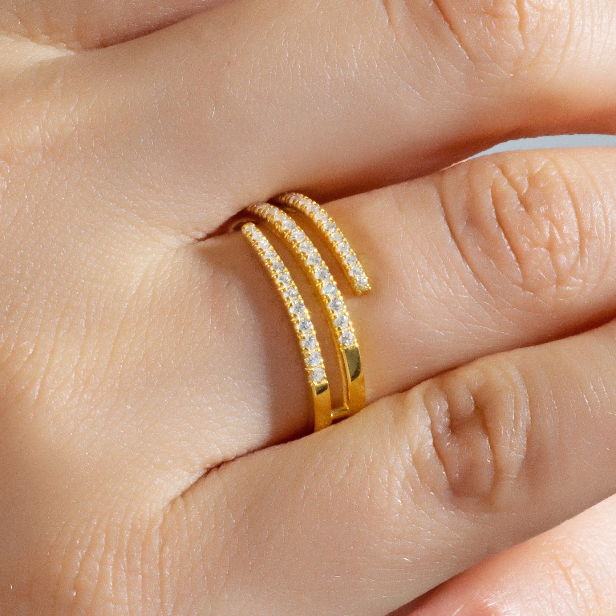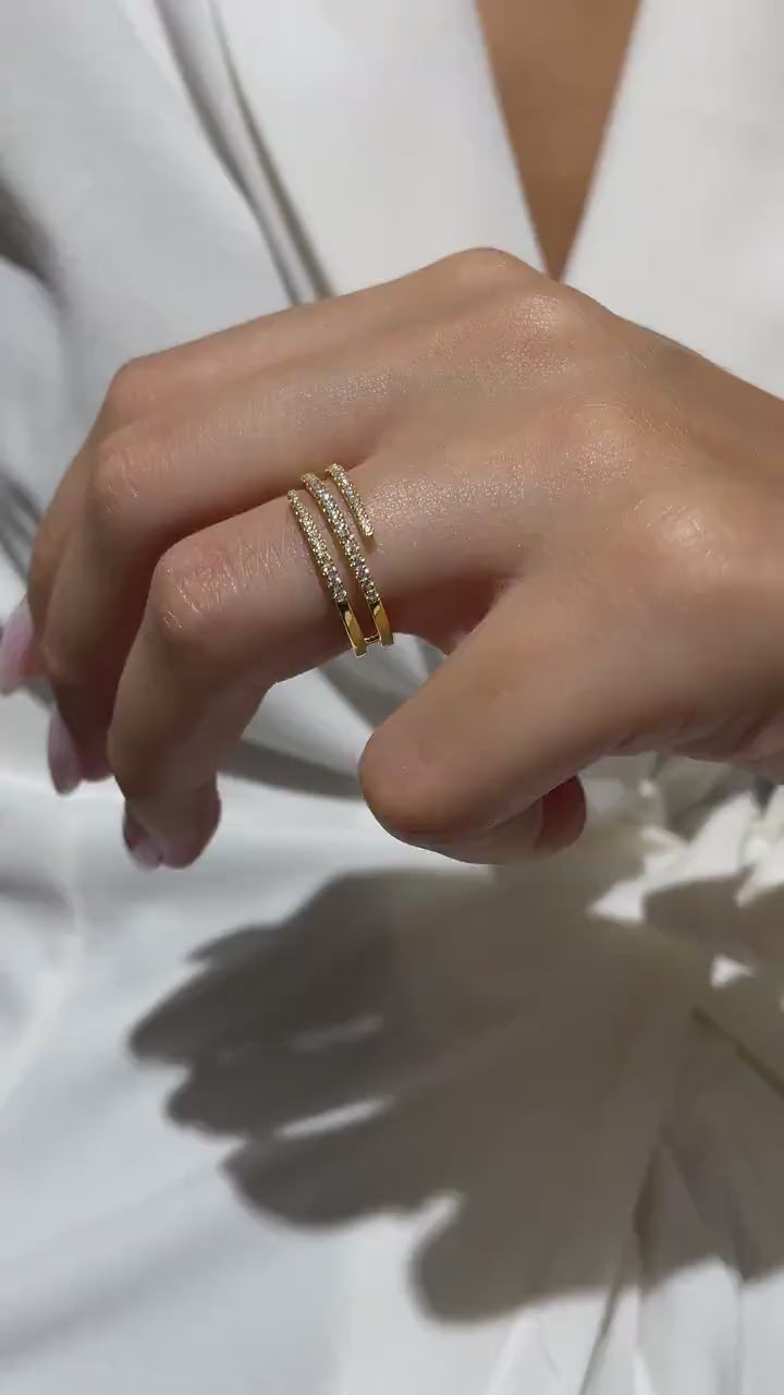 This 14k gold spiral diamond cuff ring has micro diamonds along a unique spiral design. Use as a standalone piece or with stacking rings.