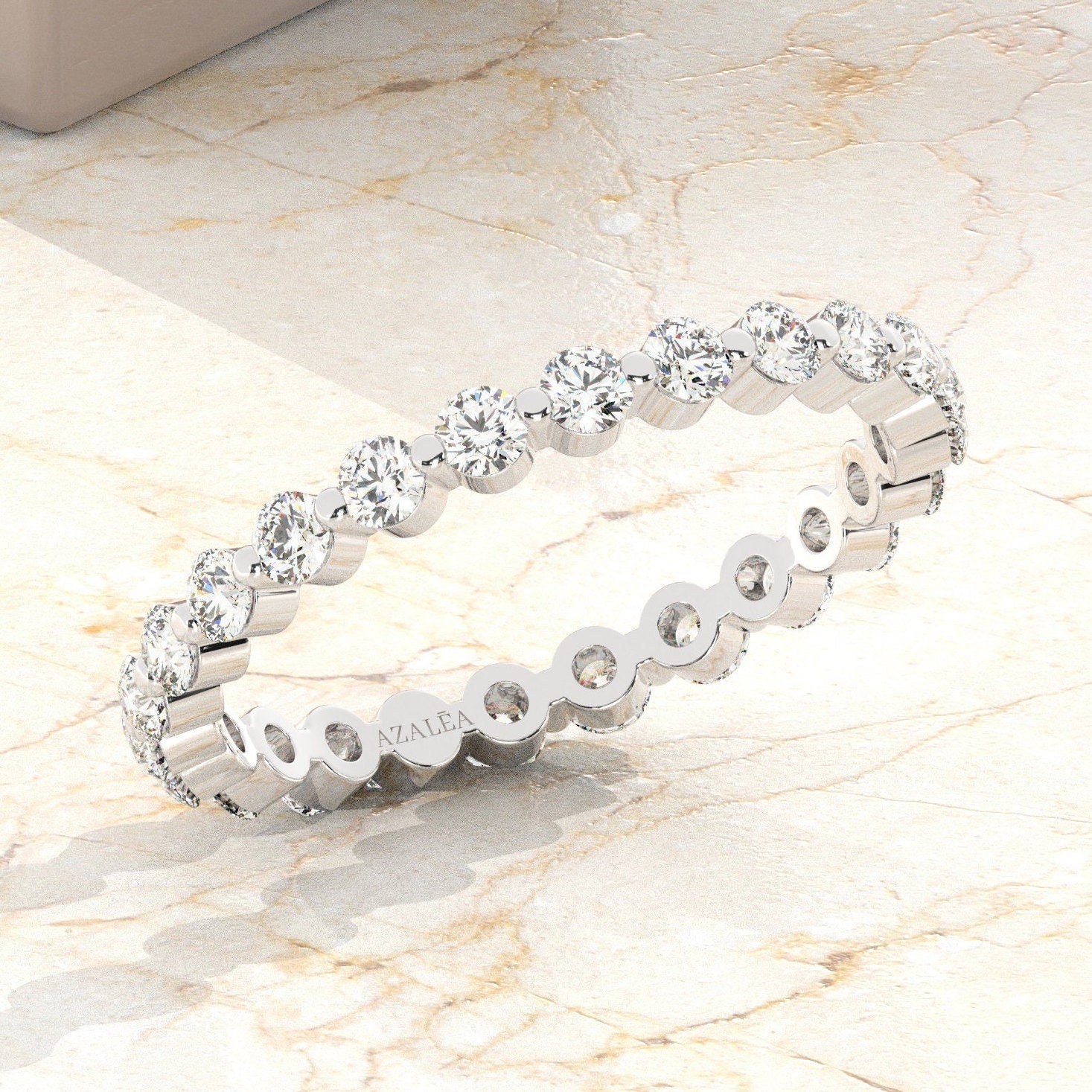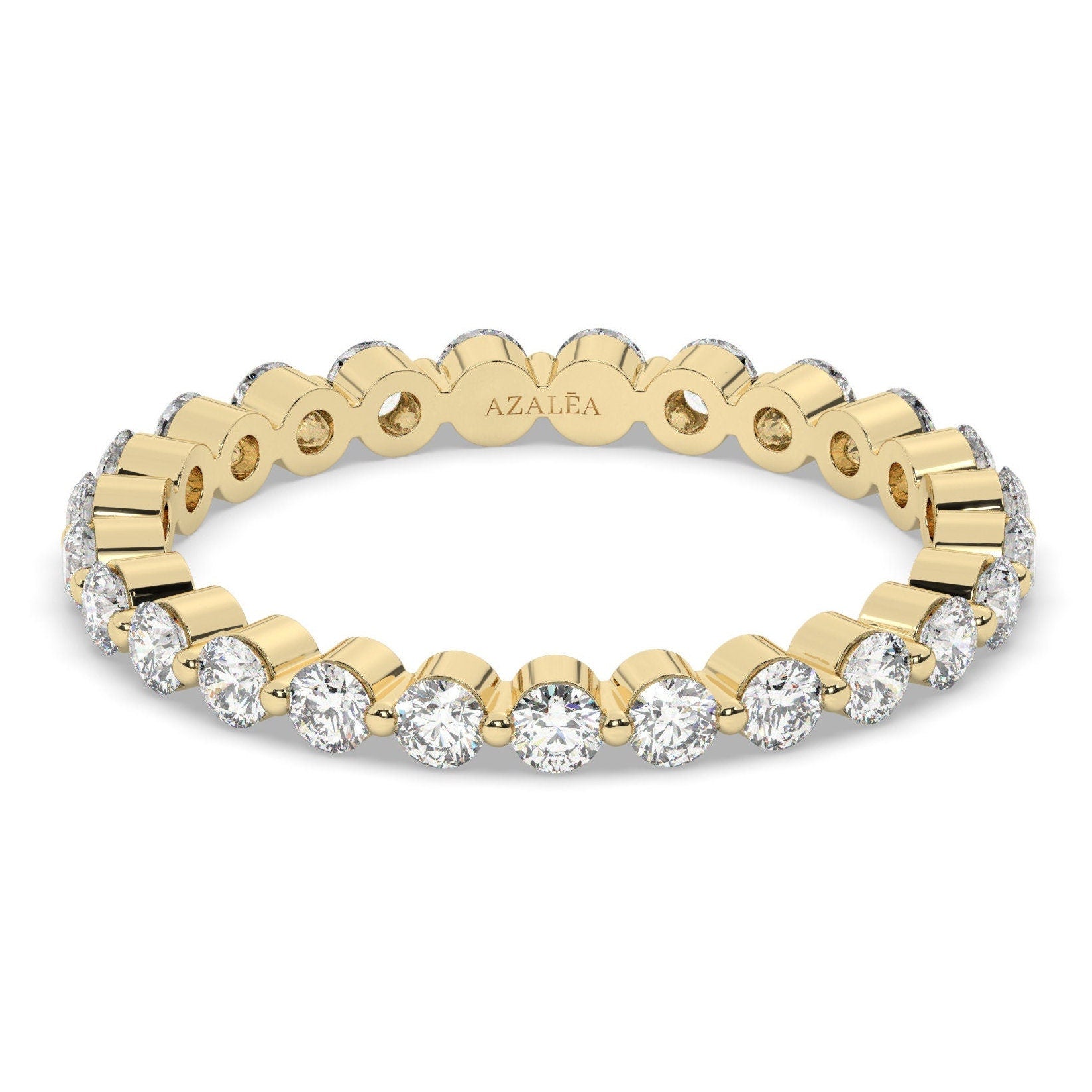 This 14k gold round diamond wedding band has an eternity prong-set band and 24 round diamonds around the entire band. This ring sparkles with every movement. You can also use it as a stacking or wedding band.