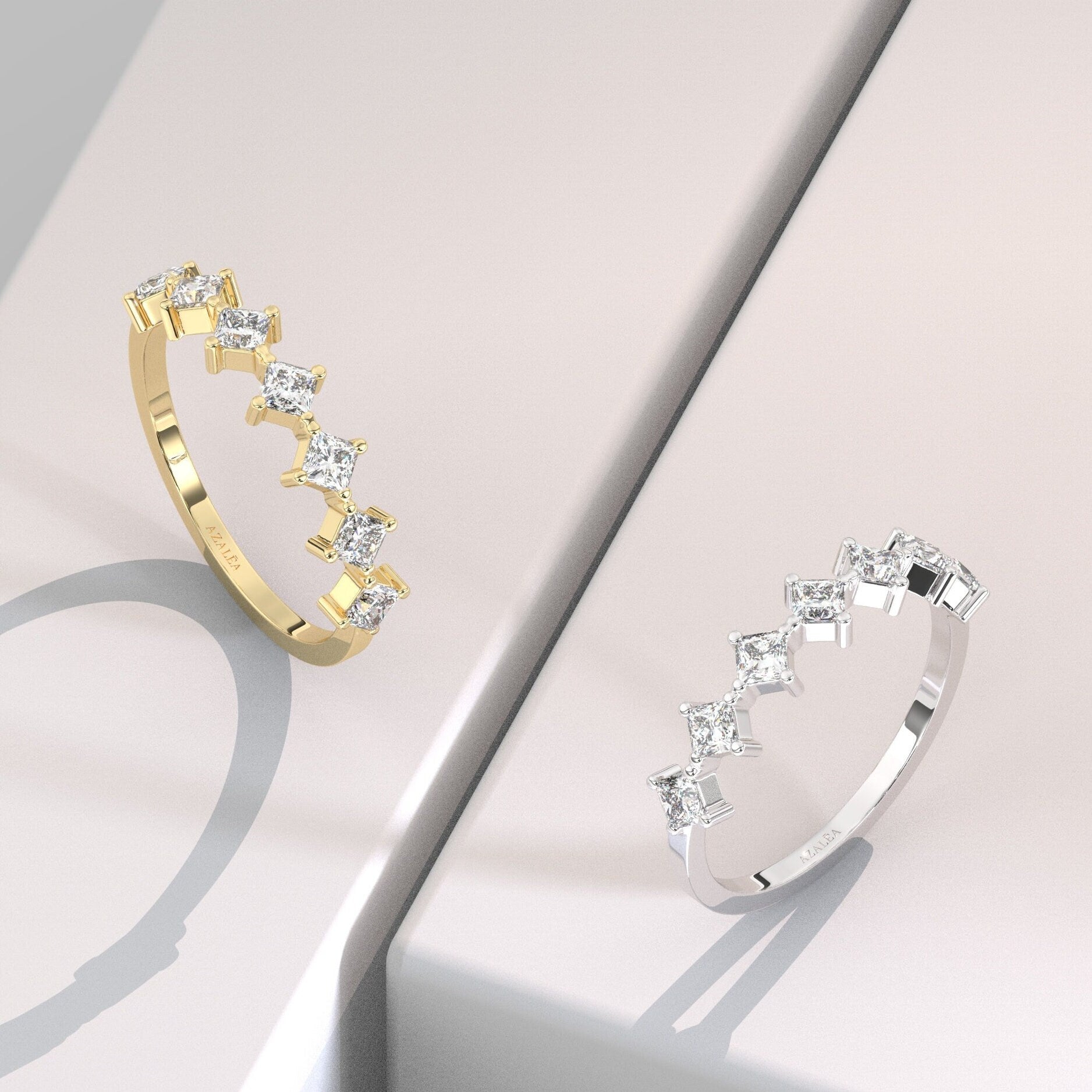 Enhance your love story with our stunning 14k Gold Diamond Wedding Band. This exquisite piece showcases nine prong-set princess cut diamonds, elegantly placed in the center of a solid gold band. Versatile and timeless, it pairs beautifully with any stacking band. Additionally, you have the option to choose lab-grown diamonds or dazzling moissanites for a personalized touch. Order now and symbolize your eternal bond with this captivating wedding band.