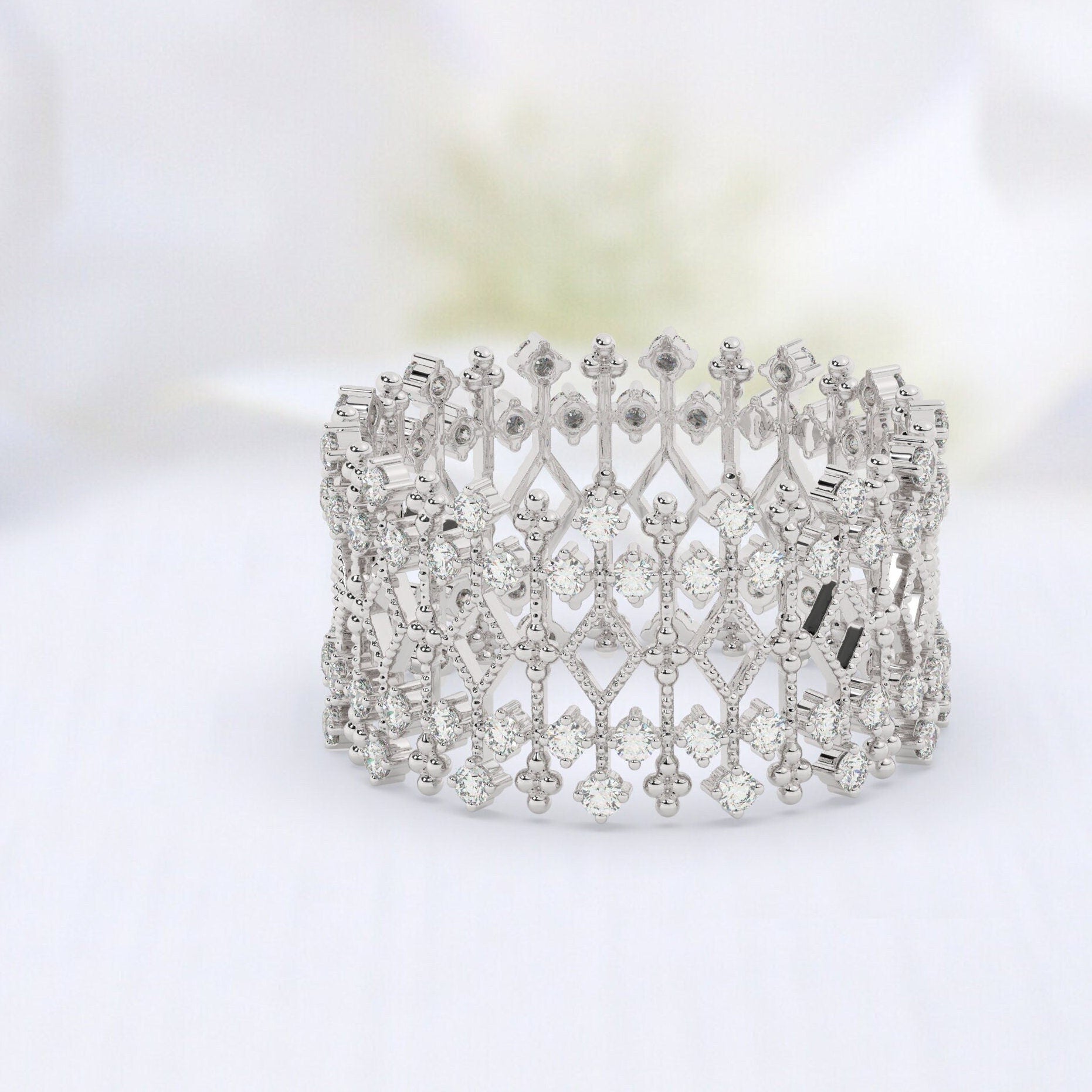 This 14k gold diamond statement ring has a beautiful art deco motif design. Wear as a wedding band or a stacking ring.