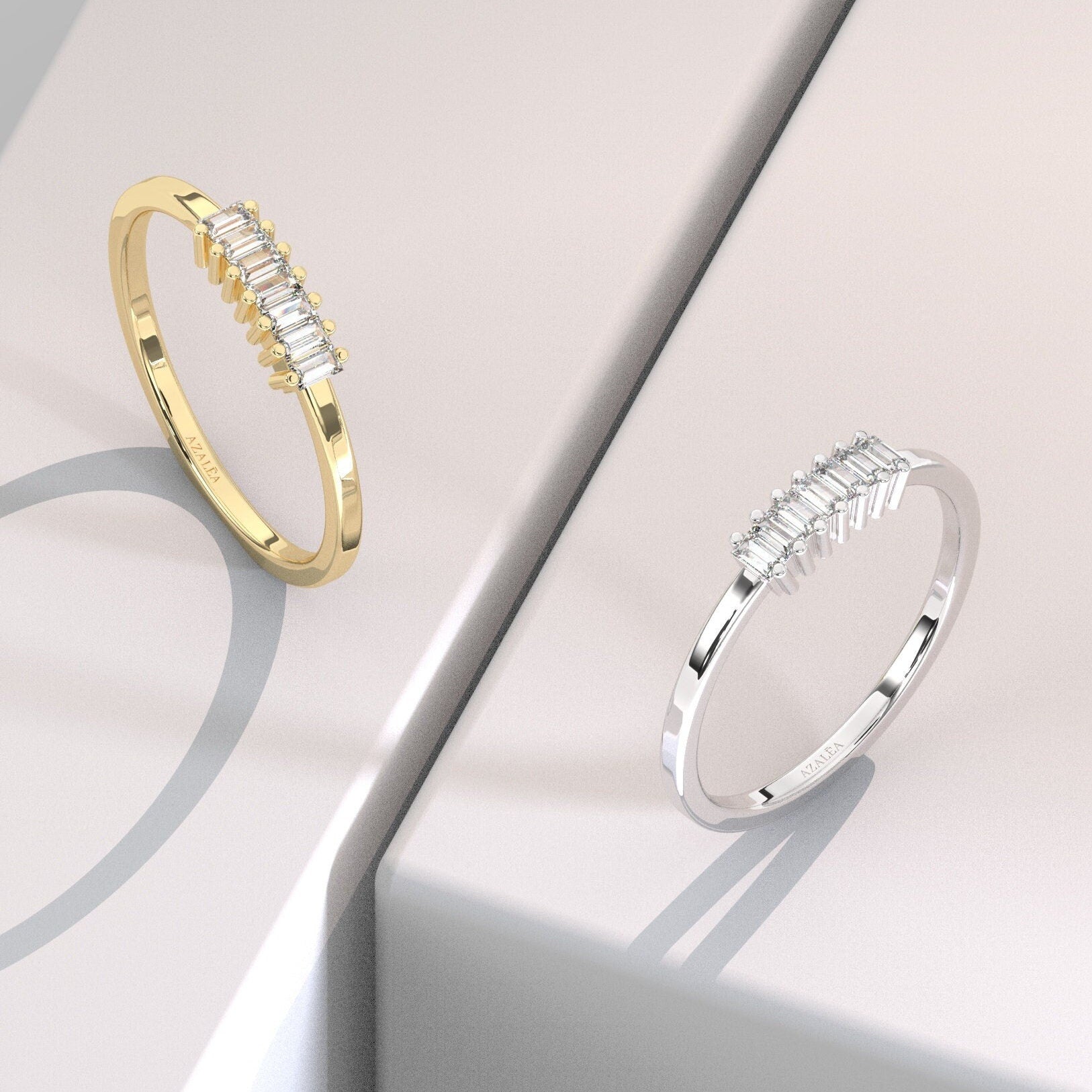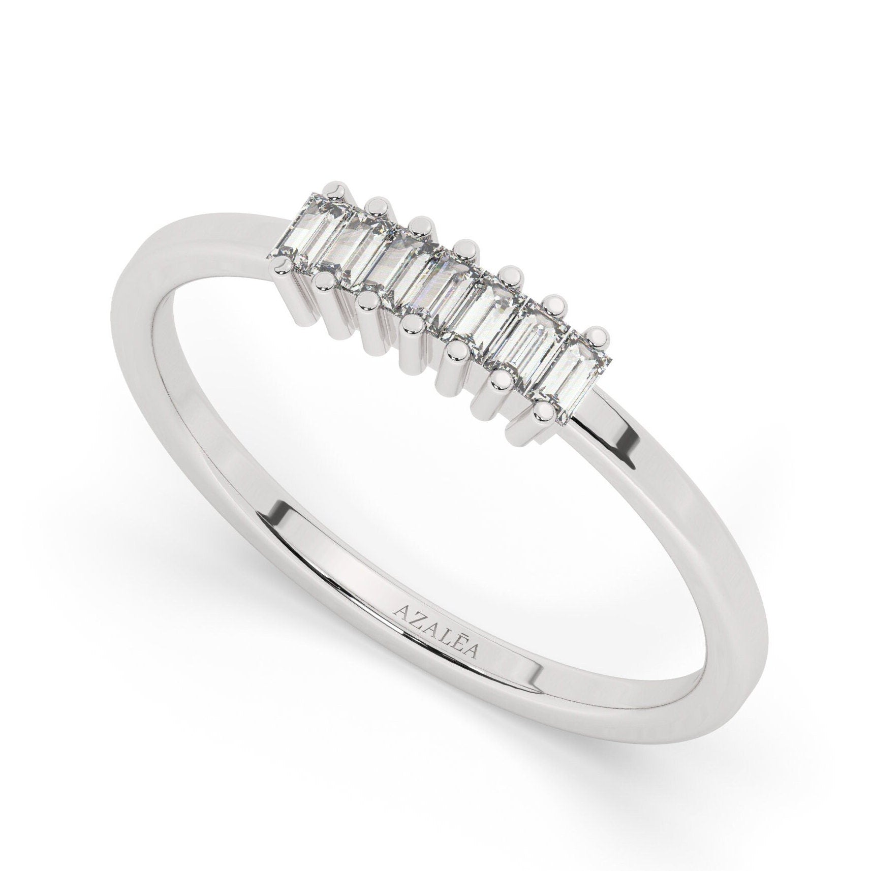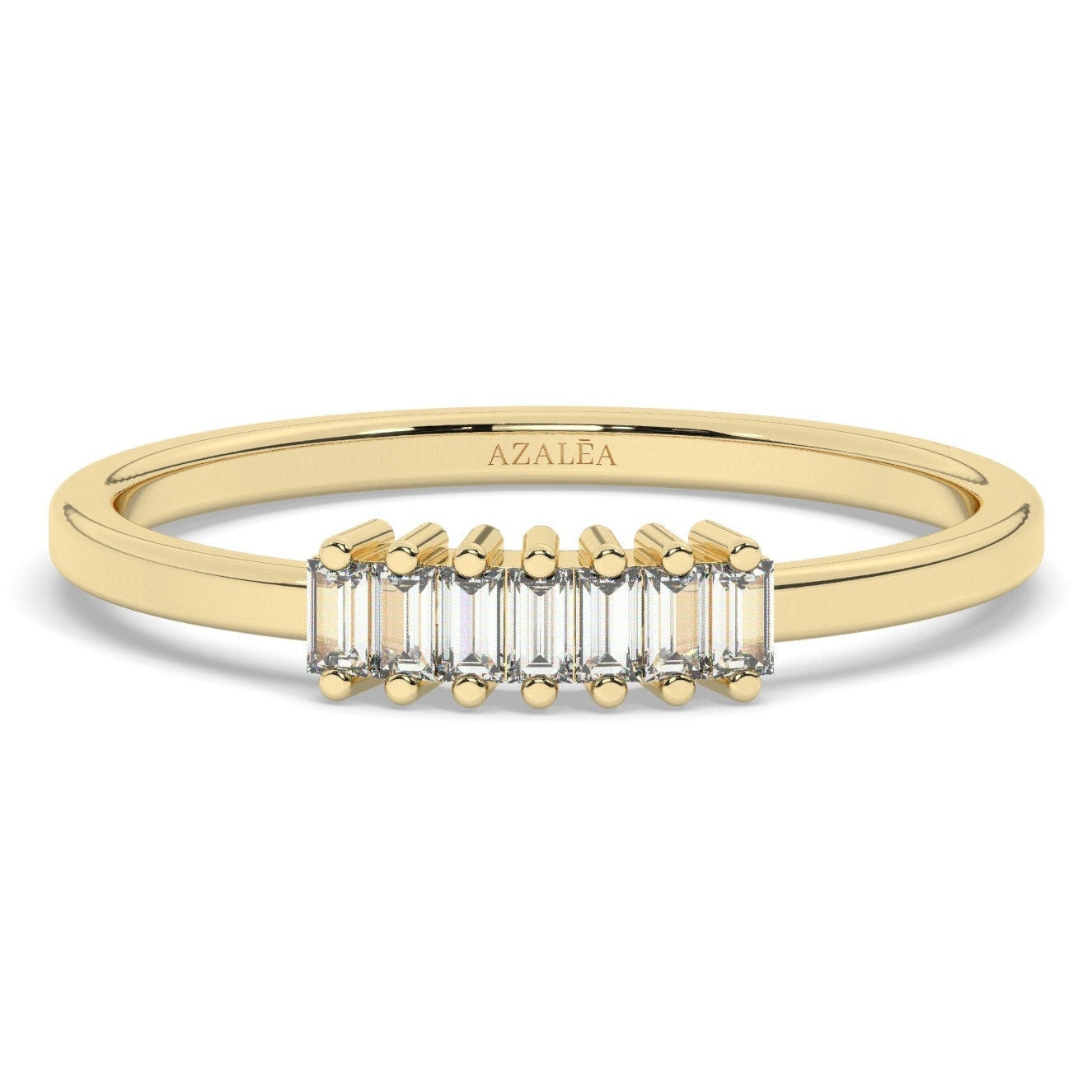 This ring has 7 baguette diamonds sitting vertically in the center of the band. You can wear it alone or as a stacking ring.