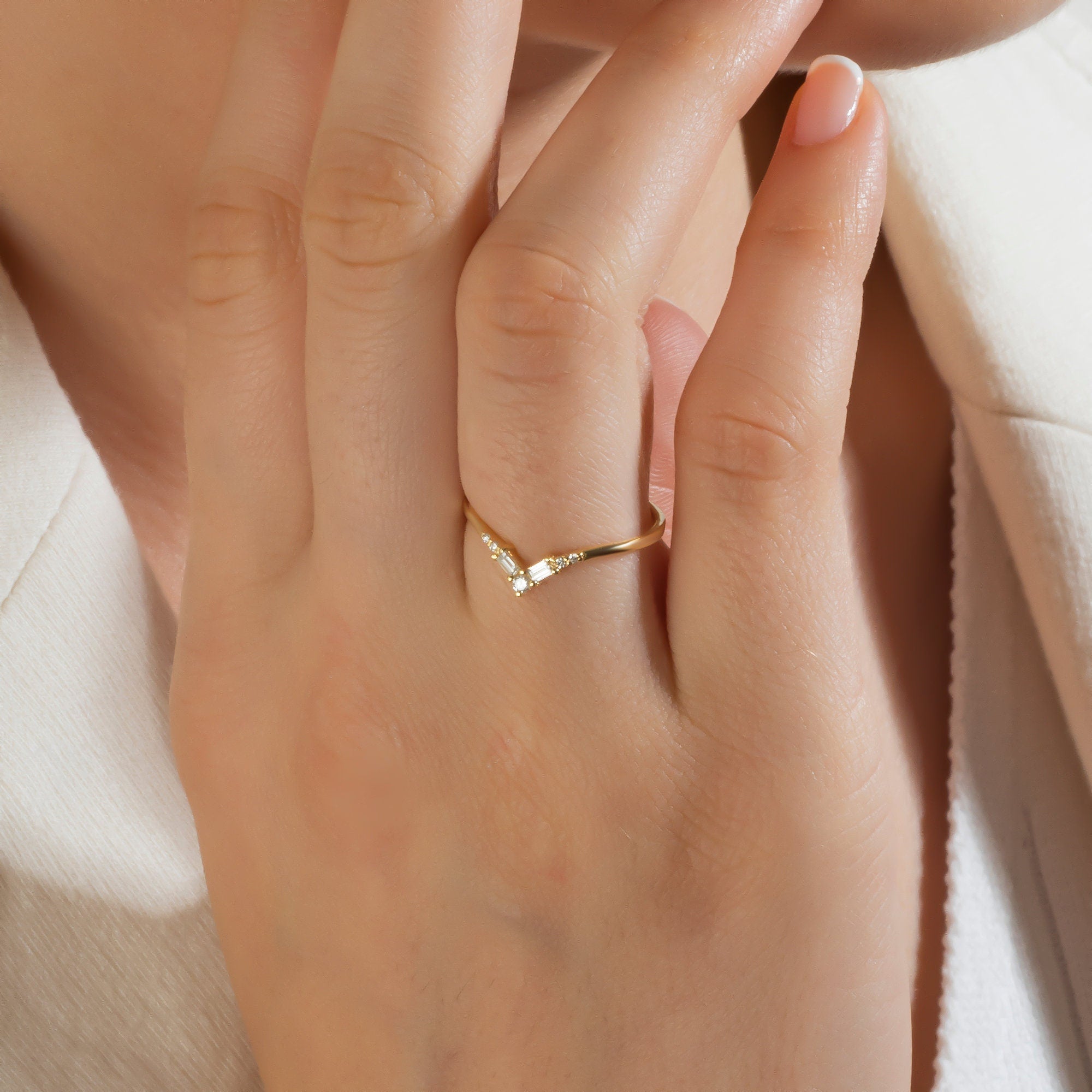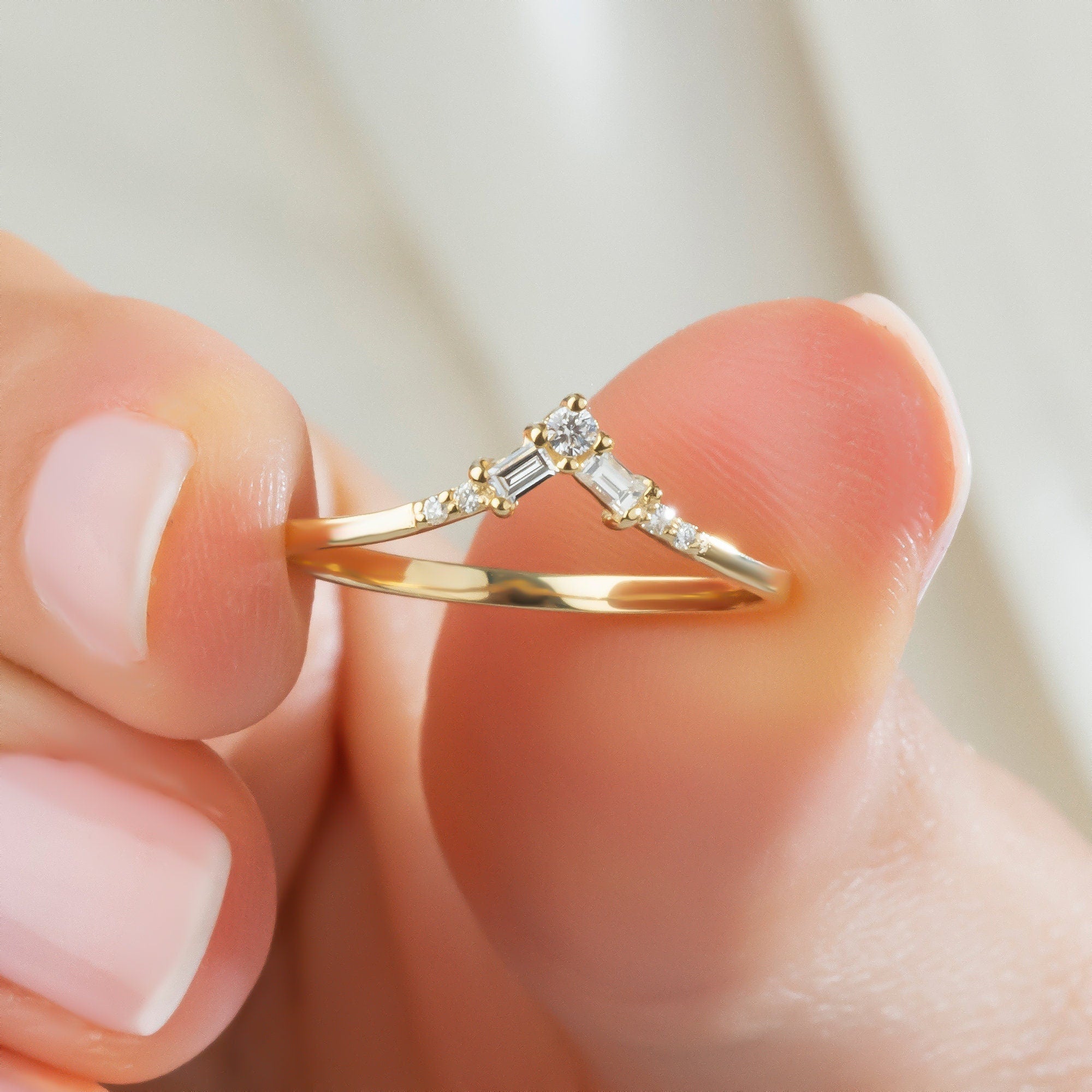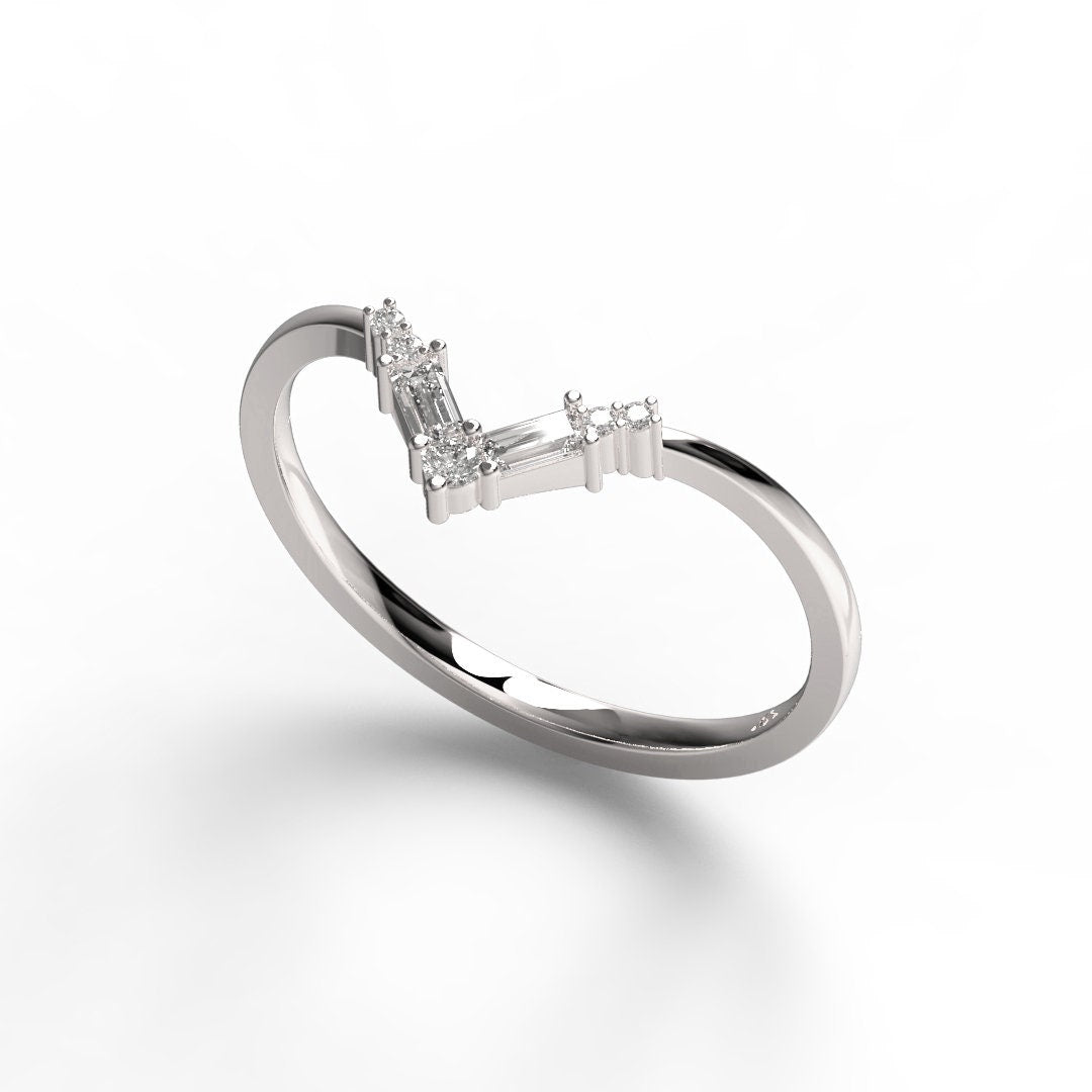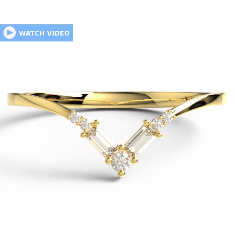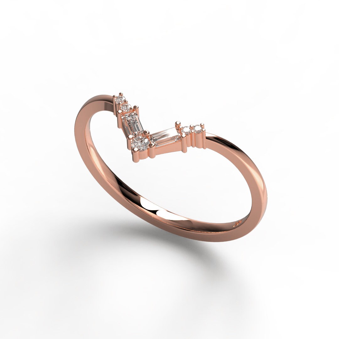 14k Gold Baguette Round Diamond Chevron Ring / Curved Diamond Wedding Band / V Ring / Anniversary Ring / Contour Wedding Band