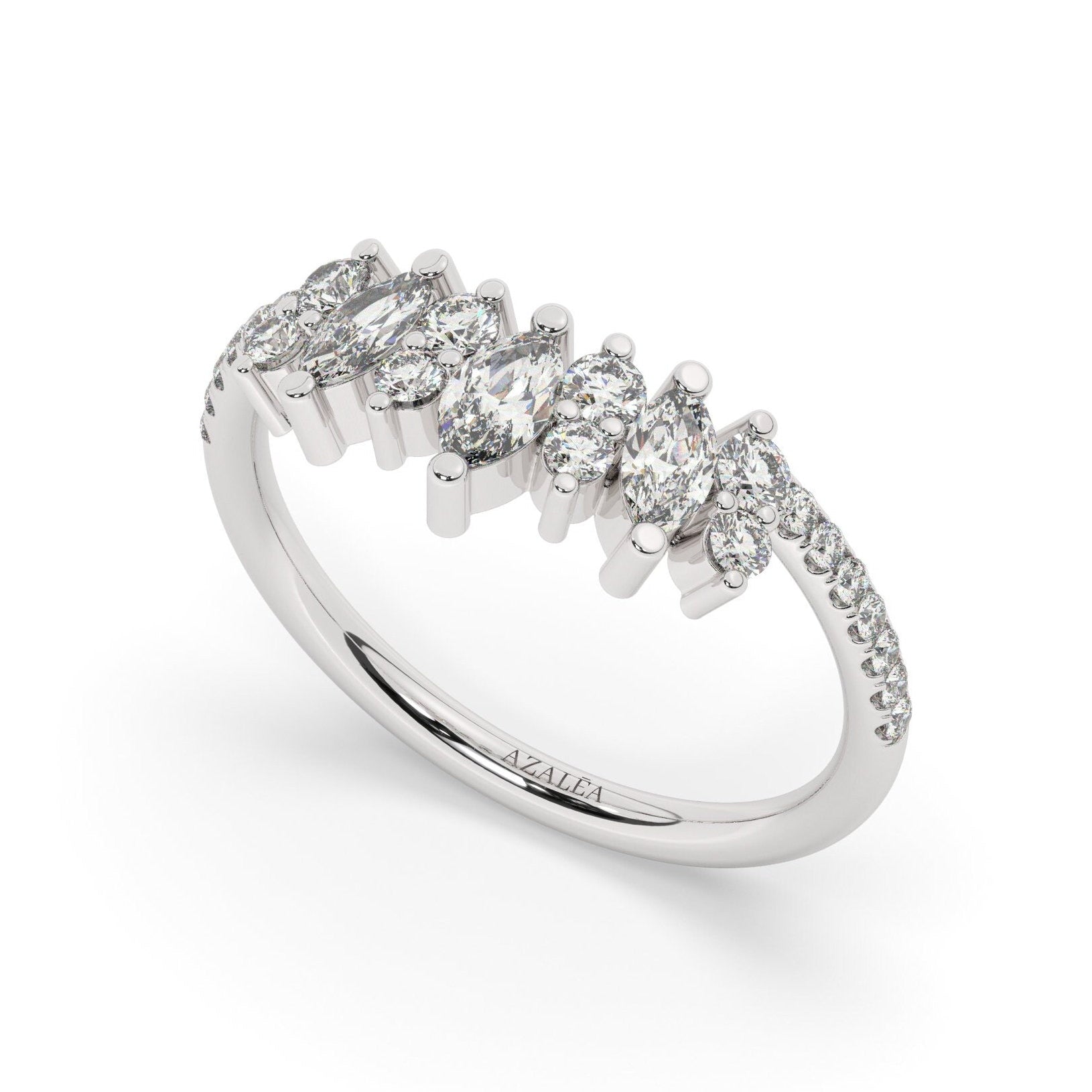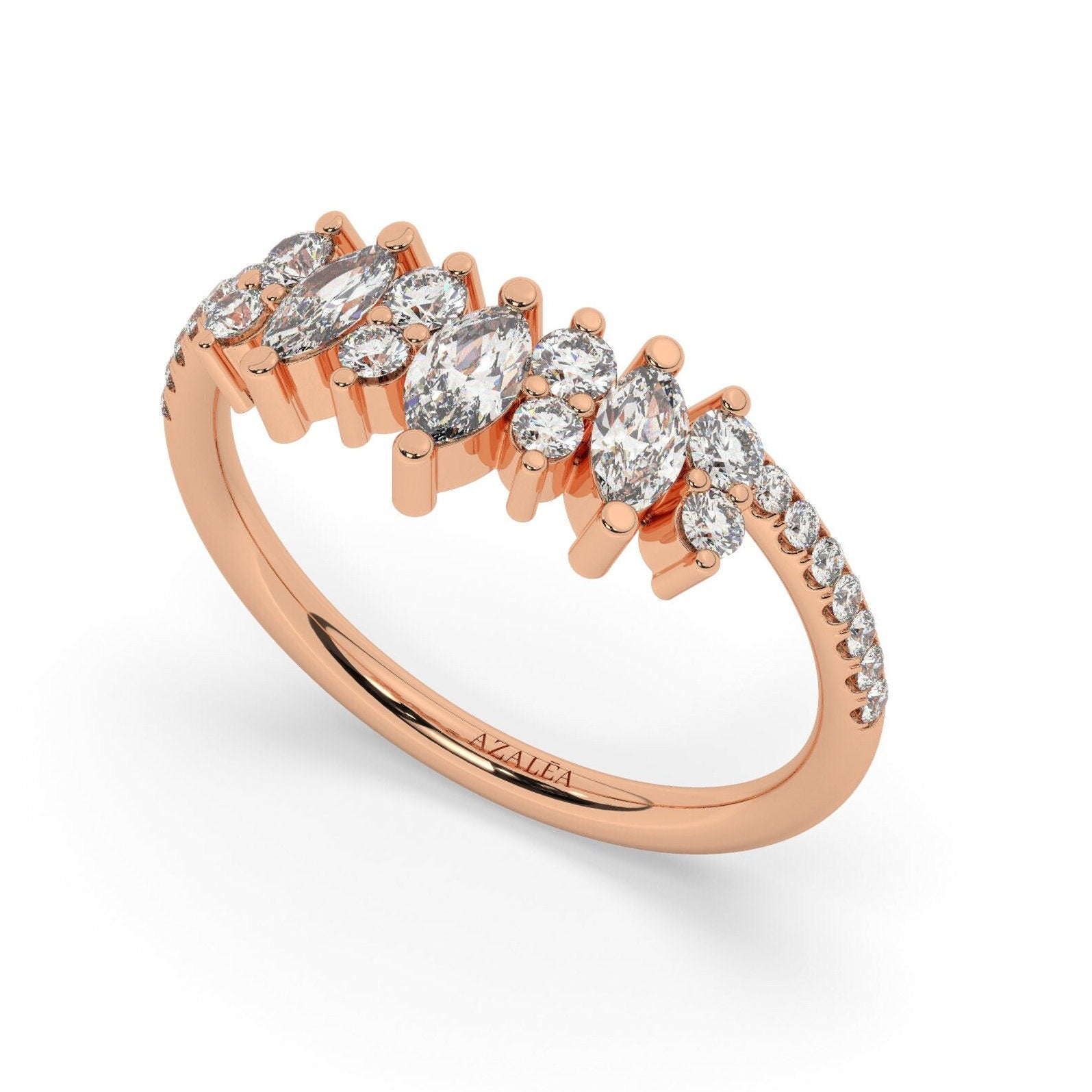Elevate your style with this 14k gold curved wedding band, featuring an alternating cluster of 8 round diamonds and 3 marquise diamonds on a diamond band. Versatile and stunning, it's perfect as a stacking ring or wedding band.