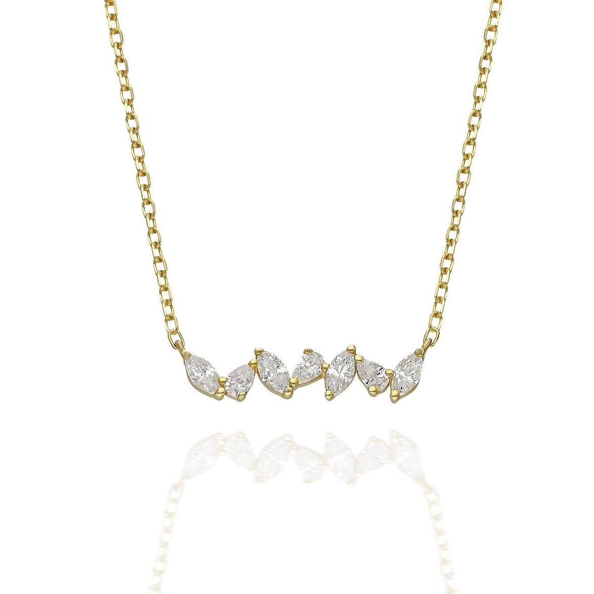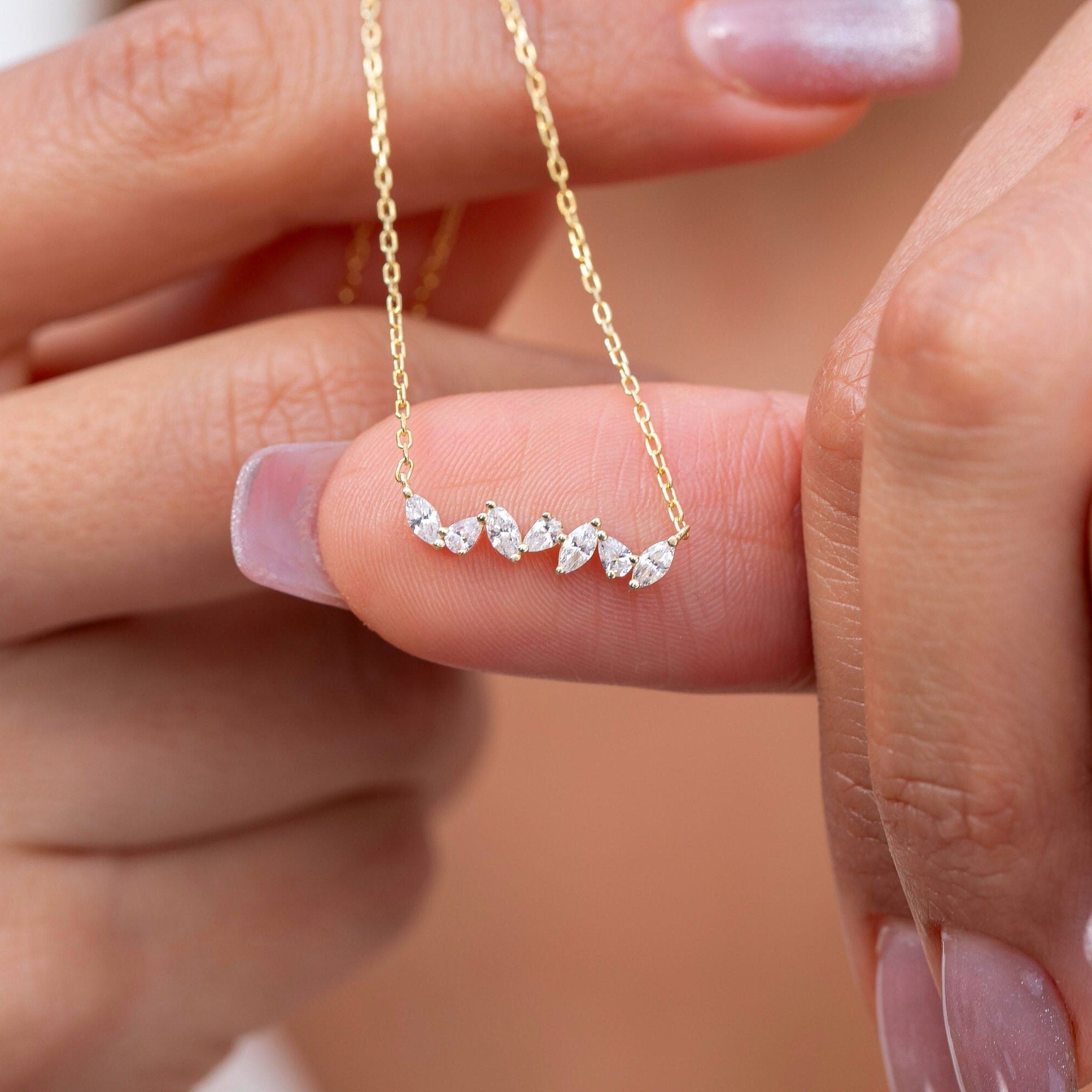 14k Gold Diamond Bar Necklace: Marquise & Pear Cut Stones