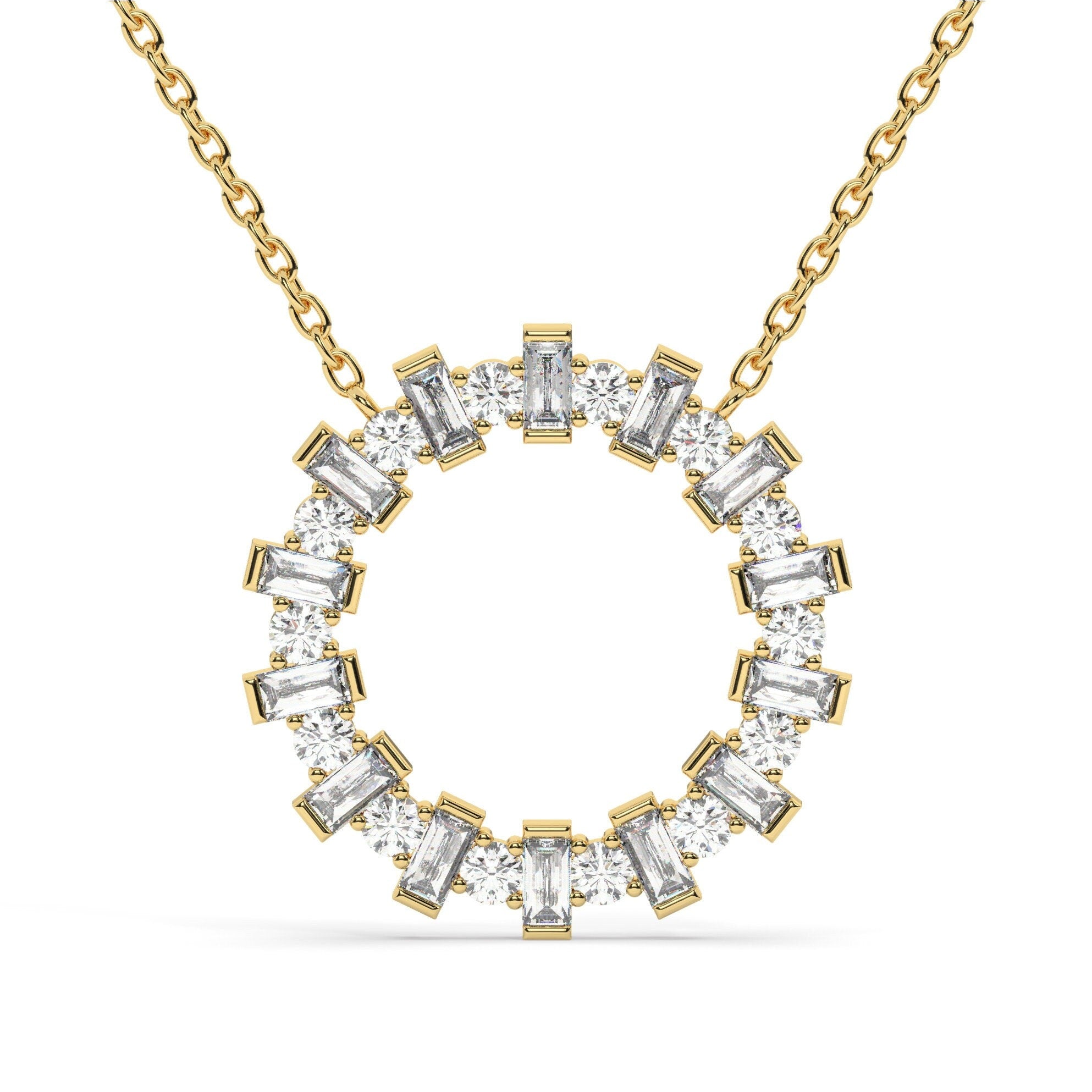14k Gold Diamond Circle Pendant Necklace: Baguette & Round Cut