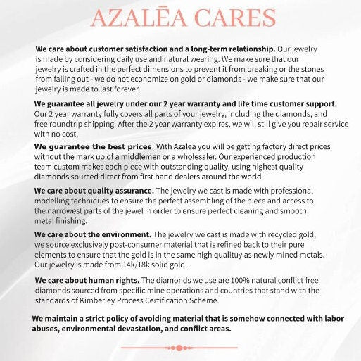 Each piece is accompanied by an Azalea Certification and Warranty card, ensuring that you receive a high-quality, authentic piece of fine jewelry. Please message us if you don't receive your certification with your piece.