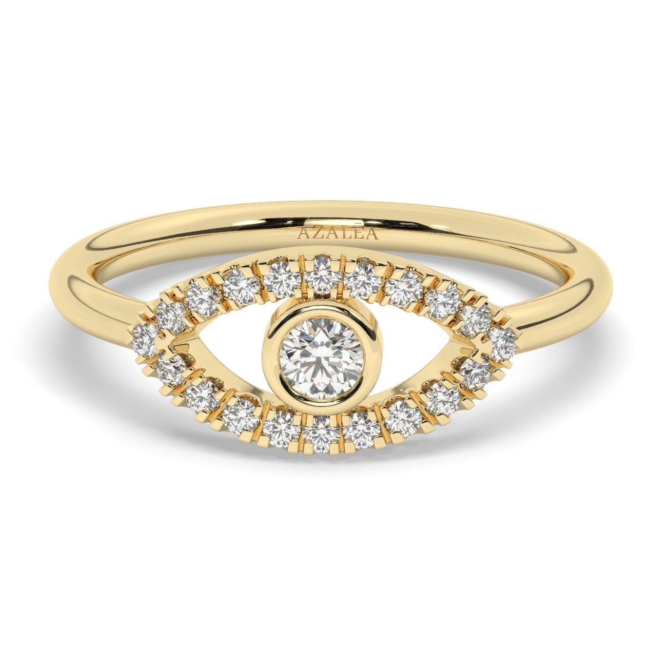 This 14k gold diamond ring has an open evil eye design, and pairs well with any stacking band.