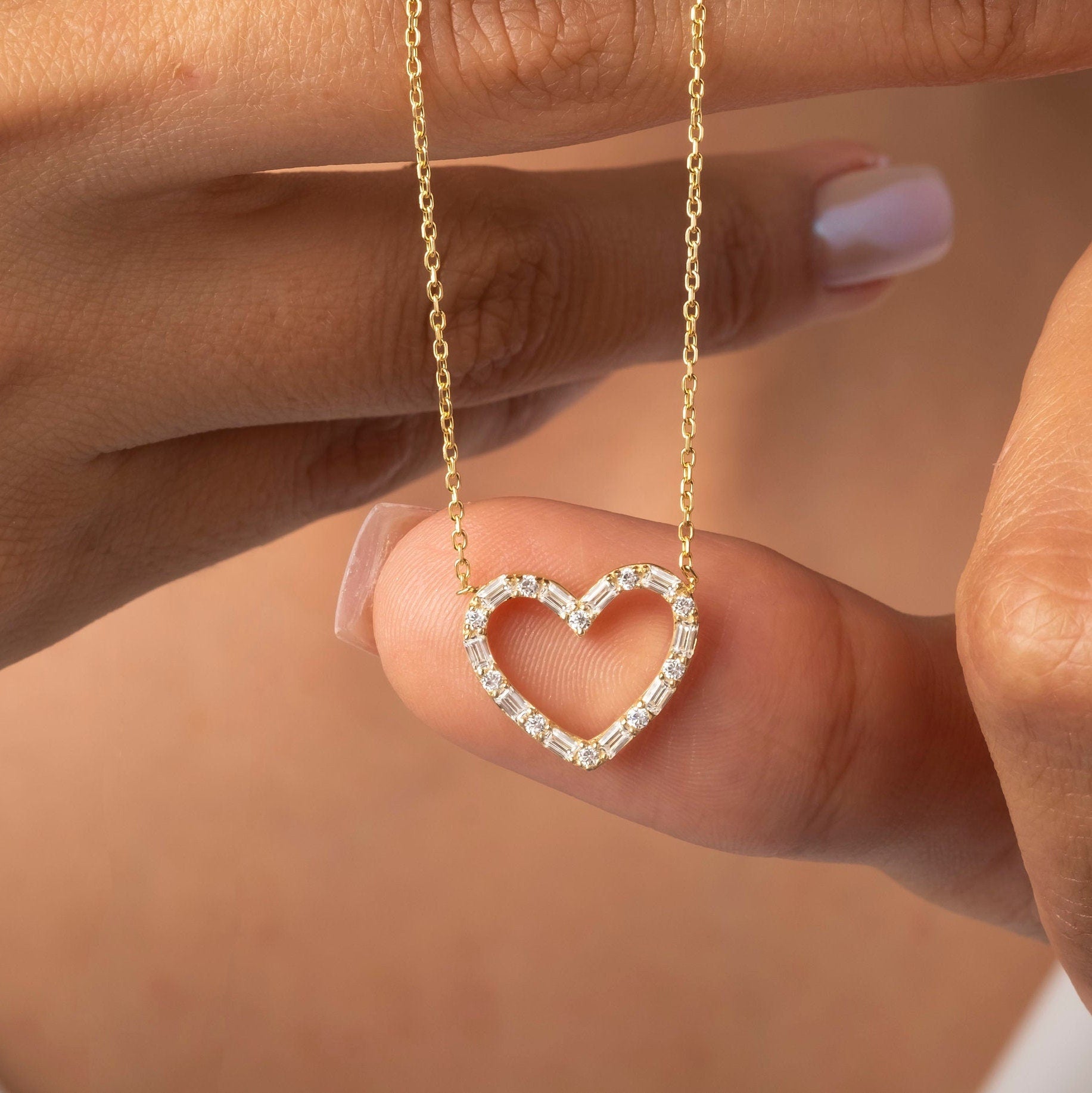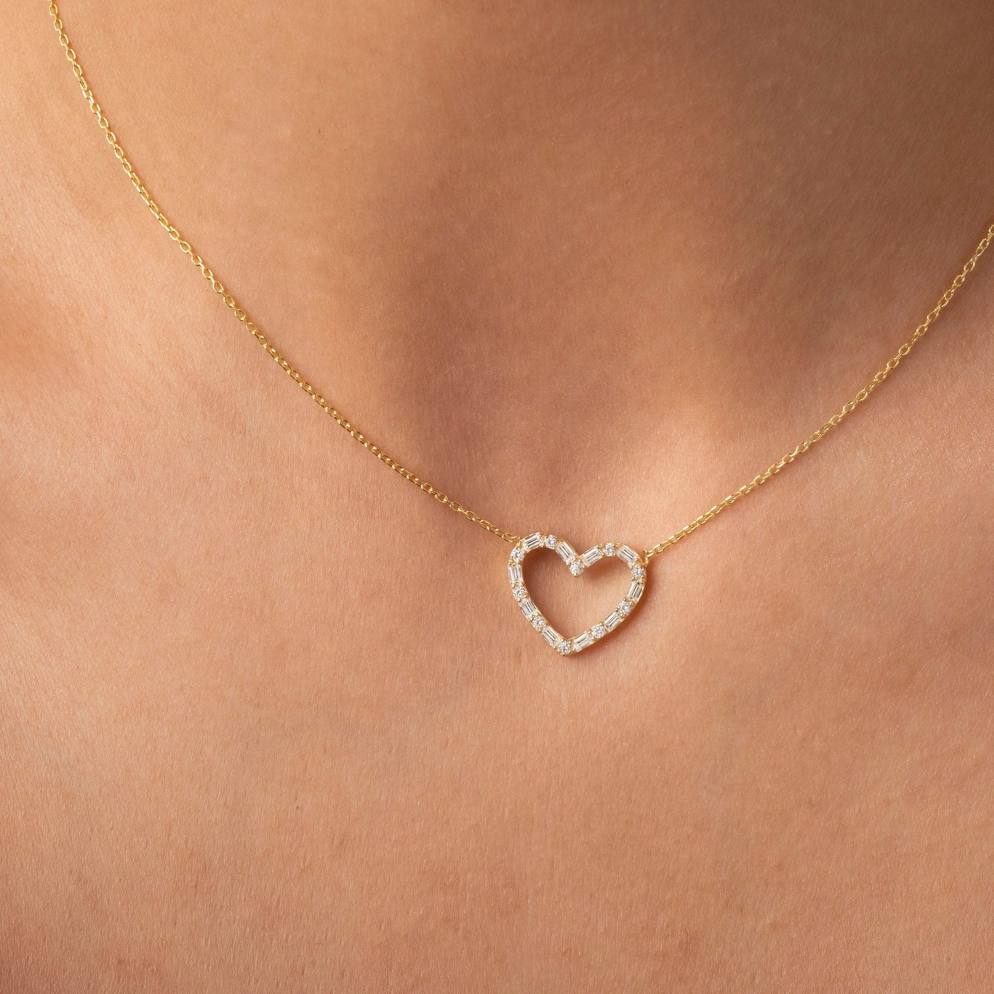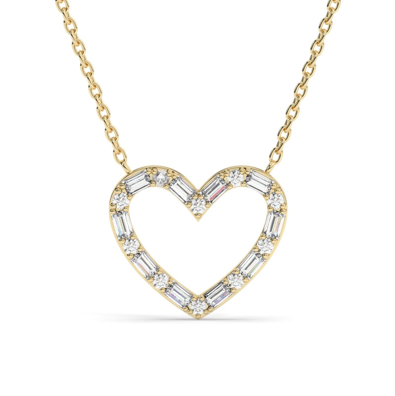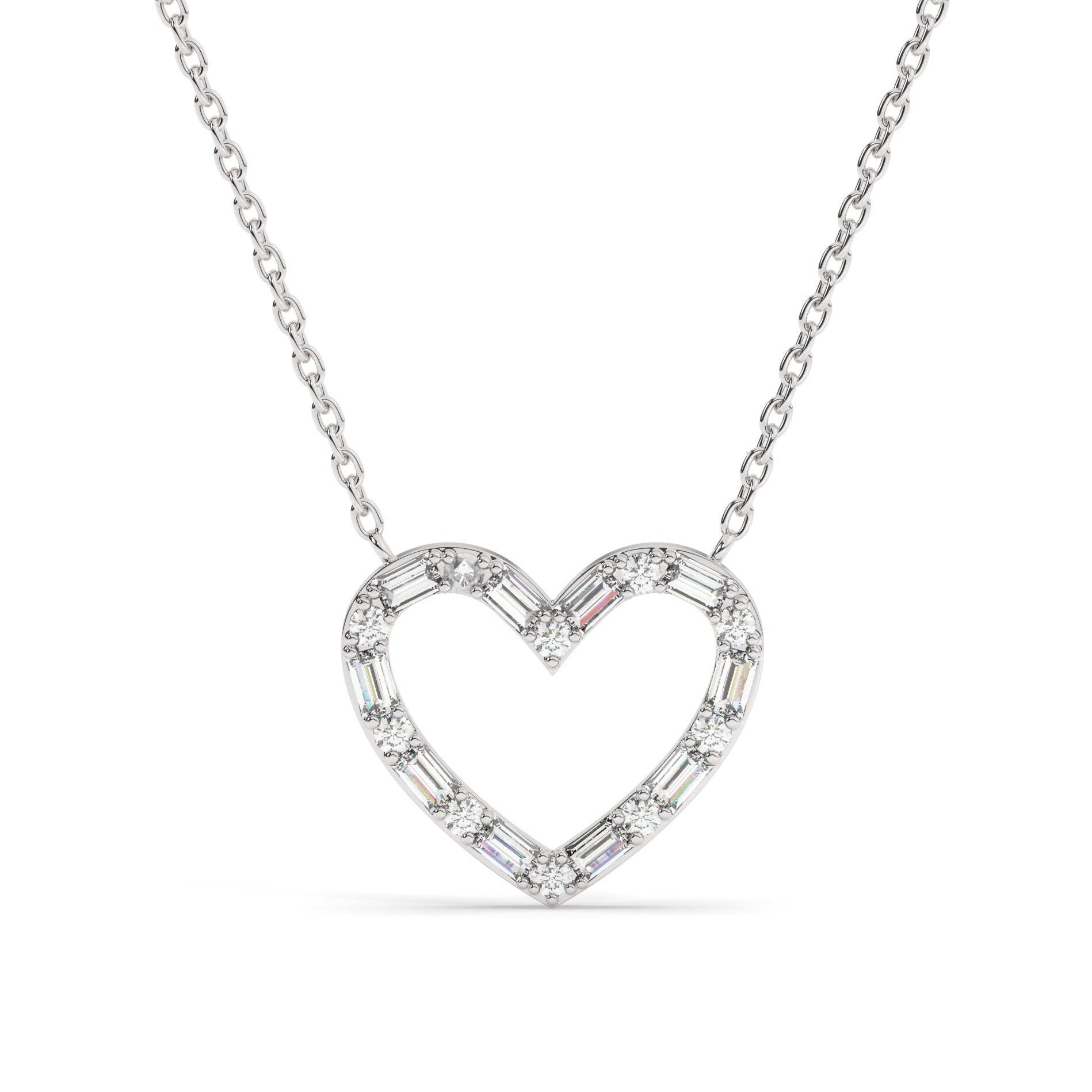 14k Gold Diamond Heart Necklace: Baguette Open Heart Pendant