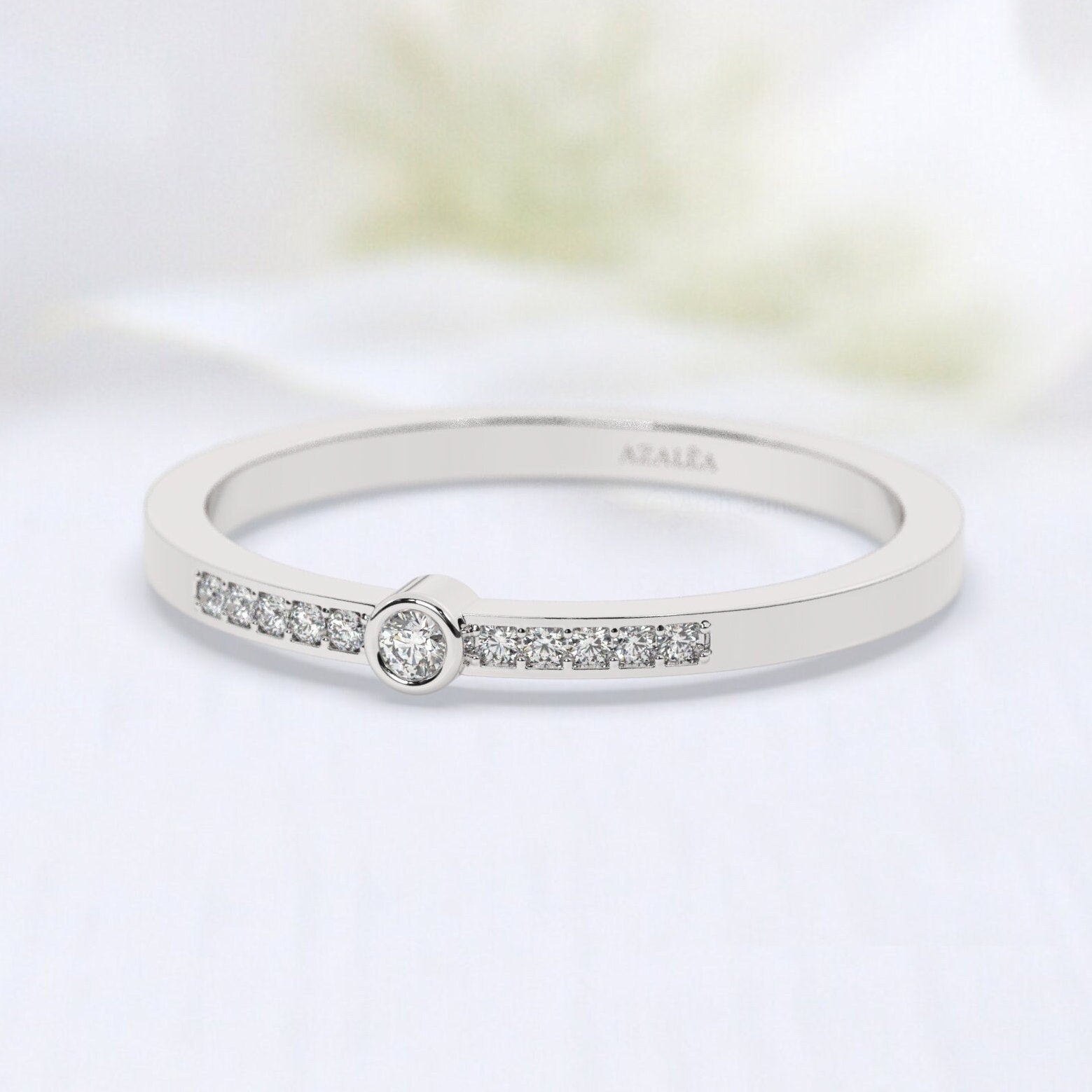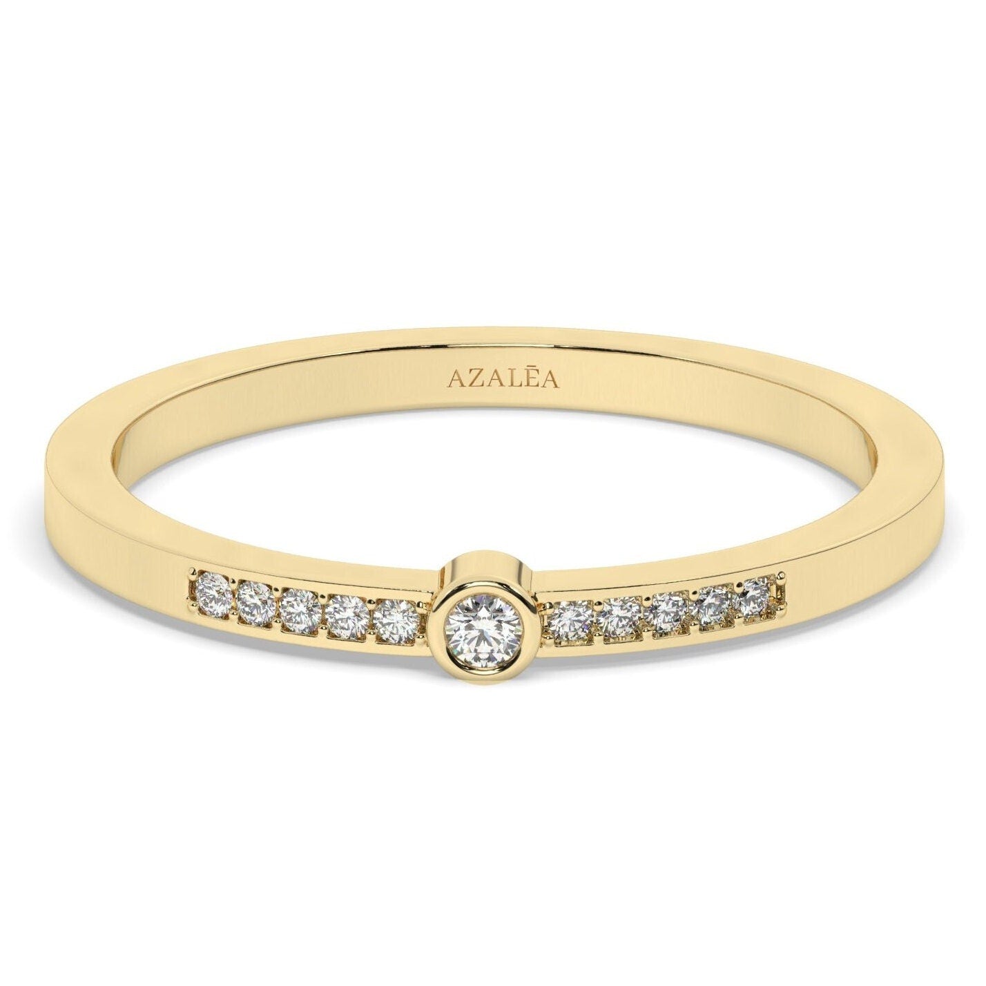 This 14k gold bezel-set band has 7 diamonds along the front half of the band and sparkles with every movement. You can also use it as a stacking or wedding band.