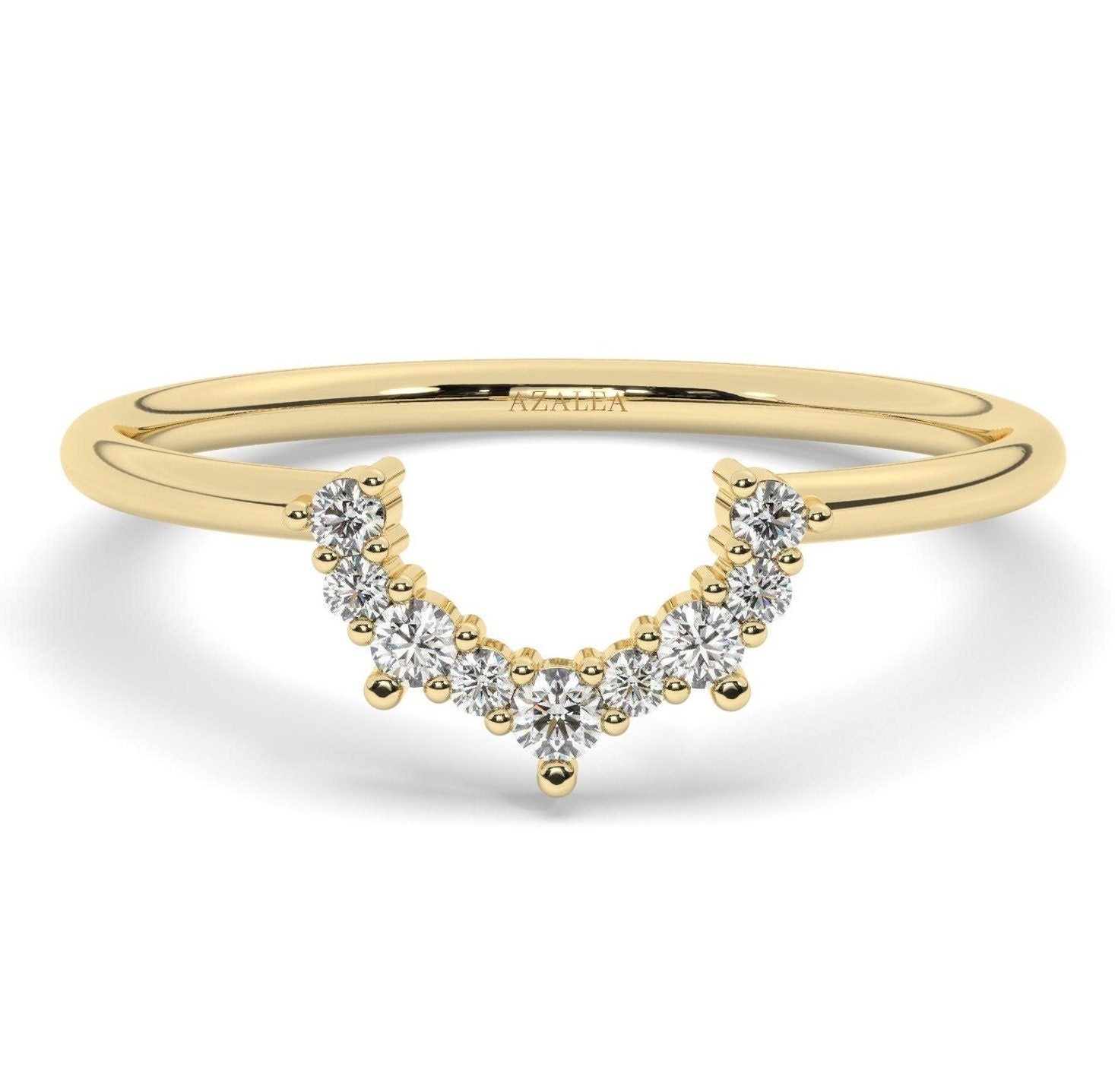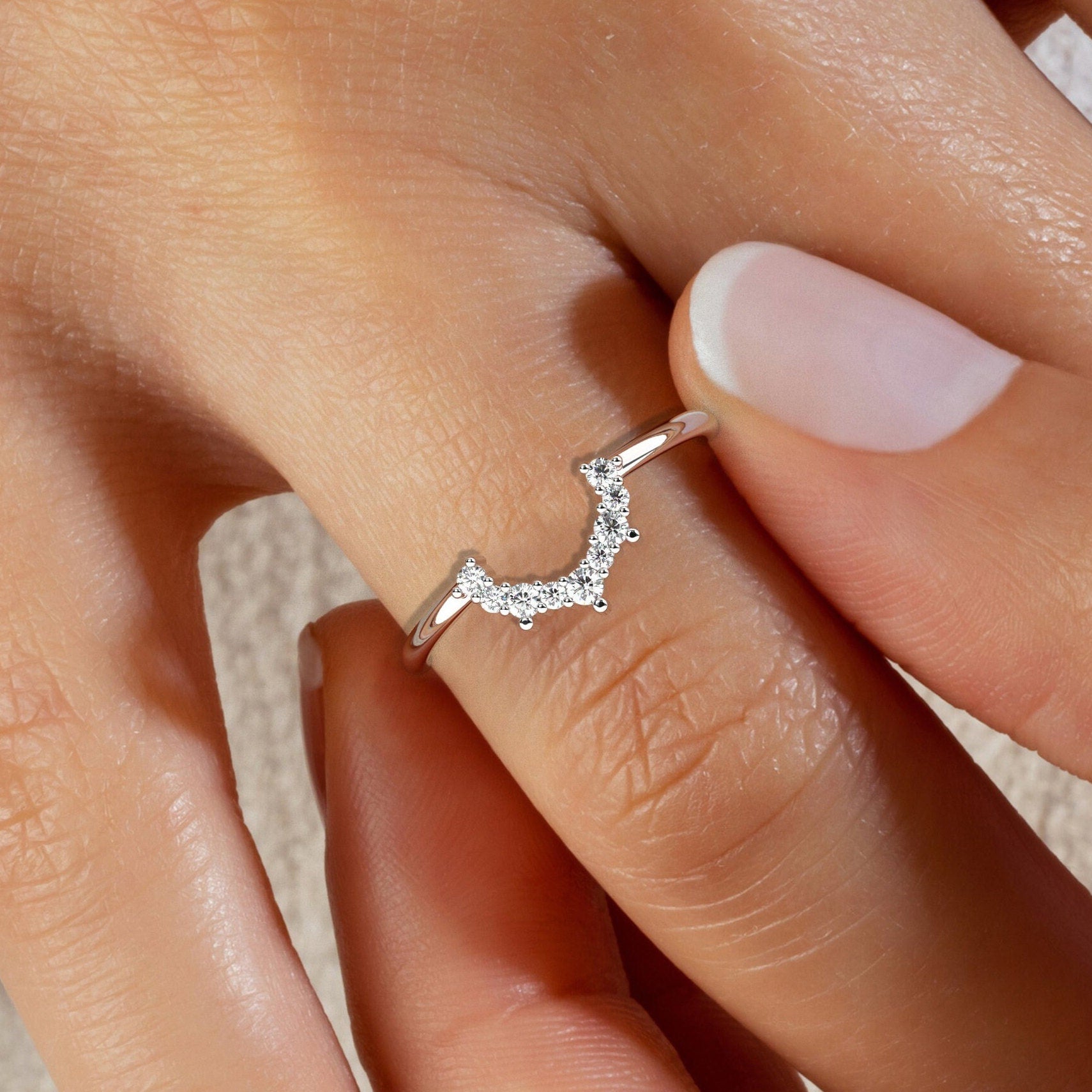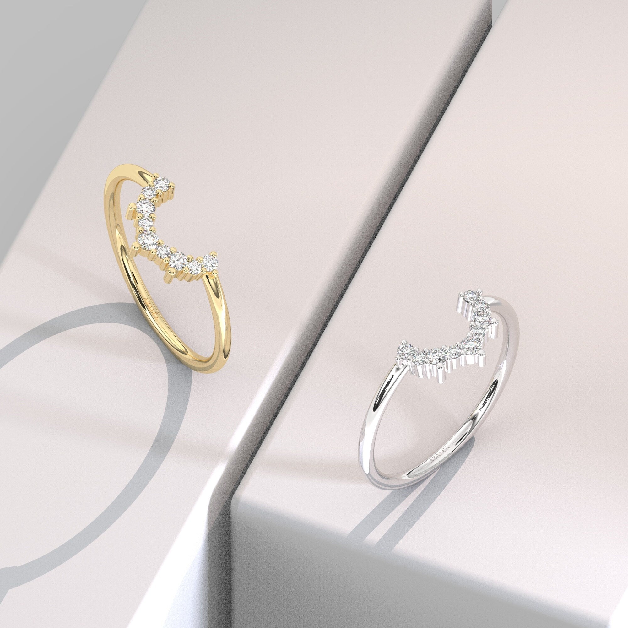 Enhance your wedding set with our 14k gold curved ring, perfect for stacking with 1.5-2 carat round, pear, and oval-shaped rings. Shop now for the perfect fit and elevate your bridal jewelry collection.
