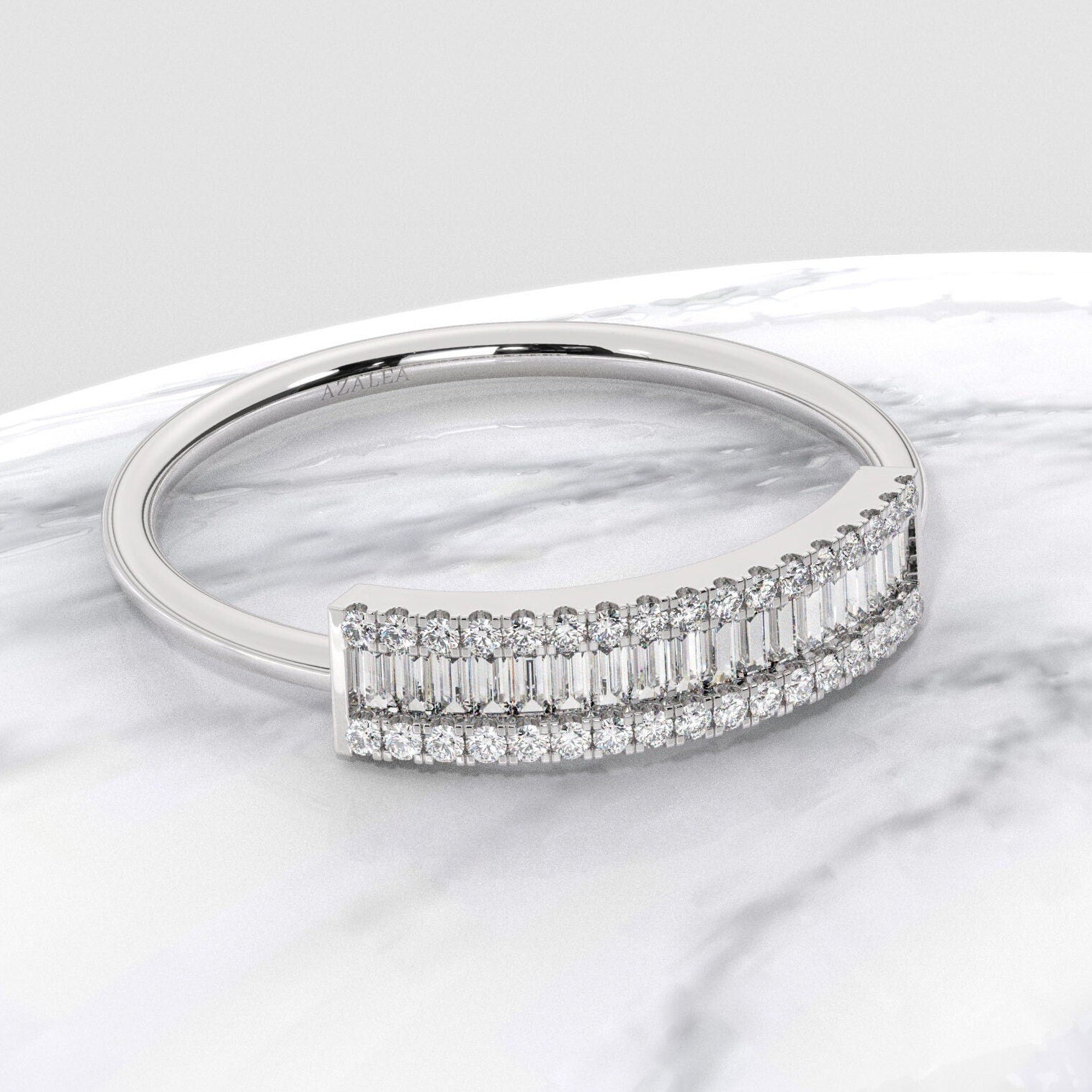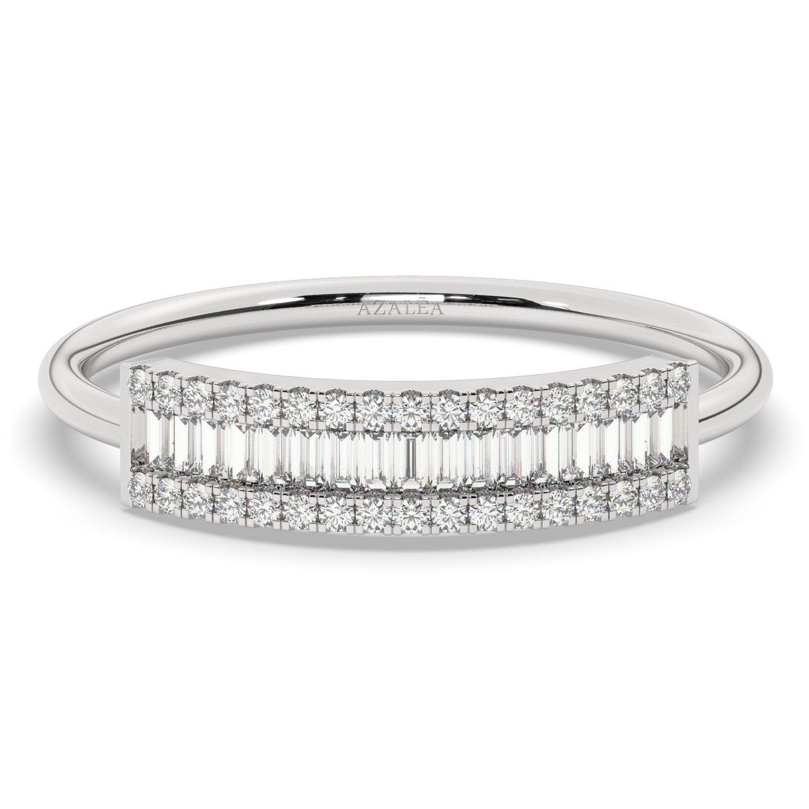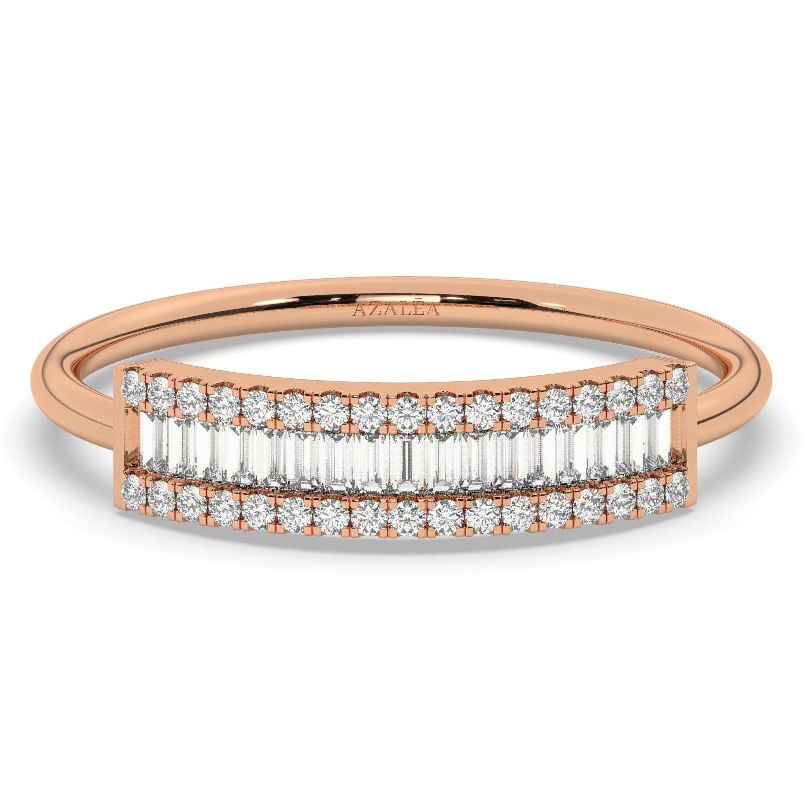 This .17ct vertical petite baguette diamond wedding band is surrounded by round .10ct diamonds. Can be worn as a stacking piece, or as a great alternative wedding band.