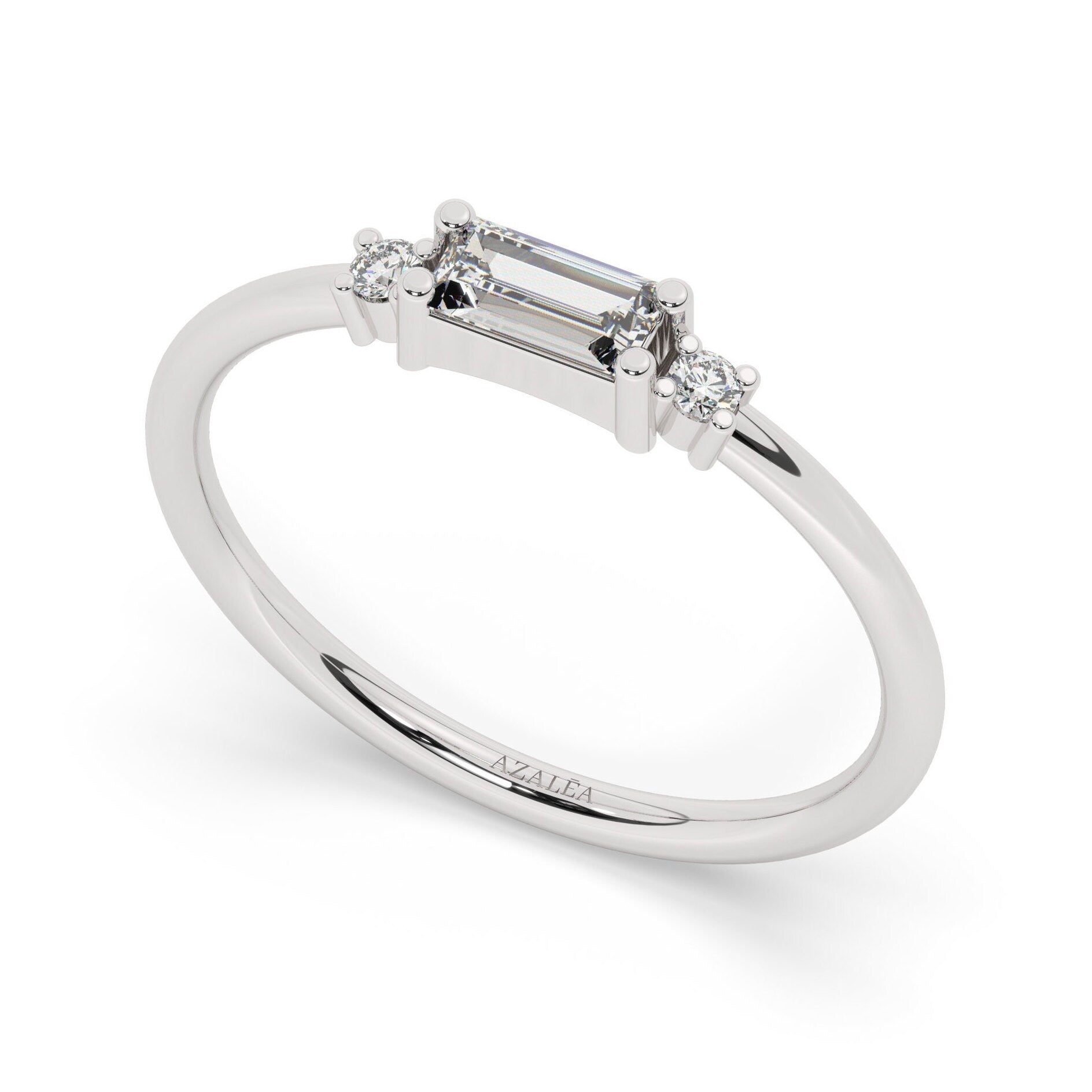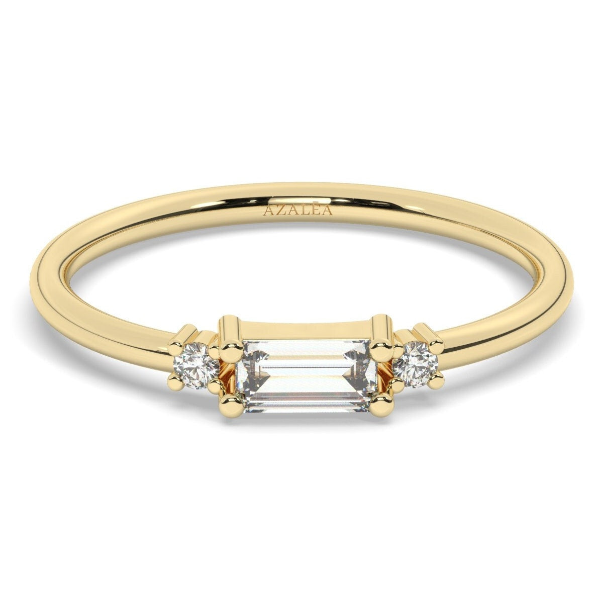 Enhance your jewelry collection with our elegant diamond ring featuring a single baguette diamond and two round diamonds. Perfect as a solo piece, this ring also complements stacking rings for a trendy and versatile look. Crafted with care and attention to detail, it exudes timeless beauty.