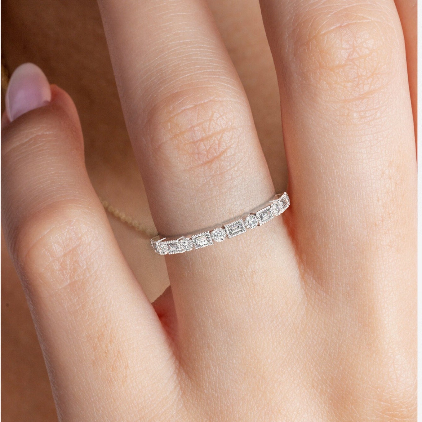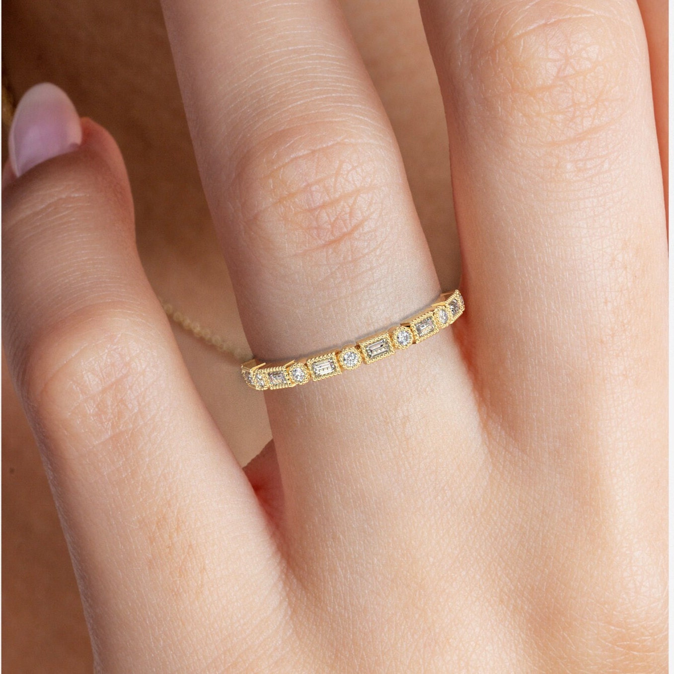 This 14k gold baguette diamond stacking ring has a milgrain accent with alternating baguettes and round diamonds sitting halfway on the band. You can wear it alone or as a stacking ring.